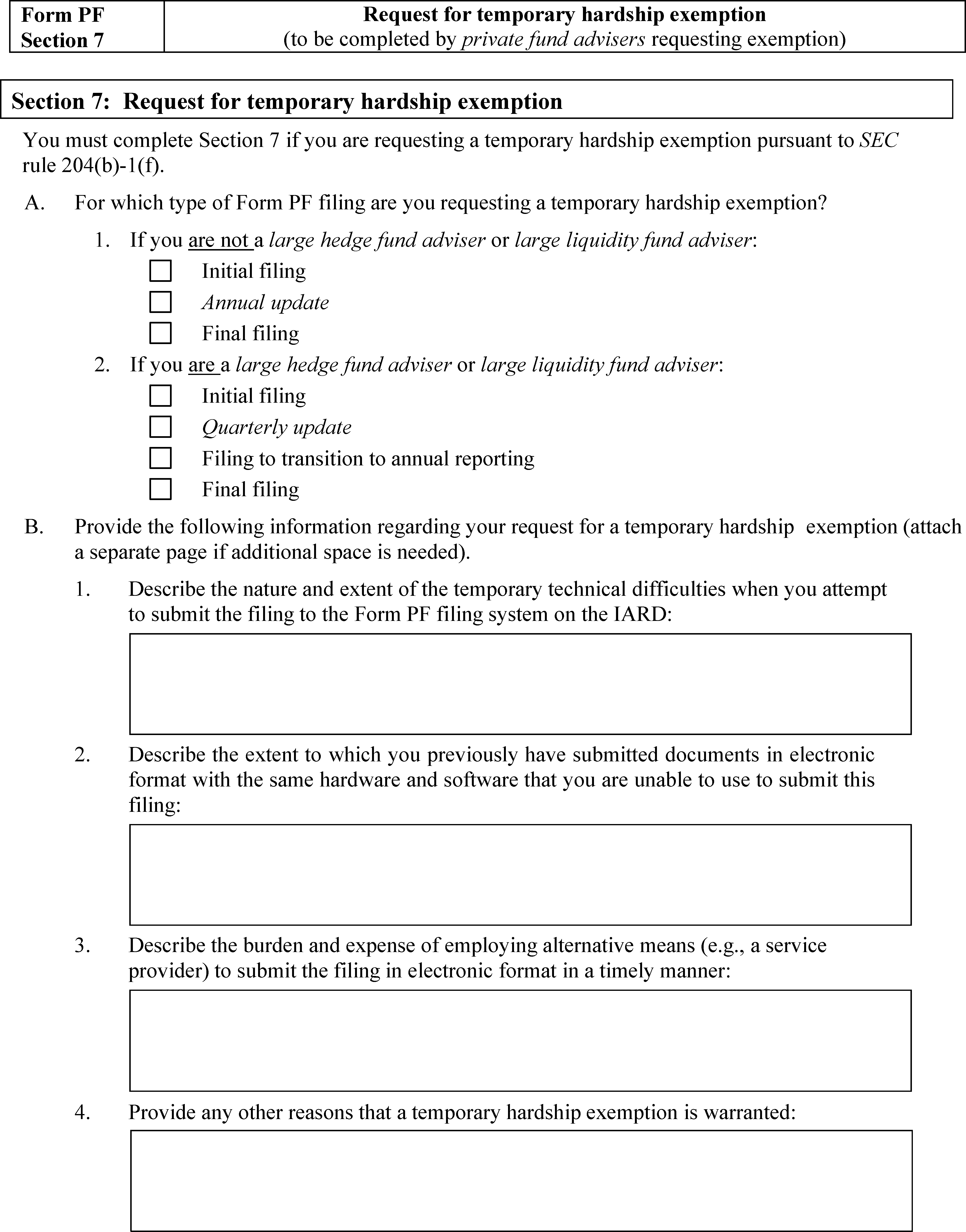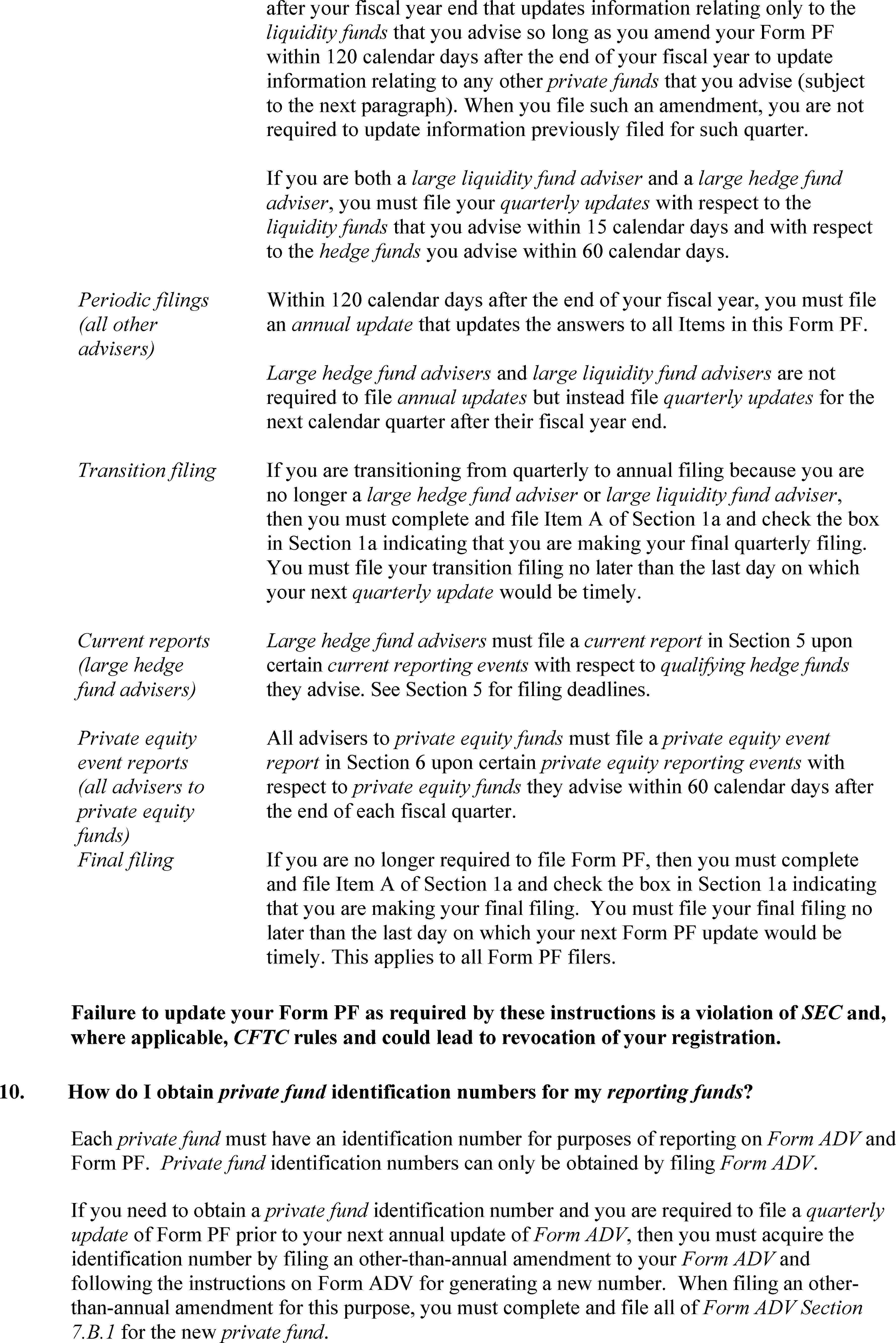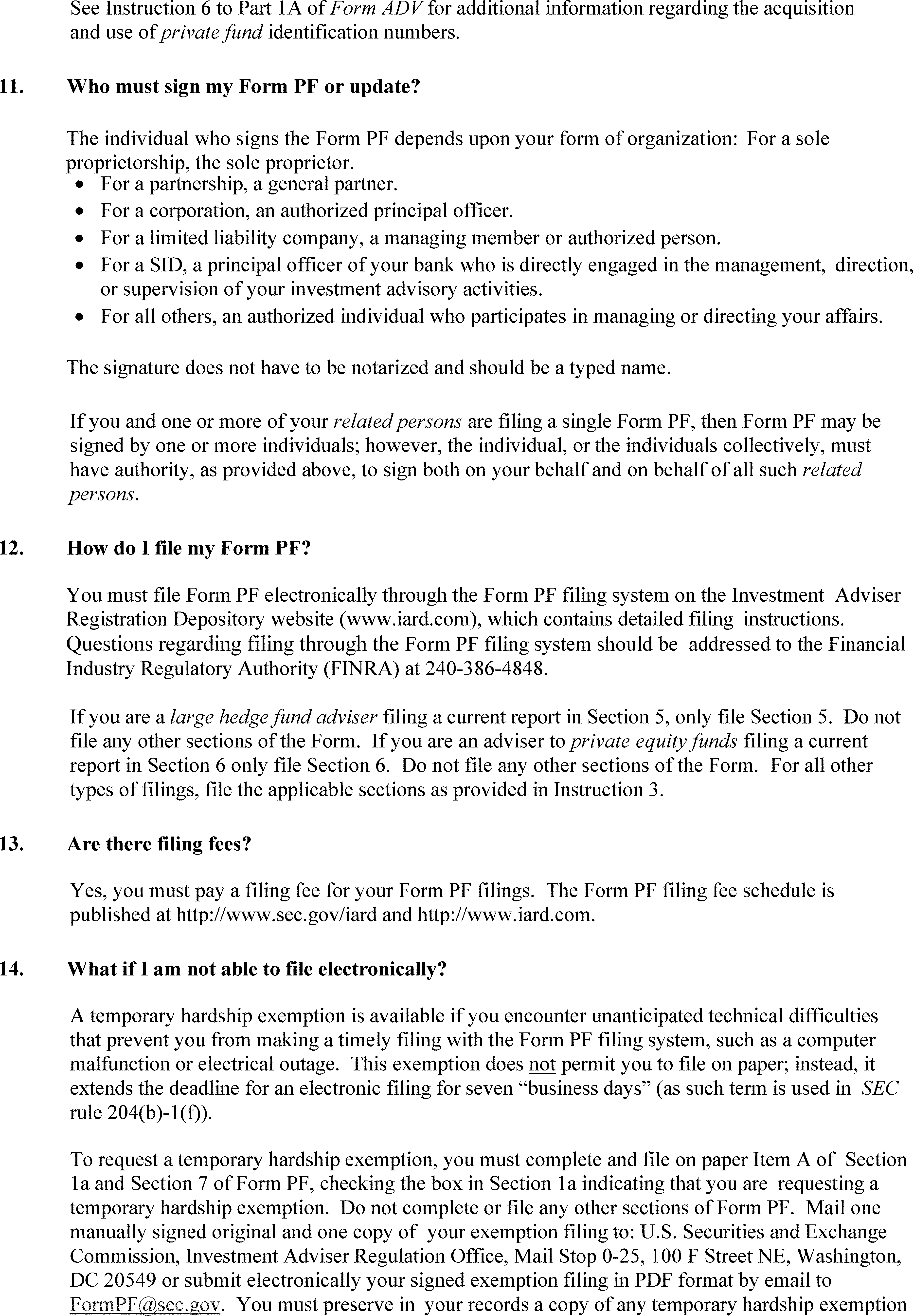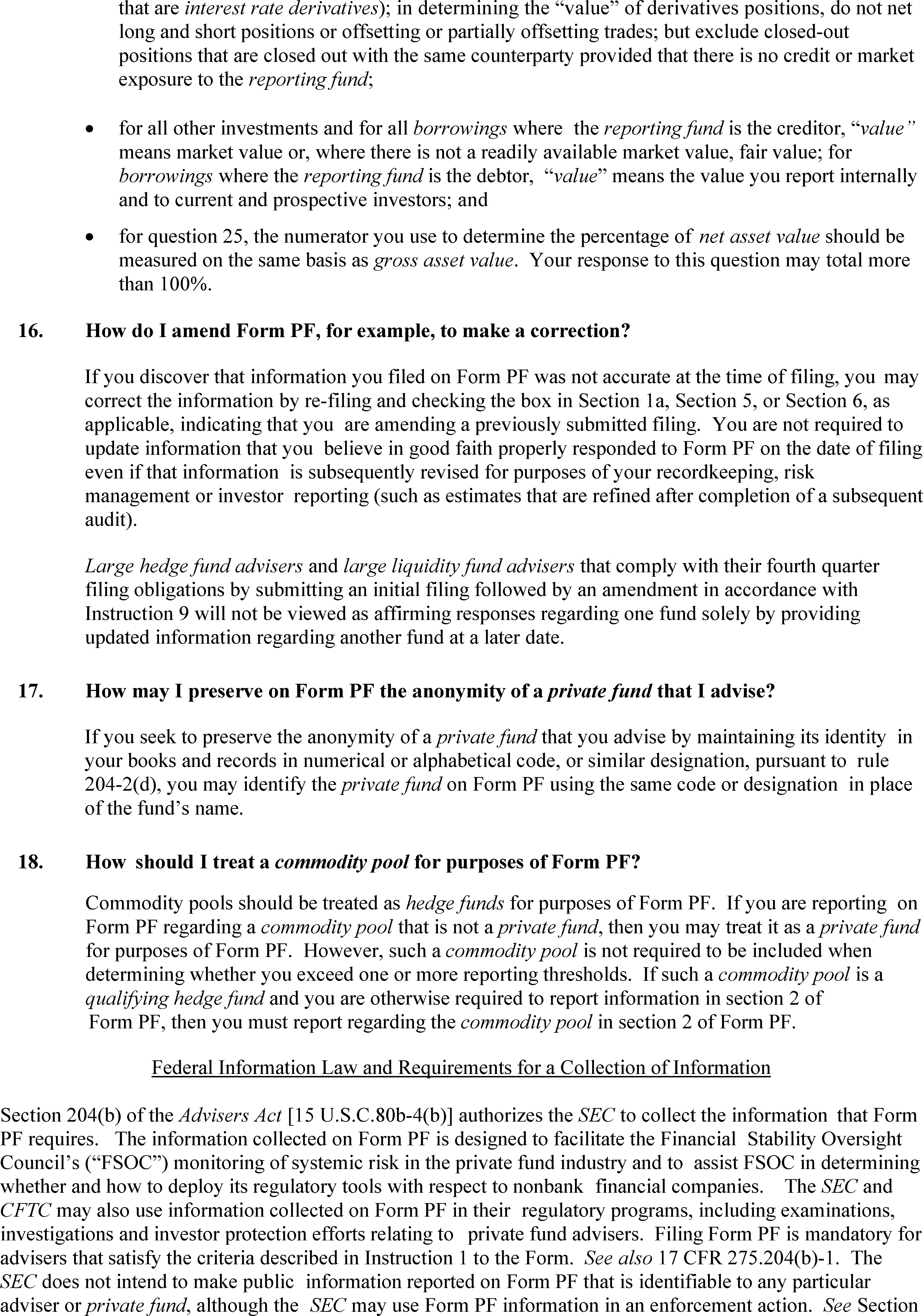 The Commodity Futures Trading Commission (“CFTC”) and the Securities and Exchange Commission (“SEC”) (collectively, “we” or “Commissions”) are adopting amendments to Form PF, the confidential reporting form for certain SEC-registered investment advisers to private funds, including those that also are registered with the CFTC as a commodity pool operator (“CPO”) or commodity trading adviser (“CTA”). The amendments are designed to enhance the Financial Stability Oversight Council's (“FSOC's”) ability to monitor systemic risk as well as bolster the SEC's regulatory oversight of private fund advisers and investor protection efforts. In connection with the amendments to Form PF, the SEC is amending a rule under the Investment Advisers Act of 1940 (“Advisers Act”) to revise instructions for requesting a temporary hardship exemption.