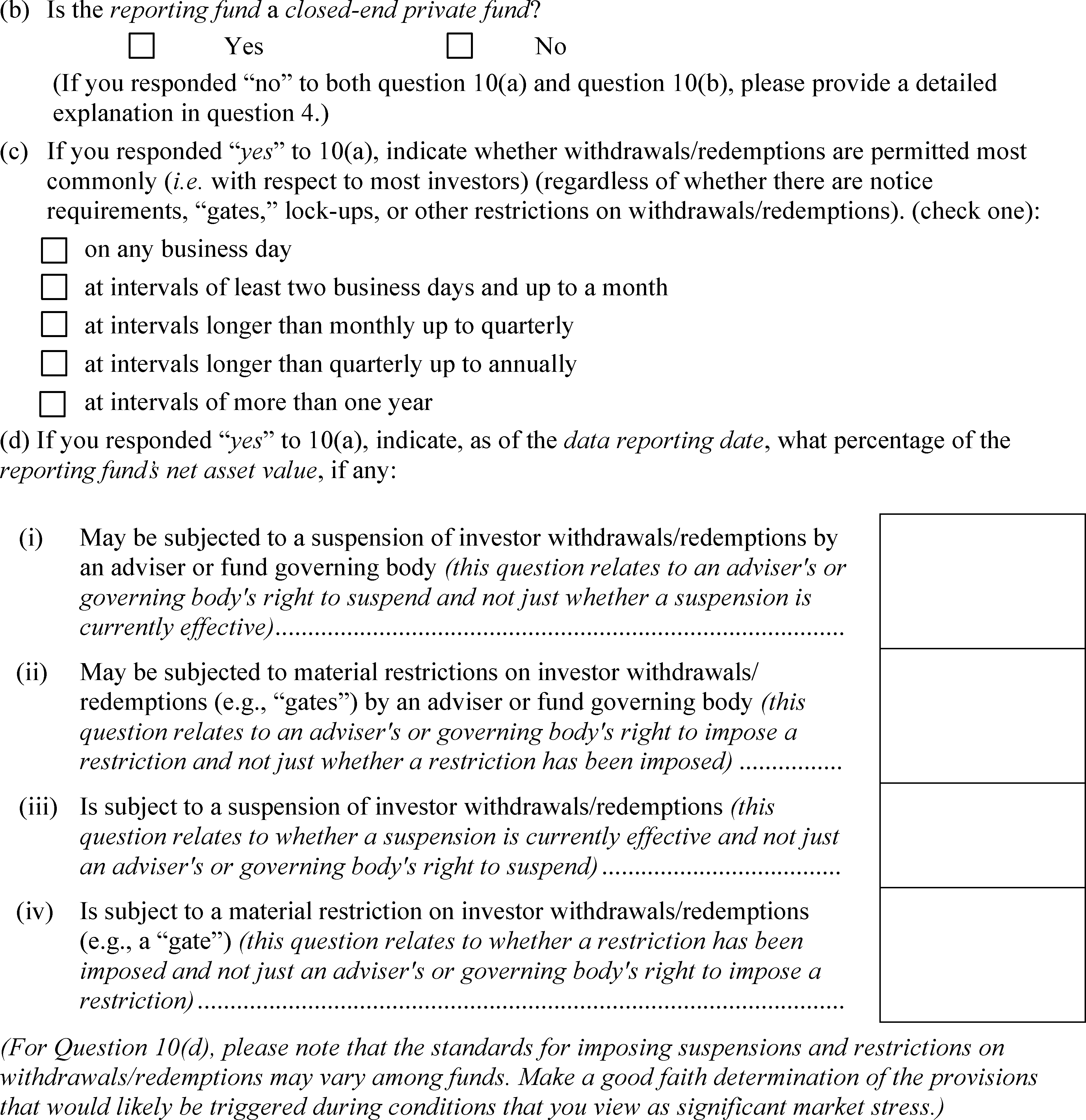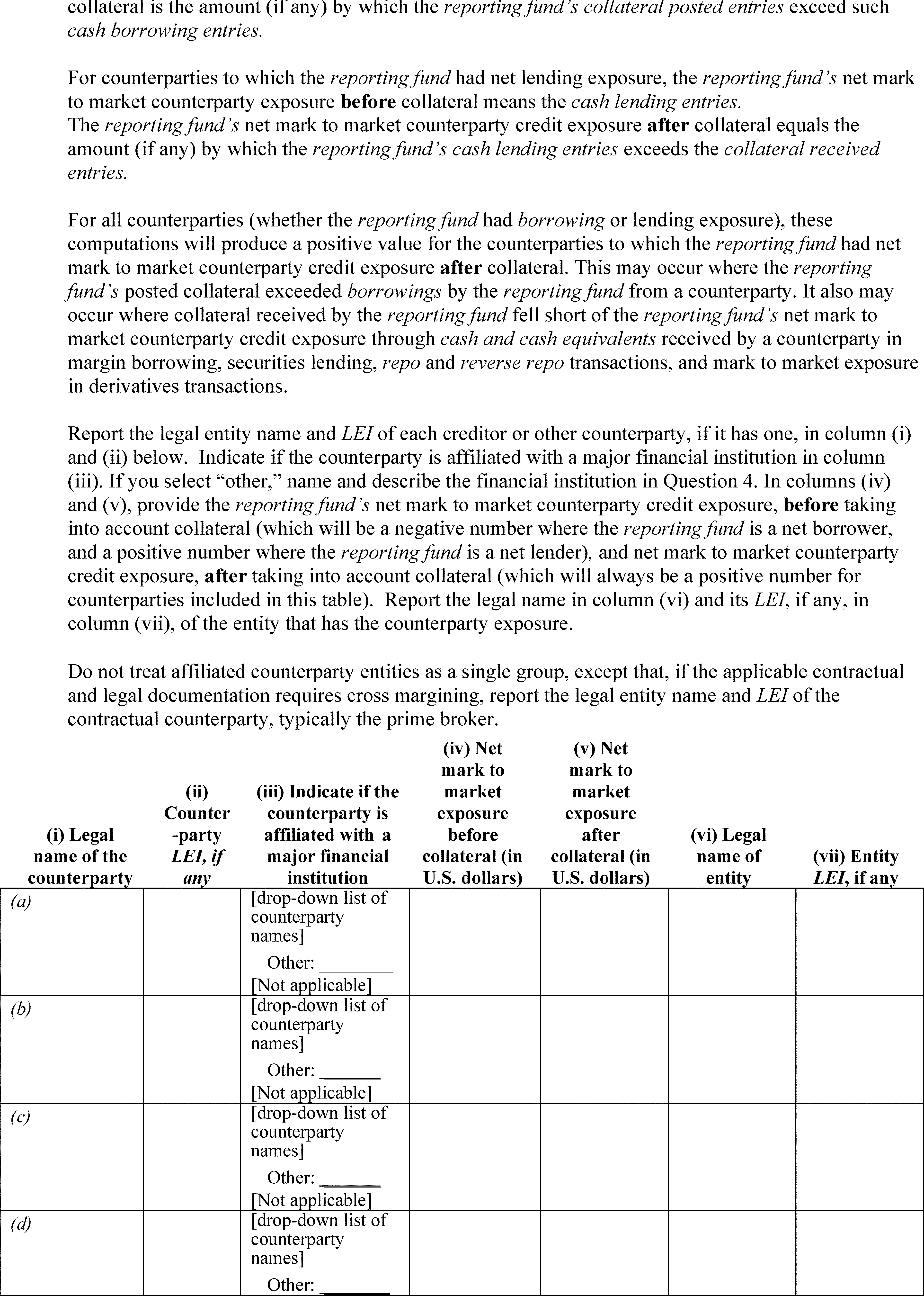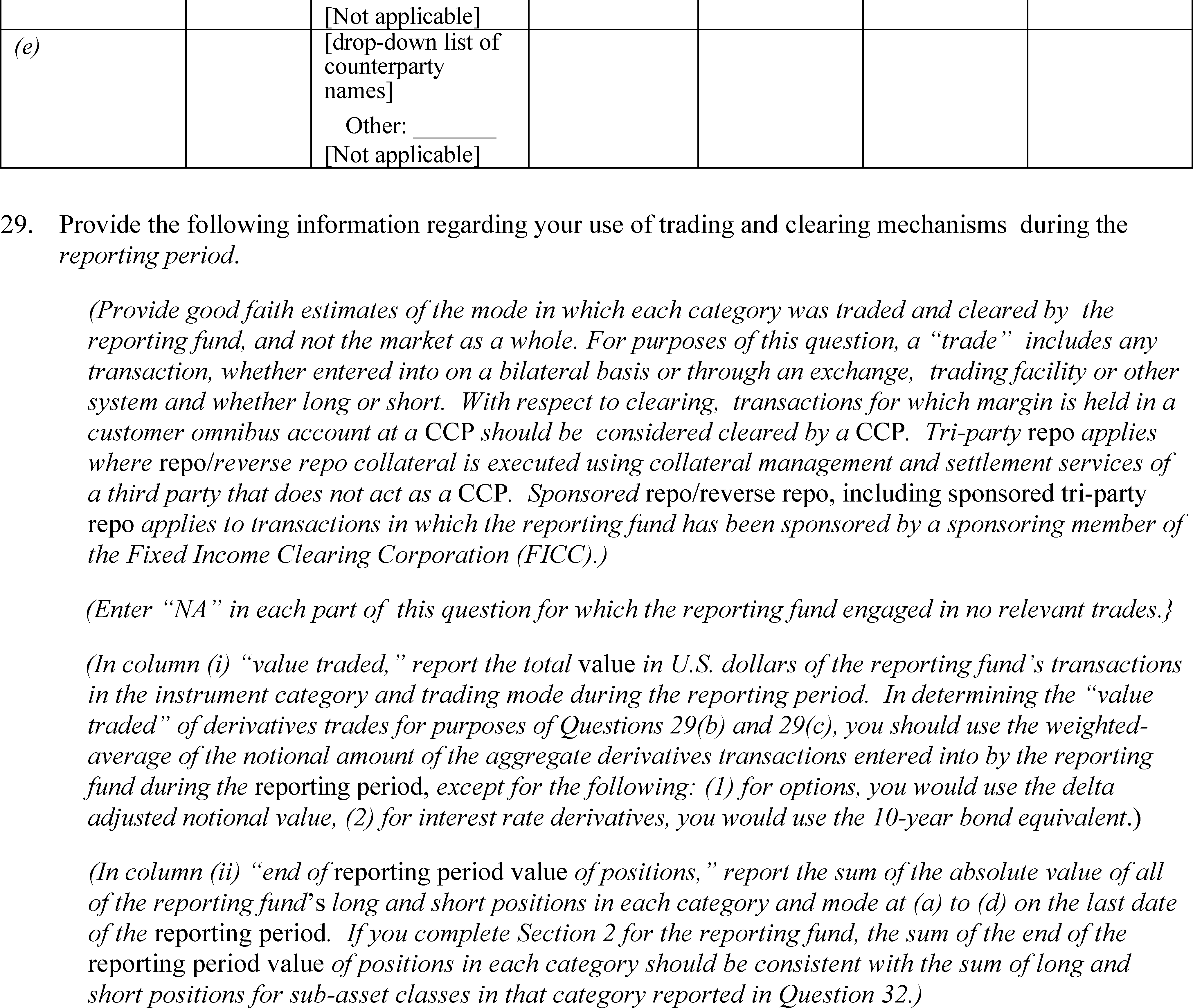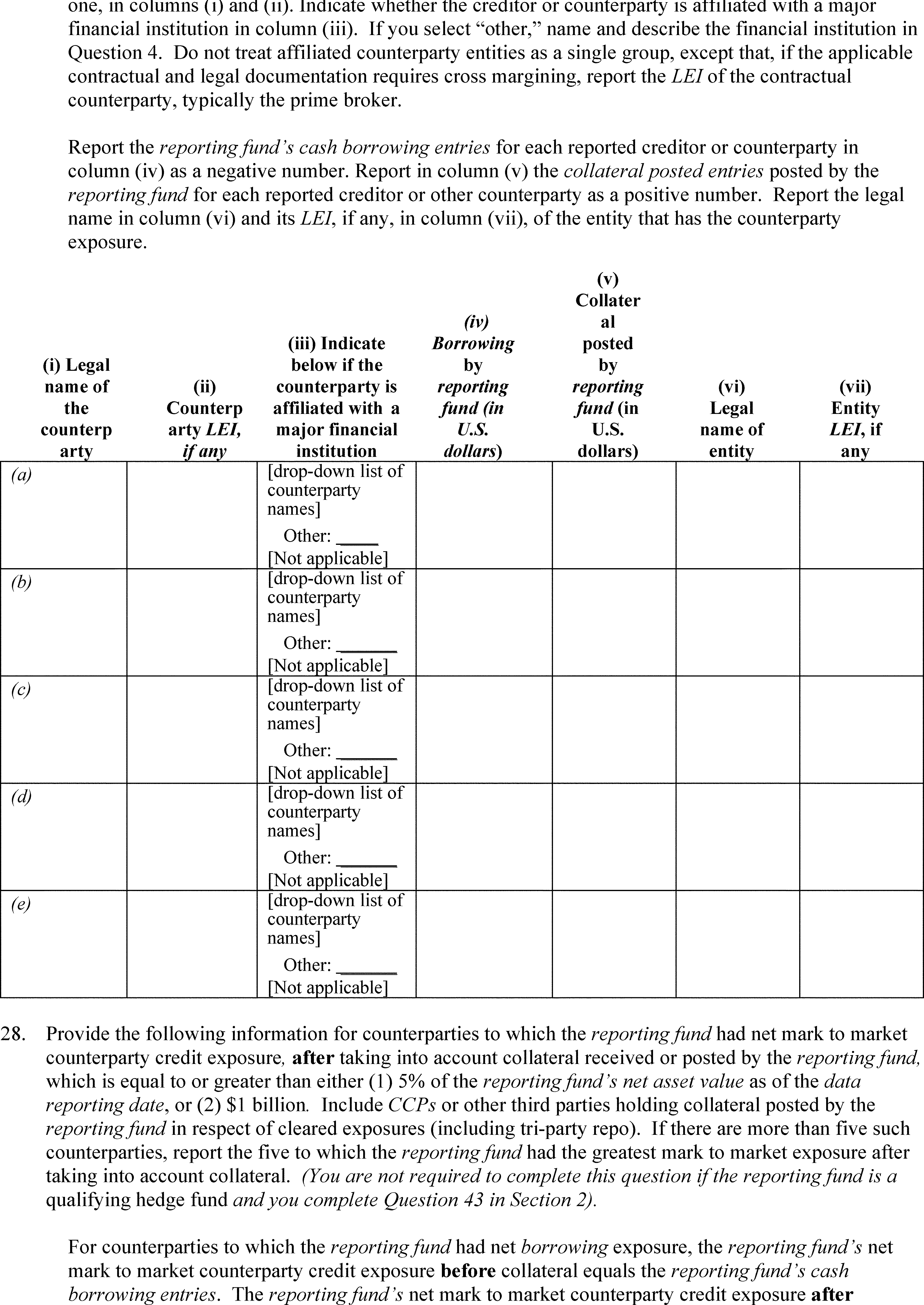 Other revisions that will provide this benefit include the reporting of withdrawal and redemption rights; reporting of other inflows and outflows; more granular reporting of hedge fund strategies; more granular reporting of hedge fund counterparty exposures including identification of counterparties representing a fund's greatest exposure; and more granular reporting of hedge fund trading and clearing mechanisms.