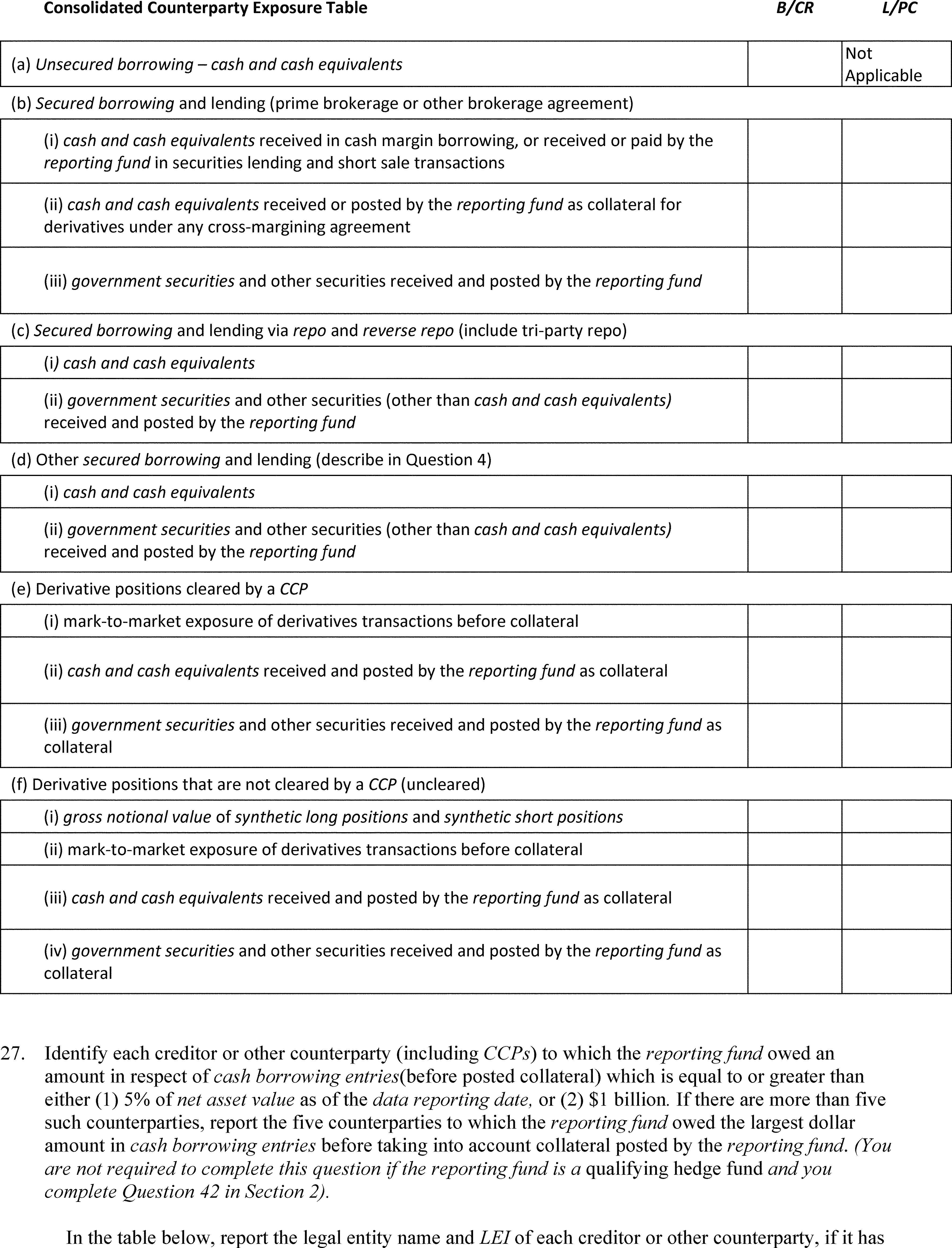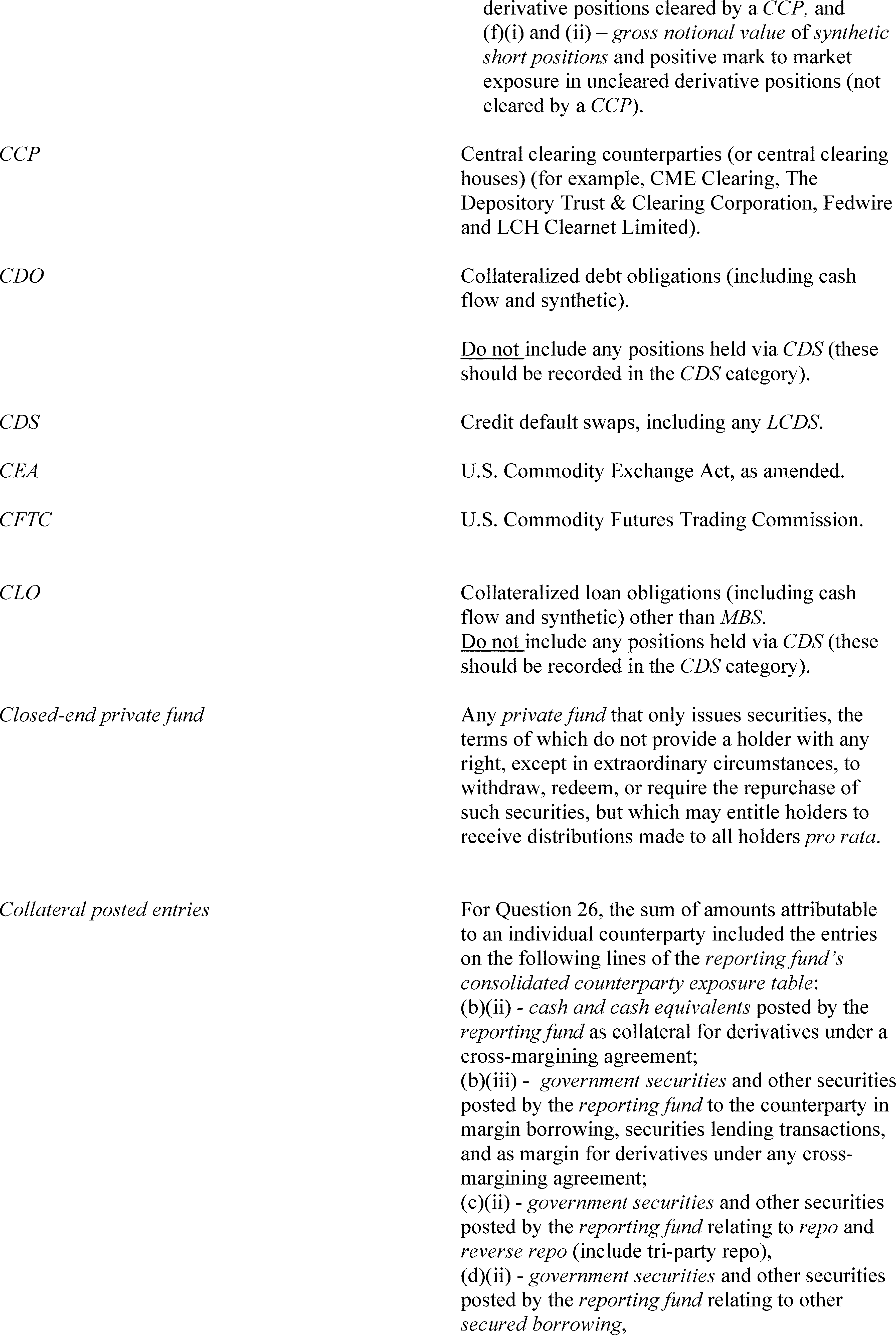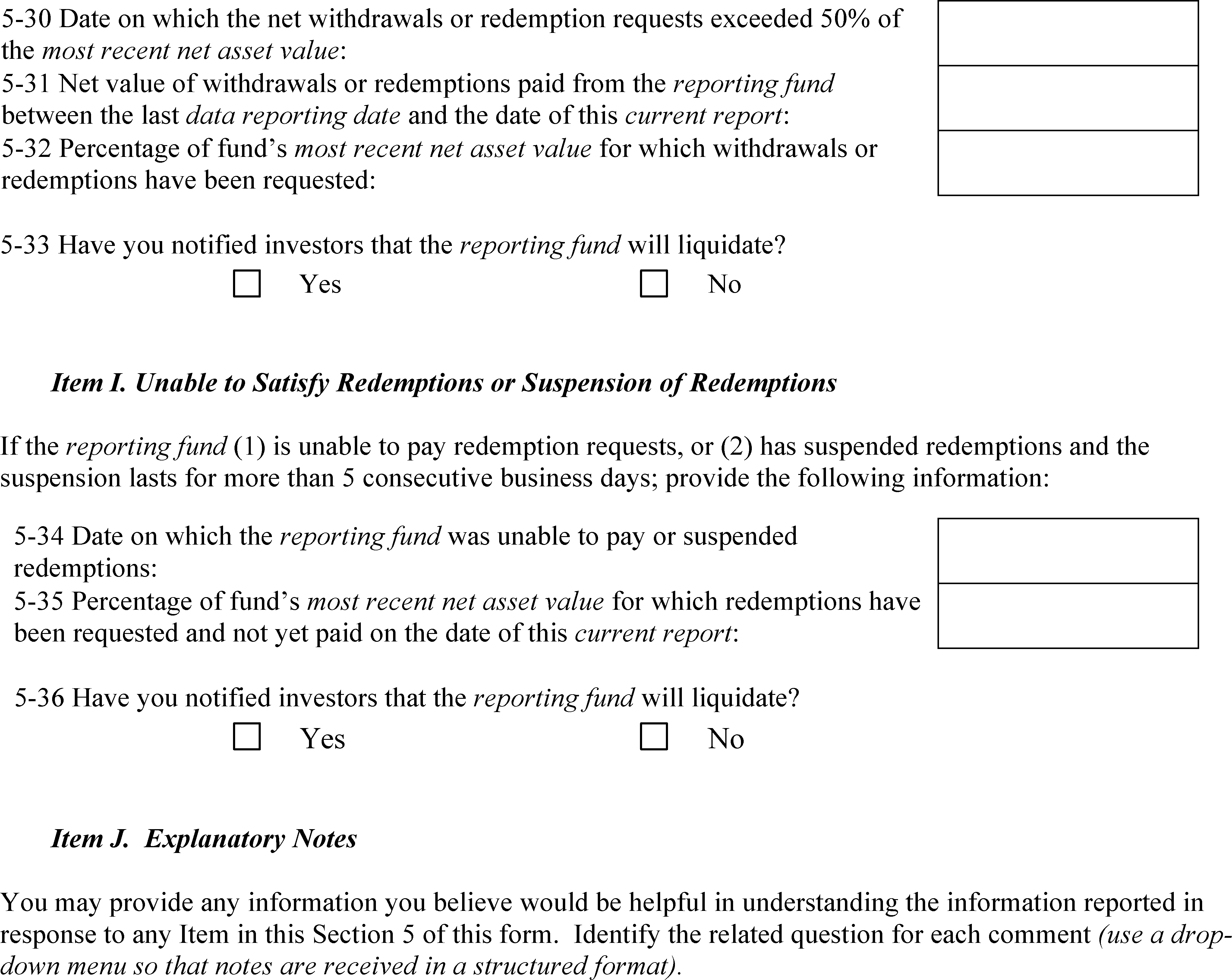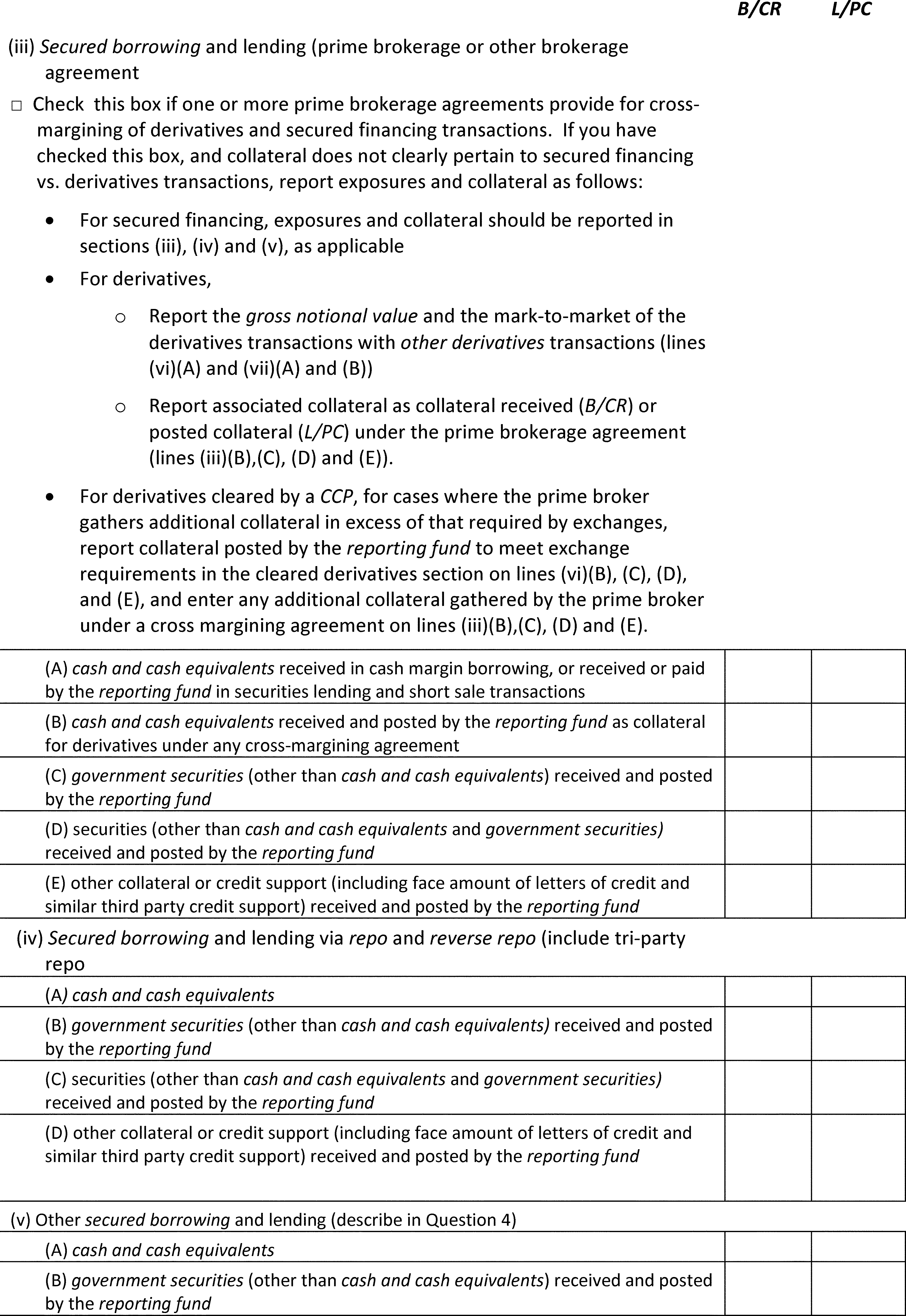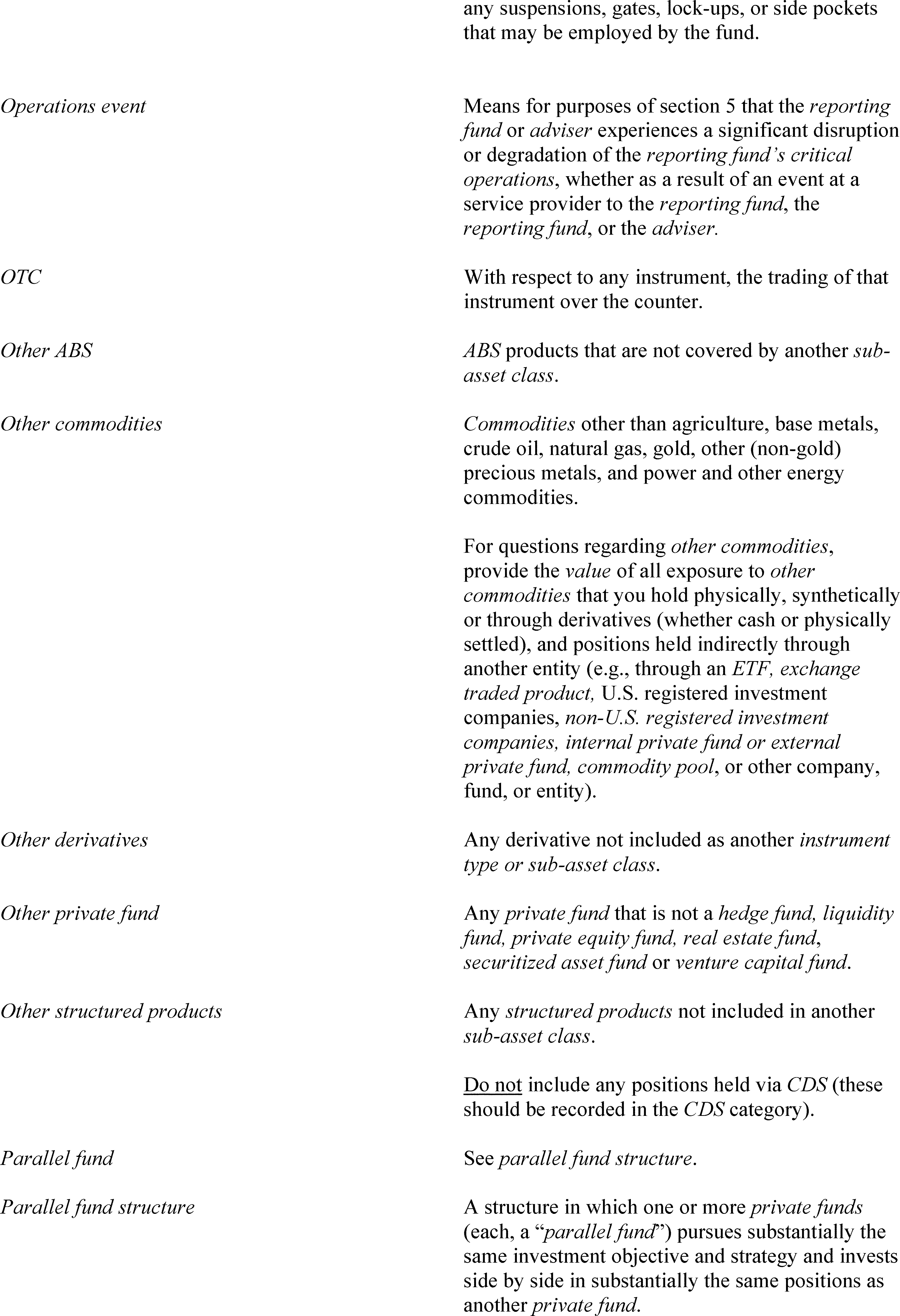 Other revisions that will provide this benefit include the reporting of withdrawal and redemption rights; reporting of other inflows and outflows; more granular reporting of hedge fund strategies; more granular reporting of hedge fund counterparty exposures including identification of counterparties representing a fund's greatest exposure; and more granular reporting of hedge fund trading and clearing mechanisms.