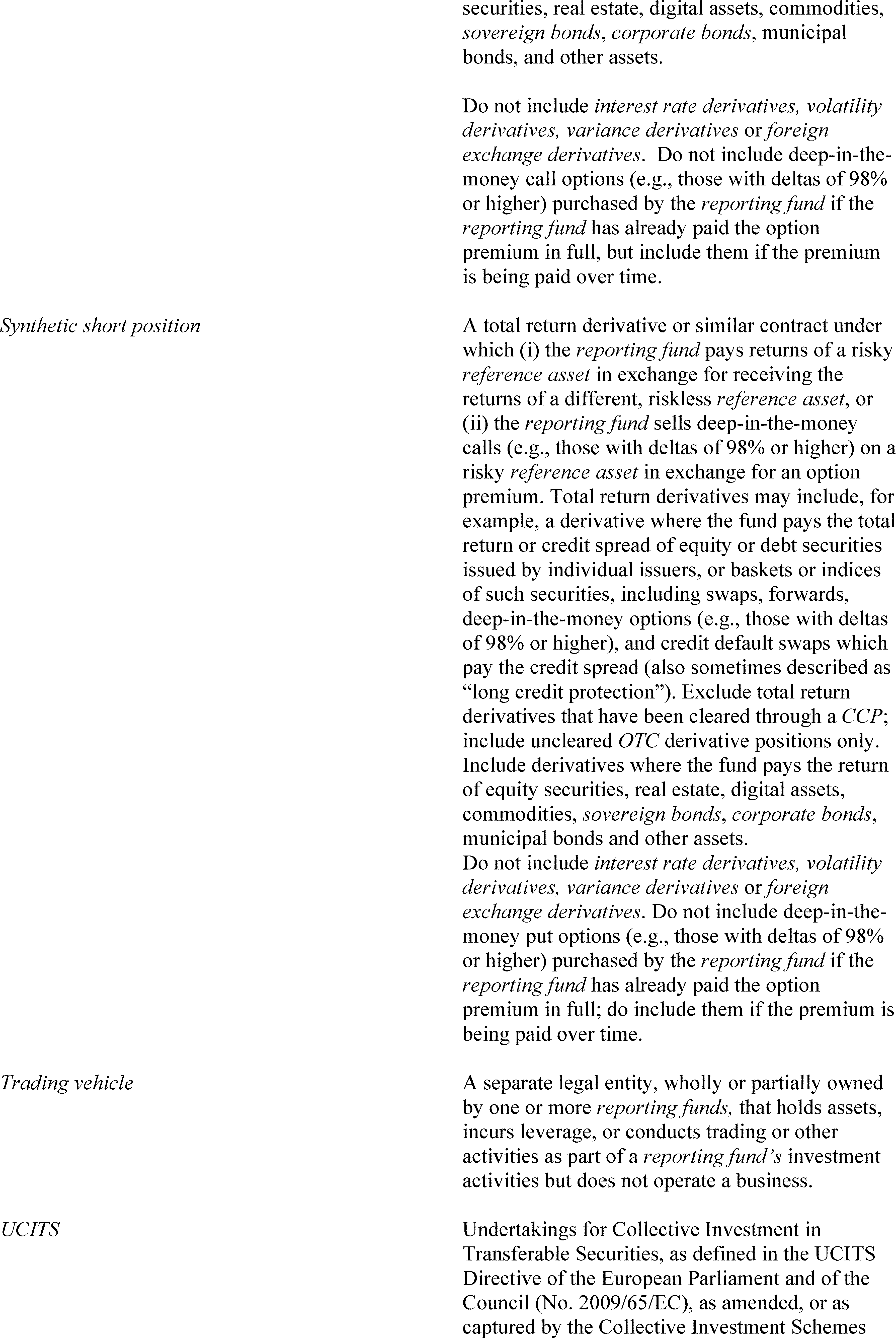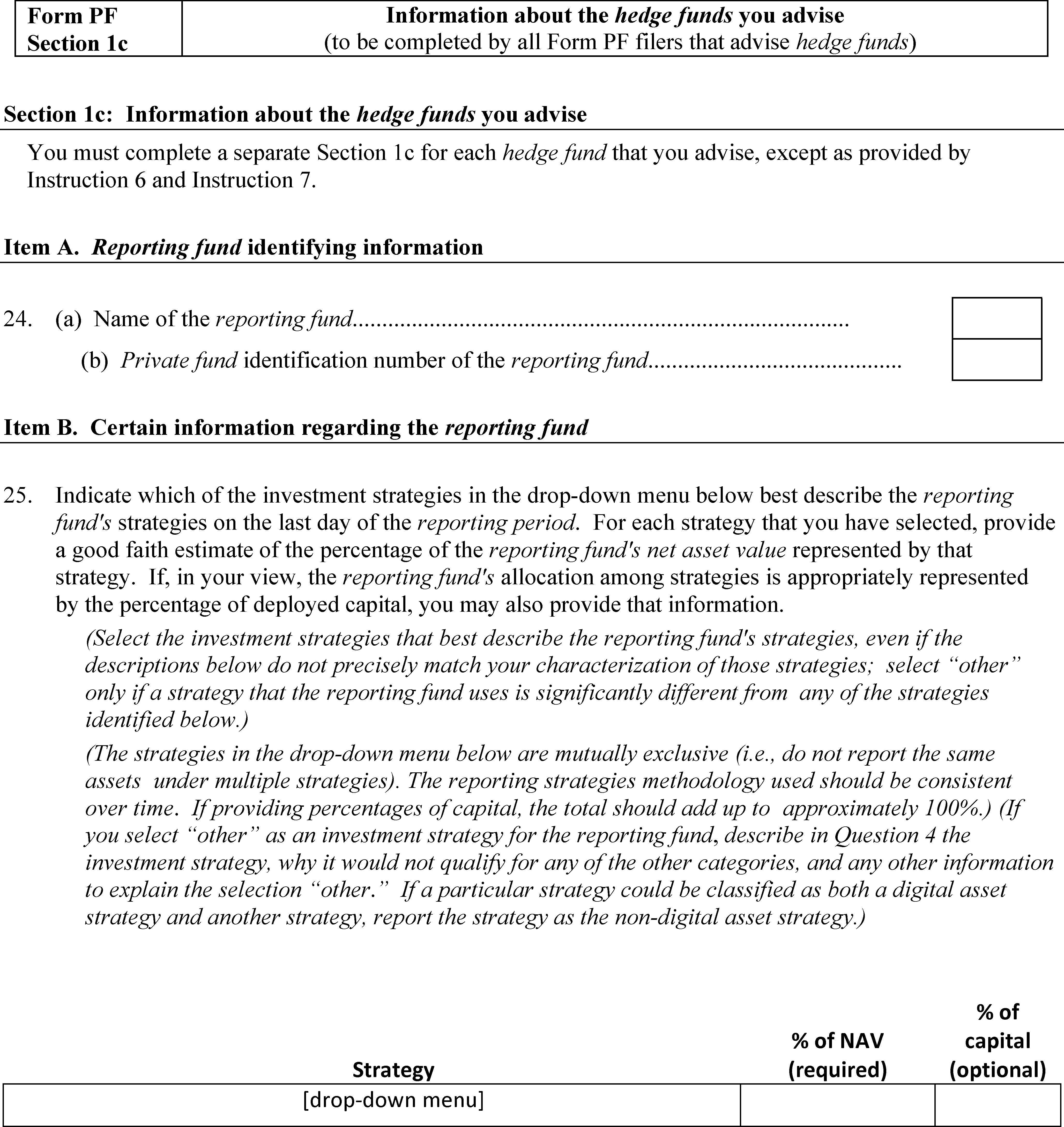 Third, we are adopting amendments to section 1c of Form PF, which applies to private fund advisers that advise hedge funds. We are adopting, largely as proposed, amendments to require advisers to hedge funds to report certain additional information. As proposed, we are adopting amendments to require advisers to hedge funds to report on the fund's use of digital assets as an investment strategy, but in a modification from the proposal, we are not adopting the proposed definition of digital assets. We are also adopting, as proposed, amendments to remove certain questions to streamline reporting and to reduce reporting burdens.