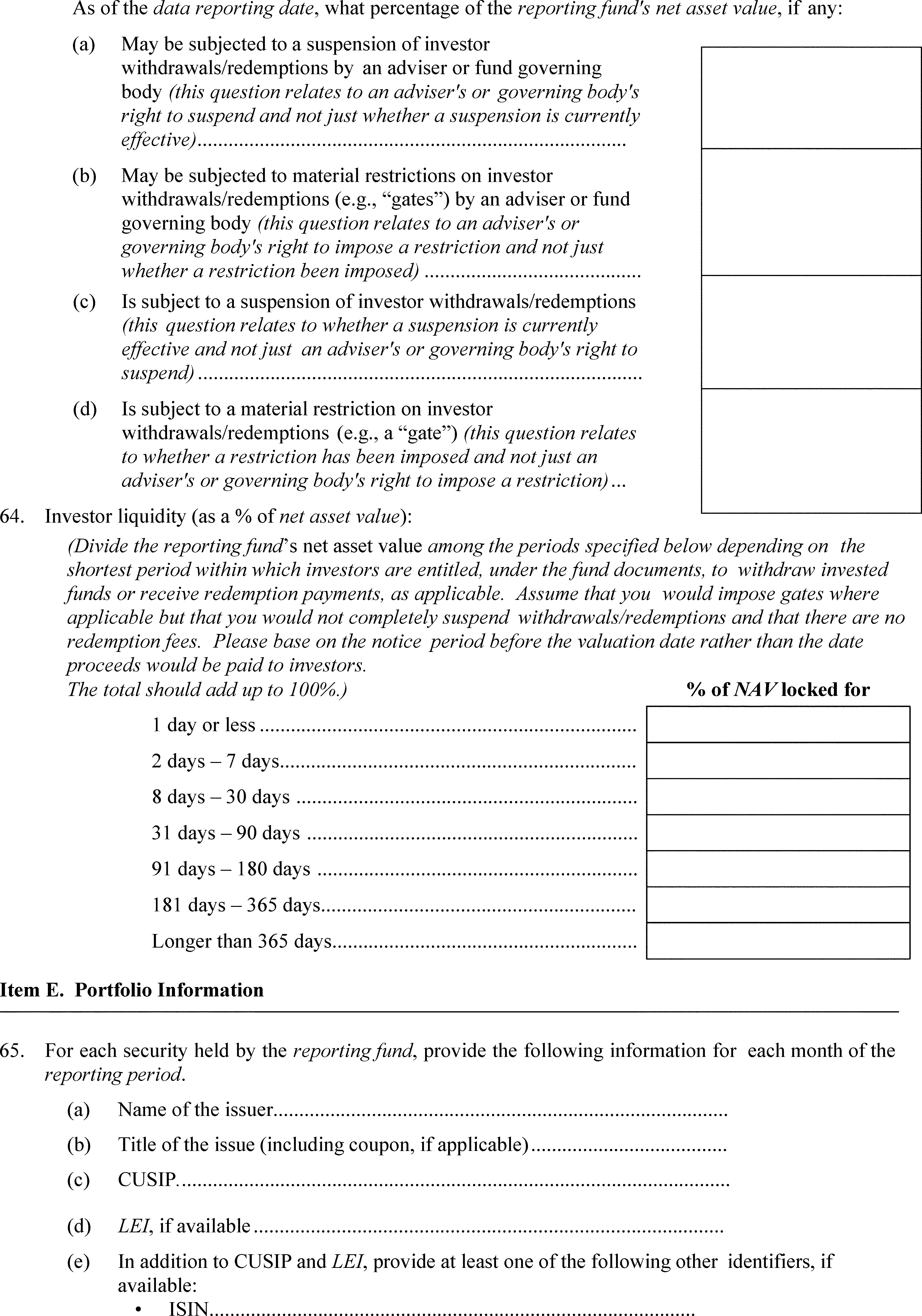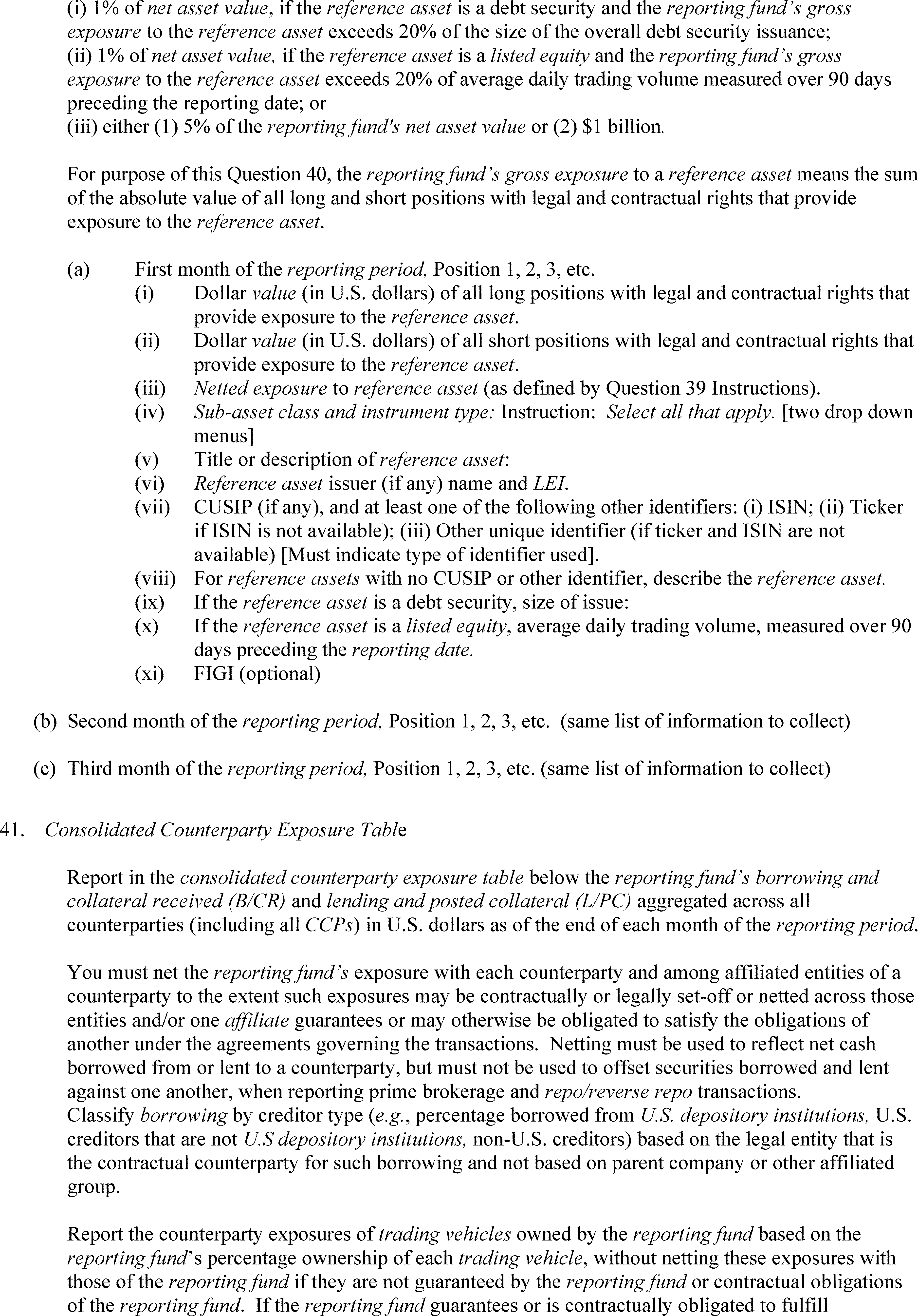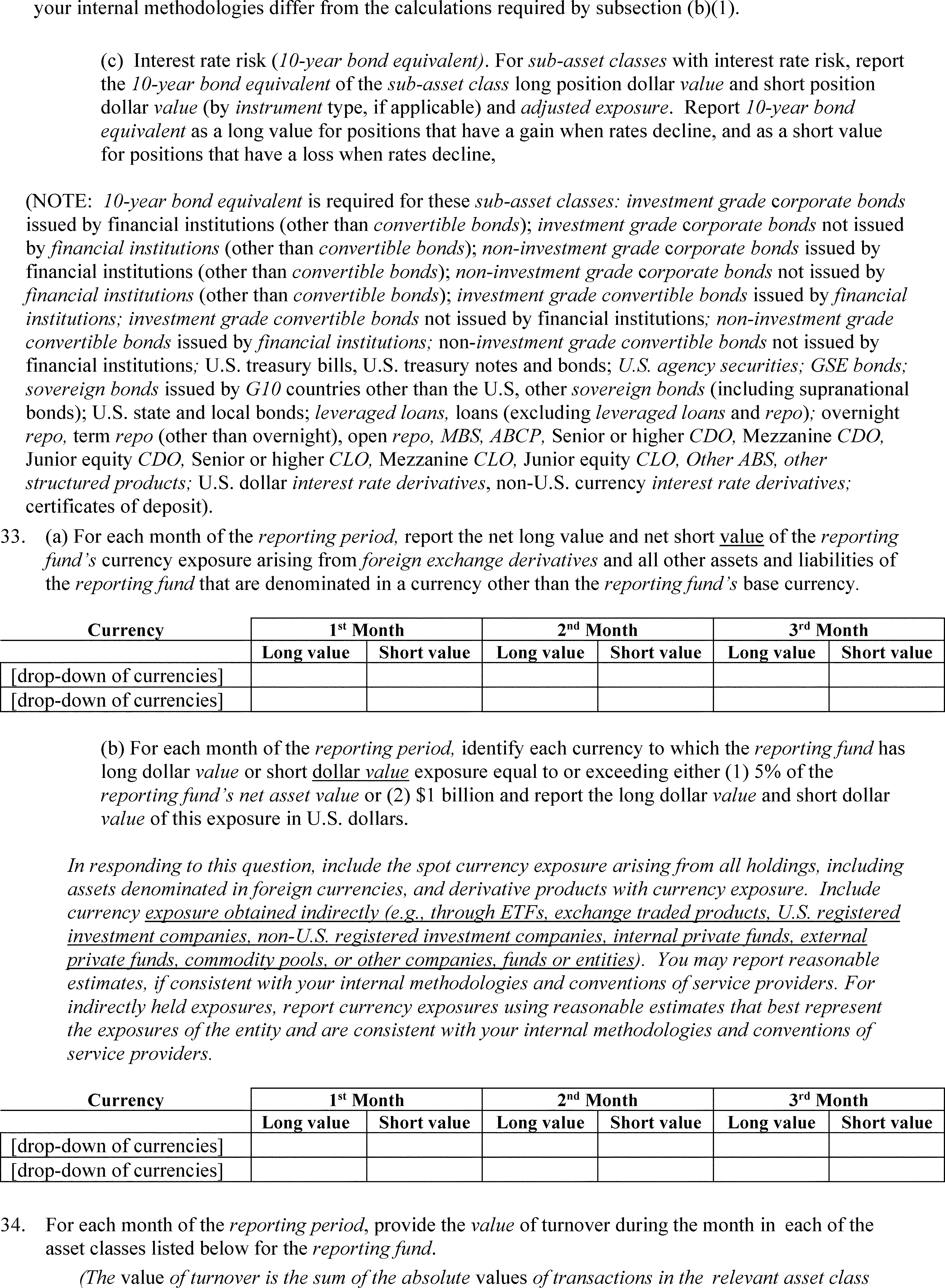 Other revisions that will provide this benefit include the amendments revising reporting of reportable sub-asset classes, including those for certain categories of listed equity securities, repos, asset-backed securities and other structured products, derivatives, and cash and commodities; revising reporting of open and large position reporting; revising reporting of counterparty exposures including reporting of significant counterparties; revising currency reporting; requiring significant country and industry exposure; requiring additional reporting on fund portfolio risk profiles; requiring more granular reporting of investment performance by strategy; amending reporting of portfolio liquidity; and amending reporting of financing liquidity.