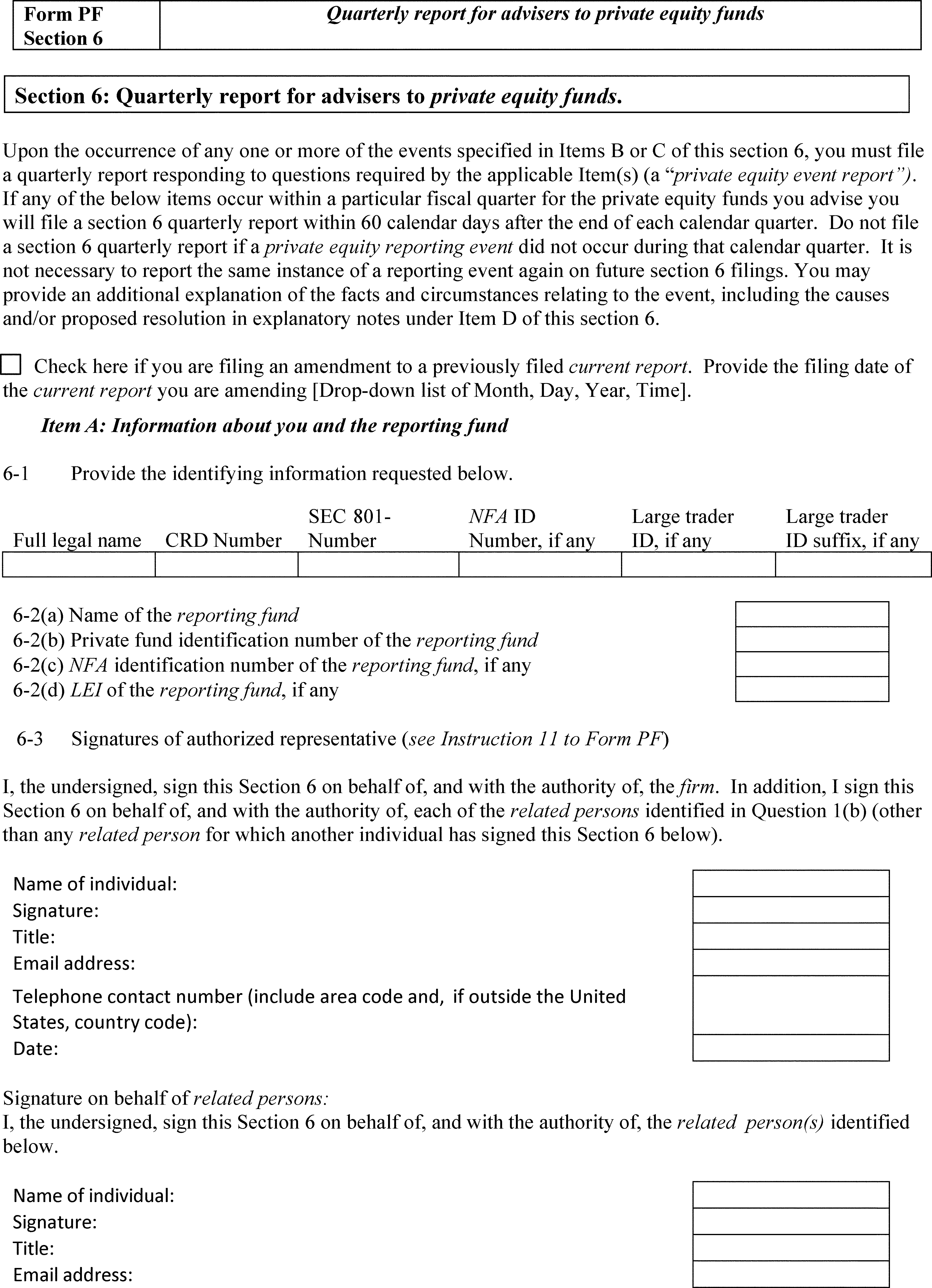 Large hedge fund advisers to qualifying hedge funds also file current reports as soon as practicable, but no later than 72 hours from the occurrence of certain reporting events, as provided for in Form PF section 5. Private equity fund advisers also file private equity event reports within 60 days from fiscal quarter end upon the occurrence of certain reporting reports, as provided for in Form PF section 6.