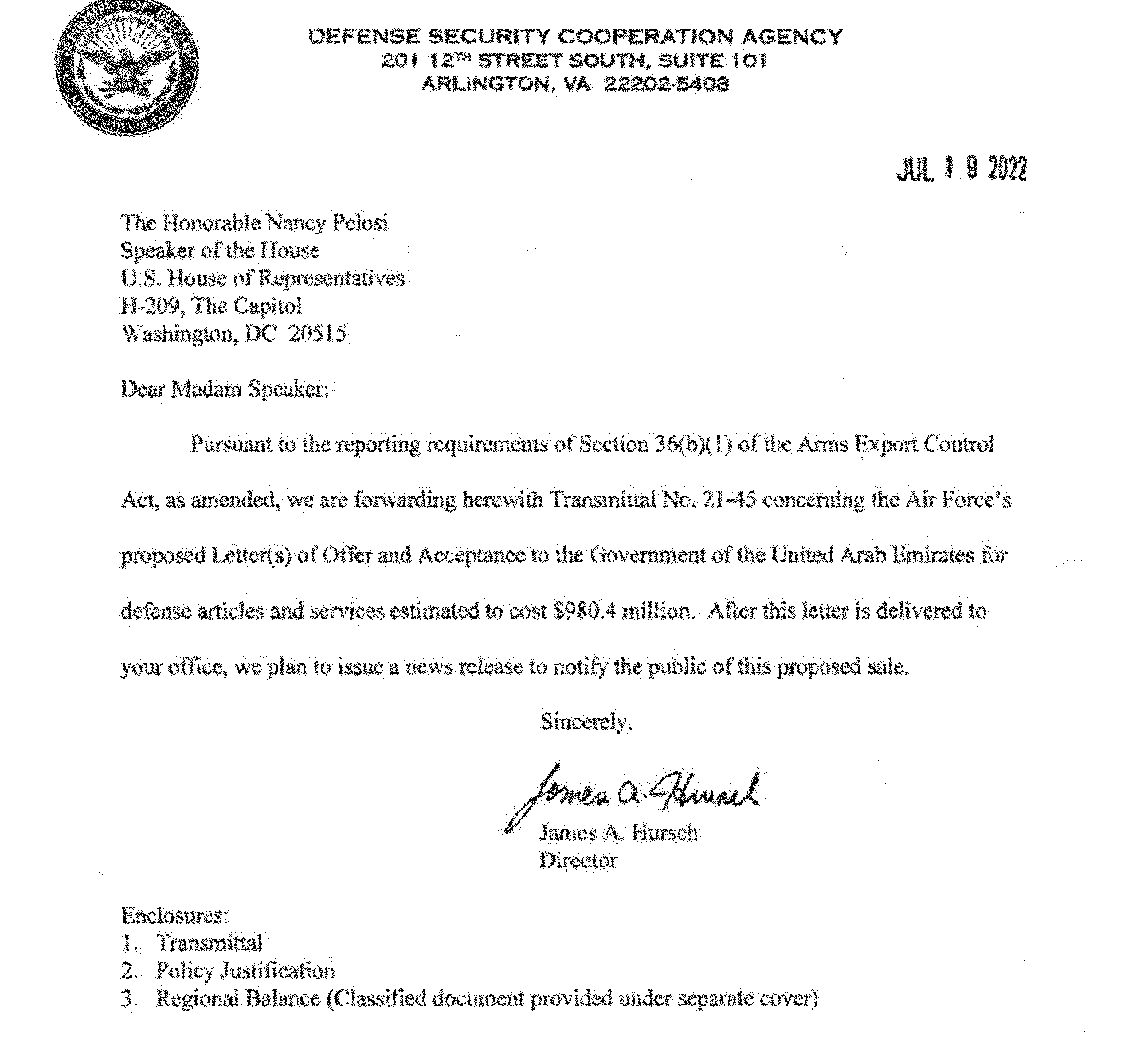 This 36(b)(1) arms sales notification is published to fulfill the requirements of section 155 of Public Law 104-164 dated July 21, 1996. The following is a copy of a letter to the Speaker of the House of Representatives, Transmittal 21-45 with attached Policy Justification.