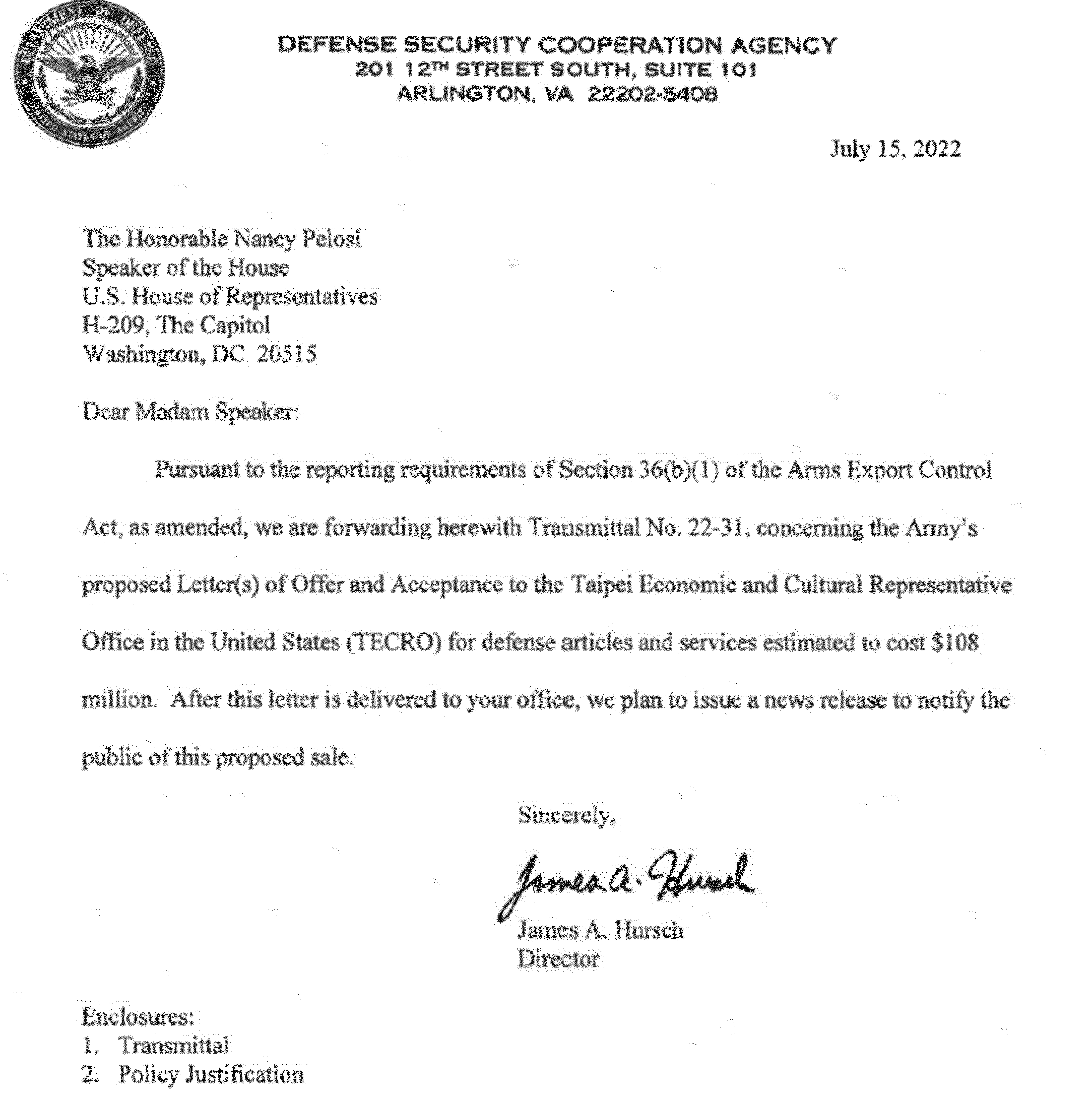 This 36(b)(1) arms sales notification is published to fulfill the requirements of section 155 of Public Law 104-164 dated July 21, 1996. The following is a copy of a letter to the Speaker of the House of Representatives, Transmittal 22-31 with attached Policy Justification.