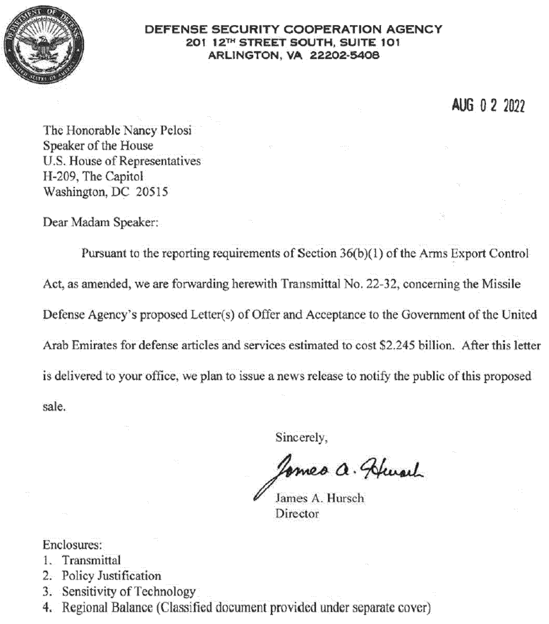 This 36(b)(1) arms sales notification is published to fulfill the requirements of section 155 of Public Law 104-164 dated July 21, 1996. The following is a copy of a letter to the Speaker of the House of Representatives, Transmittal 22-32 with attached Policy Justification and Sensitivity of Technology.