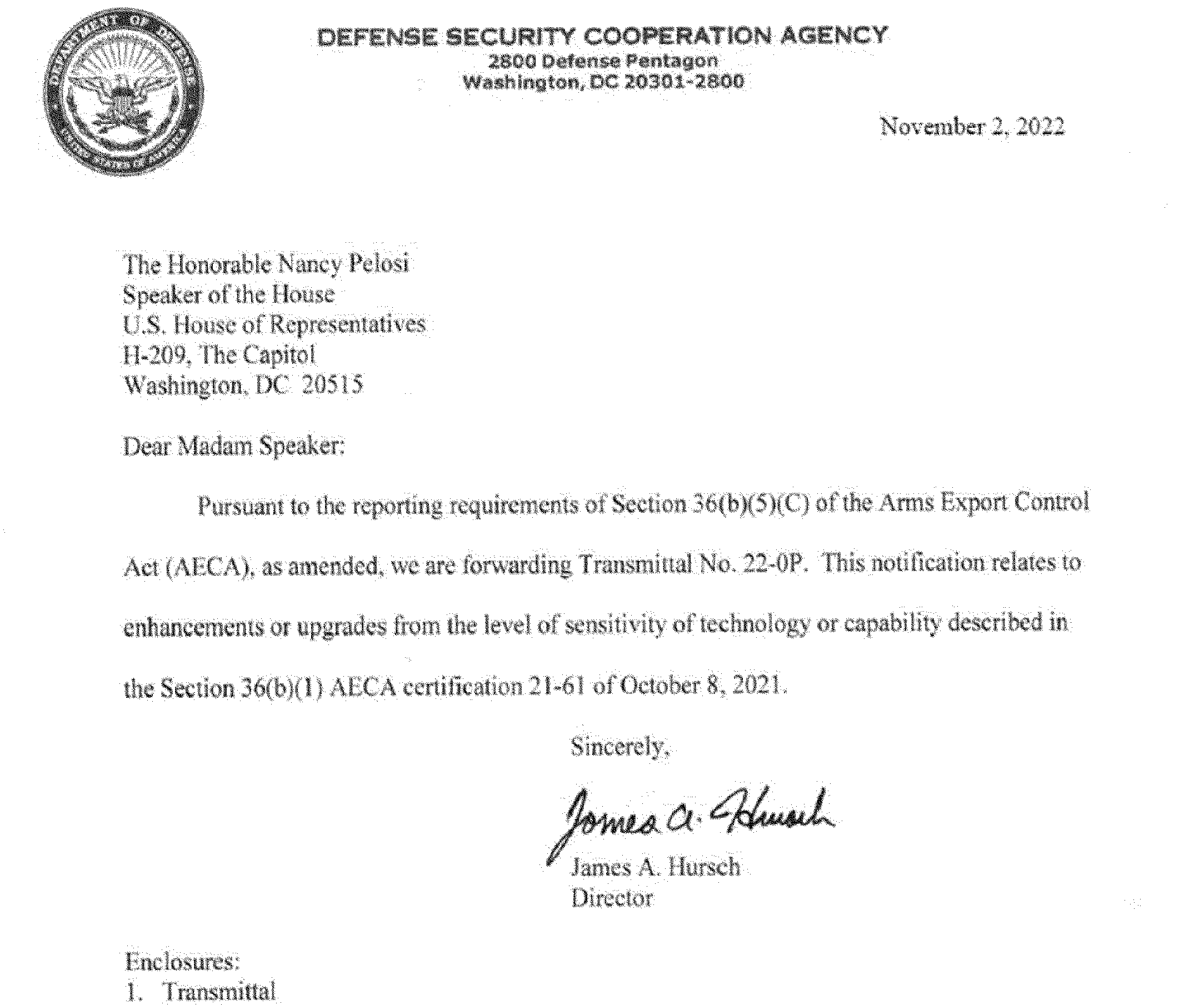 On October 8, 2021, Congress was notified by Congressional certification transmittal number 21-61, of the possible sale, under Section 36(b)(1) of the Arms Export Control Act, of twelve (12) MH-60R Multi-Mission helicopters; thirty (30) T-700-GE-401C engines (24 installed, 6 spares); twelve (12) APS-153(V) Multi-Mode Radars (installed); twelve (12) AN/AAS-44C(V) Multi-Spectral Targeting Systems (installed); thirty-four (34) Embedded Global Positioning System/Precise Positioning Service (GPS/PPS)/Inertial Navigation Systems (EGI) with Selective Availability/Anti-Spoofing Module (SAASM) (24 installed, 10 spares); twenty (20) Link 16 Multifunctional Information Distribution Systems (MIDS)—Joint Tactical Radio System (JTRS) (12 installed, 8 spares); twelve (12) GAU-61 Digital Rocket Launchers (aircraft provisions only); twelve (12) Airborne Low Frequency Sonars (ALFS) (aircraft provisions only); eighteen (18) AN/AAR-47 Missile Warning Systems (12 installed, 6 spares); eighteen (18) AN/ALE-47 Chaff and Flare Dispenser, Electronic Countermeasures (12 installed, 6 spares); twelve (12) AN/ALQ-210 Electronic Support Measures (ESM) Systems (installed); twenty-four (24) M299 Missile Launchers; twelve (12) GAU-21 Crew Served Guns aircraft provisions (installed, includes aircraft adapter, ammunition bin, and other accessories); twelve (12) M240D Crew Served Gun Cradles (installed); and eighteen (18) AN/ARQ-59 Hawklink Radio Terminals (12 installed, 6 spares). Also included were AN/ARC-210 RT-2036 UHF/VHF radios with Communications Security (COMSEC); AN/APX-123 Identification Friend or Foe (IFF) transponders; KIV-78; KIV-6; KOV-21; KGV-135A; Advanced Data Transfer Systems (ADTS); Airborne Low Frequency Sonars (ALFS) Training Simulators/Operational Machine Interface Assistants (ATS OMIA); spare engine containers; trade studies with industry to determine the feasibility and cost of implementing provisions for additional passenger seating and modifications to achieve enhanced crew survivability; defense services; spare and repair parts; support and test