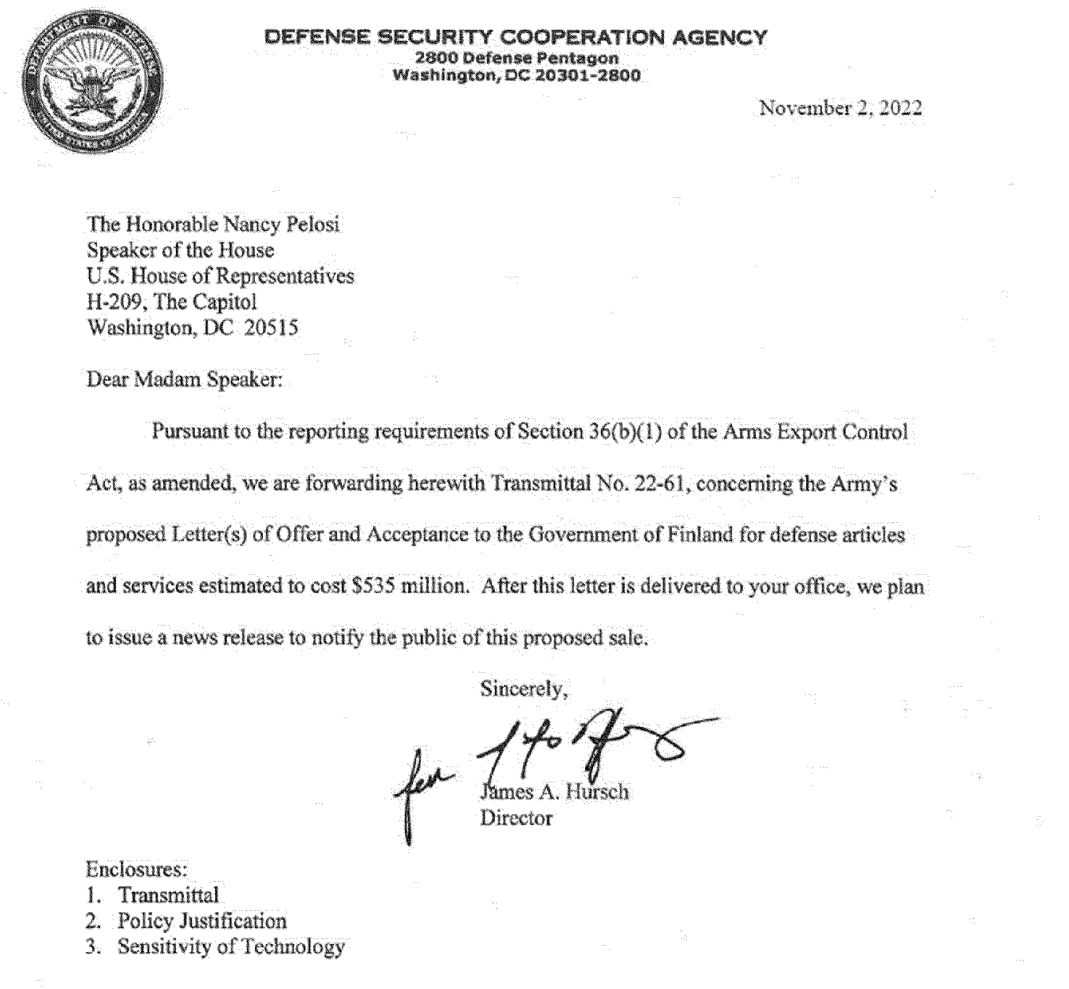 This 36(b)(1) arms sales notification is published to fulfill the requirements of section 155 of Public Law 104-164 dated July 21, 1996. The following is a copy of a letter to the Speaker of the House of Representatives with attached Transmittal 22-61, Sensitivity of Technology, and Policy Justification.