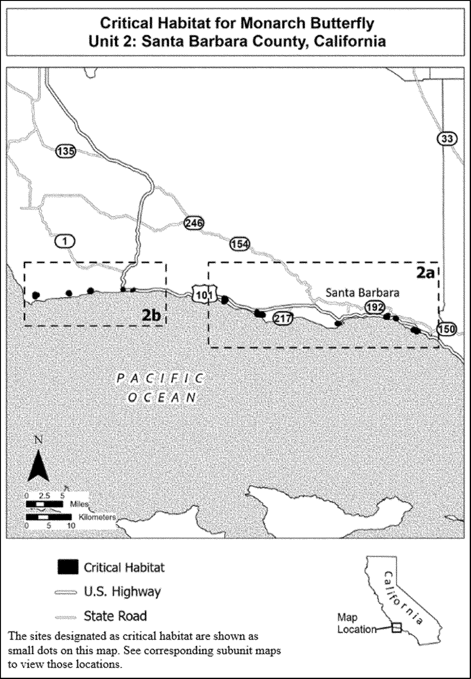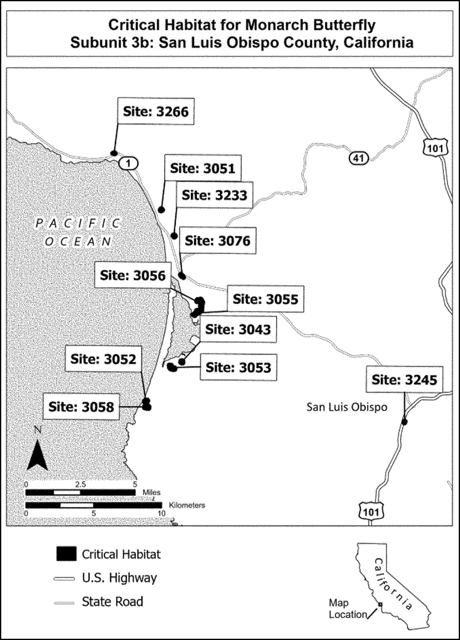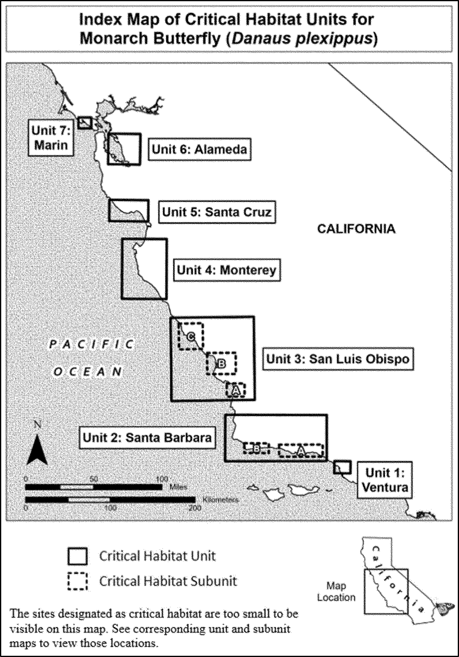 (4) Data layers defining map units were created using mapping data collected as part of the annual Western Monarch Count (see Xerces Society 2024b, unpaginated). Critical habitat units were then mapped using “NAD 1983 California (Teale) Albers (Meters).” The site names and numbers on the maps in this entry match those used for the Western Monarch Count annual survey. The maps in this entry, as supplemented by text in this entry, establish the boundaries of the critical habitat designation. The coordinates or plot points or both on which each map