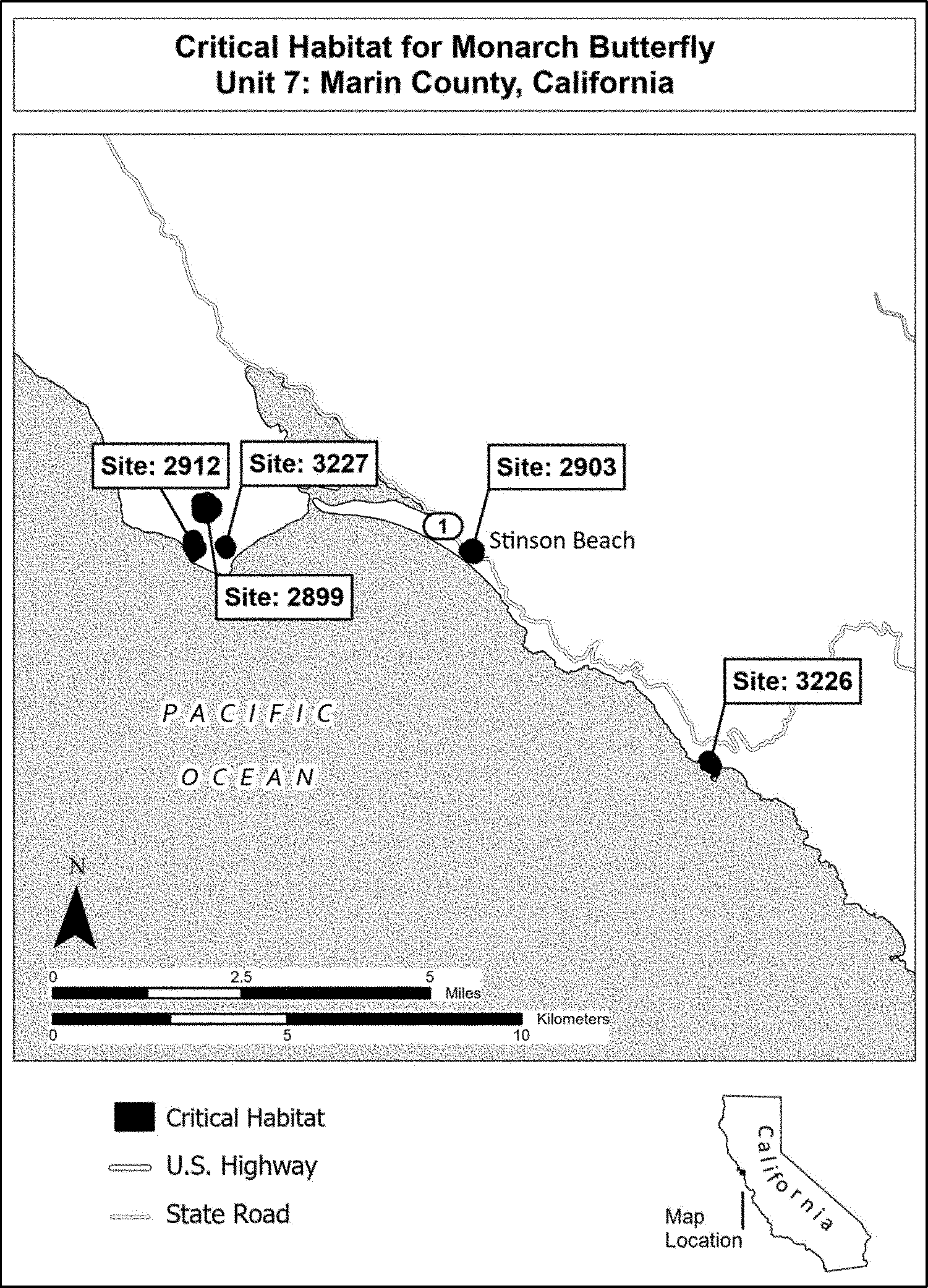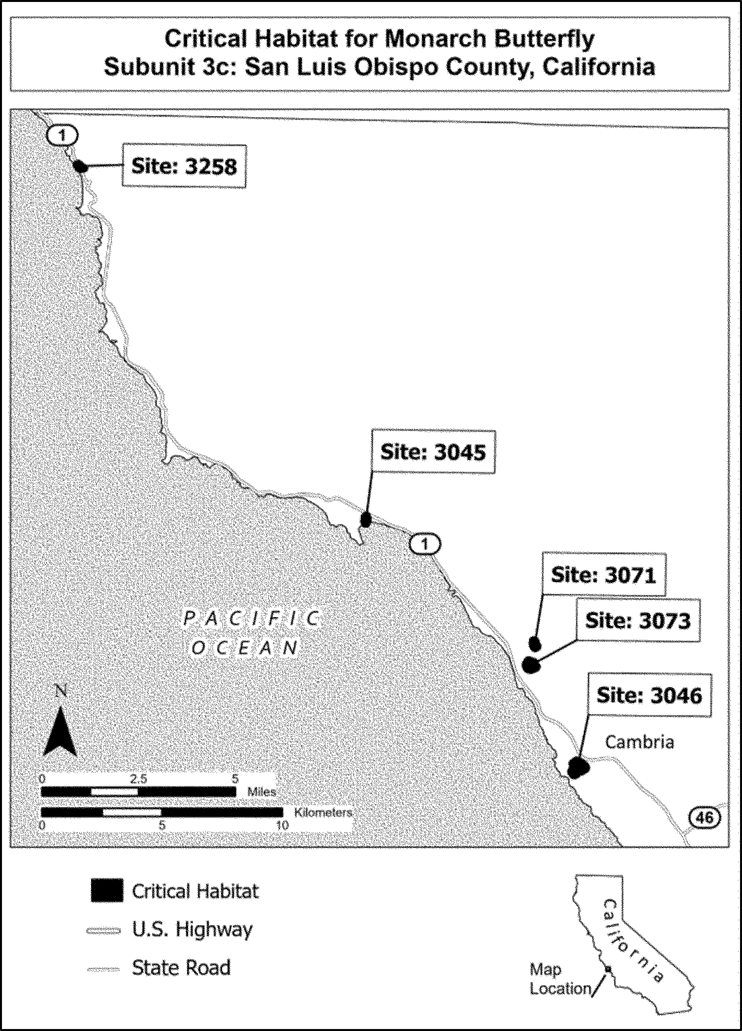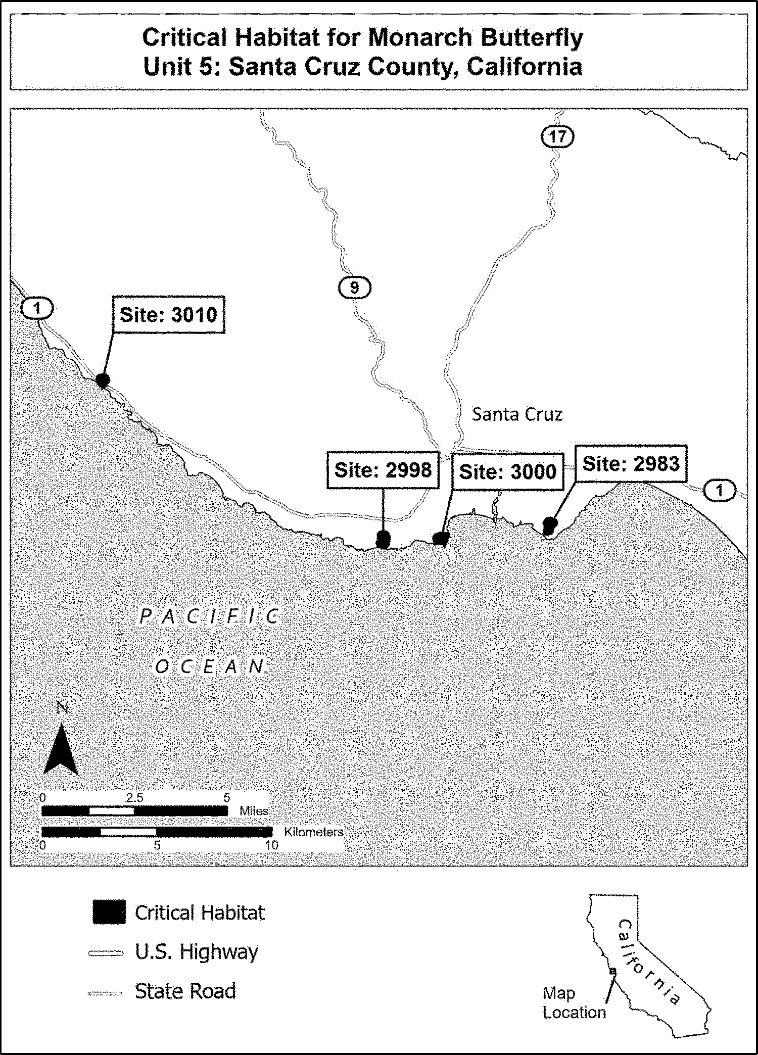 (4) Data layers defining map units were created using mapping data collected as part of the annual Western Monarch Count (see Xerces Society 2024b, unpaginated). Critical habitat units were then mapped using “NAD 1983 California (Teale) Albers (Meters).” The site names and numbers on the maps in this entry match those used for the Western Monarch Count annual survey. The maps in this entry, as supplemented by text in this entry, establish the boundaries of the critical habitat designation. The coordinates or plot points or both on which each map