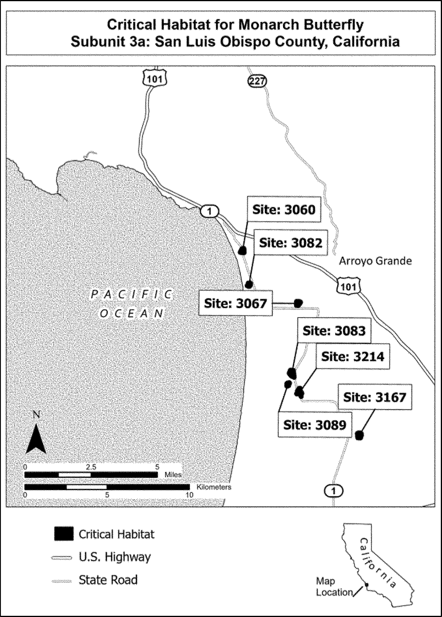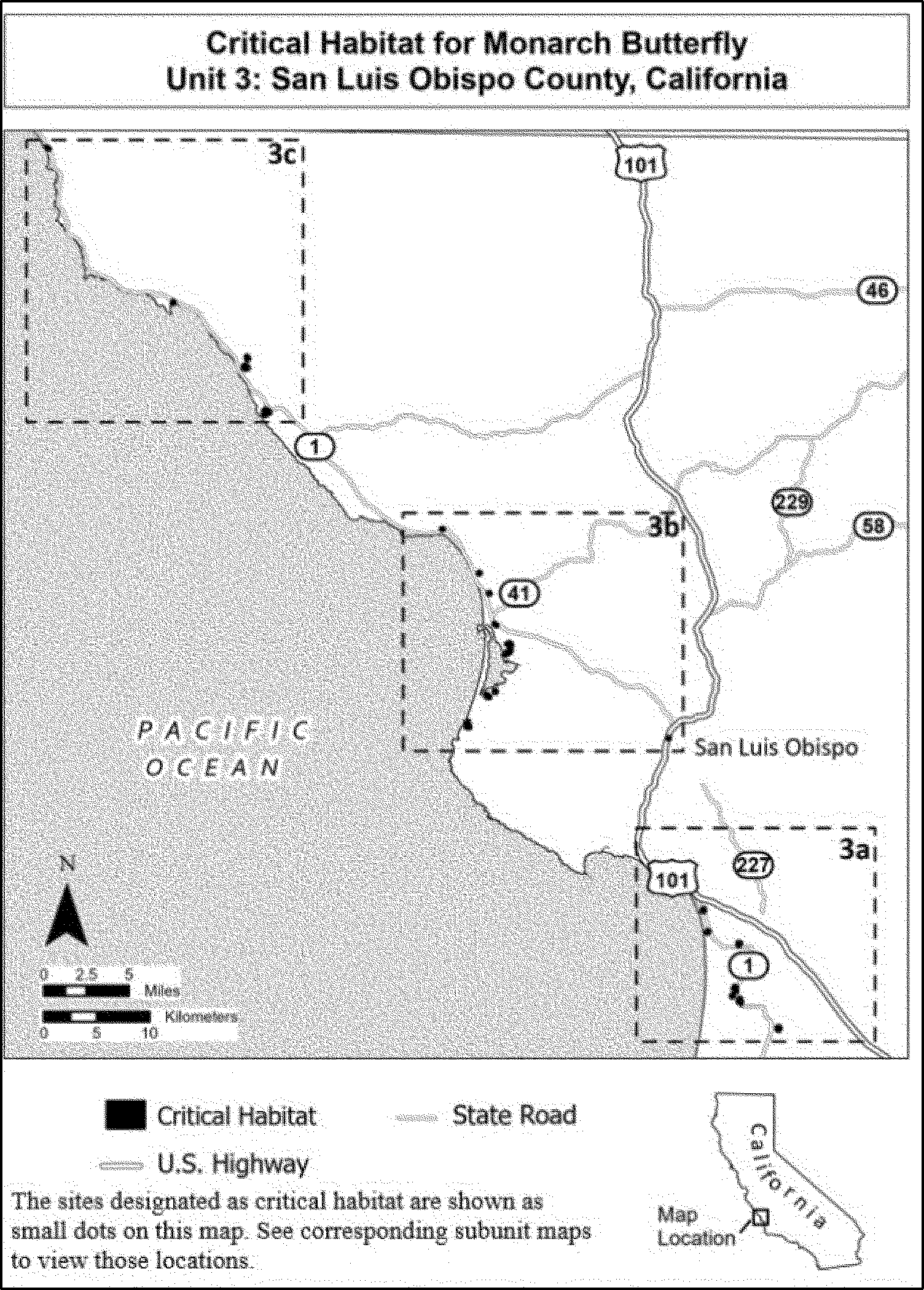 (A) Subunit 3a consists of 470 ac (190 ha). It includes the following areas: Pismo Beach (North Beach Campground) (site #3060), Halcyon Hill (site #3067), overwintering site in Oceano (site #3082), Blacklake I (site #3083), Blacklake II (site #3089), Woodlands Village Monarch Habitat (site #3167), and Callendar Road (site #3214).