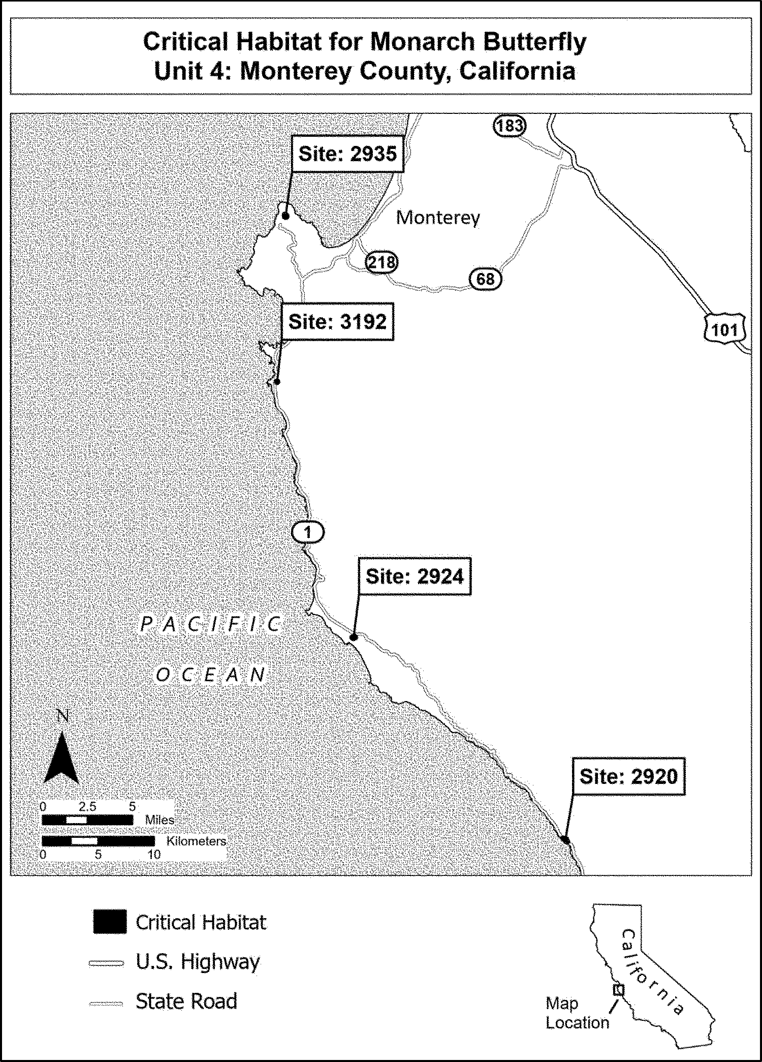 (i) Unit 4 consists of 204 ac (83 ha) in Monterey County, California. It includes the following areas: overwintering site near Big Sur (site #2920), Andrew Molera State Park (site #2924), Pacific Grove Monarch Butterfly Sanctuary (site #2935), and overwintering site in Monterey (site #3192).