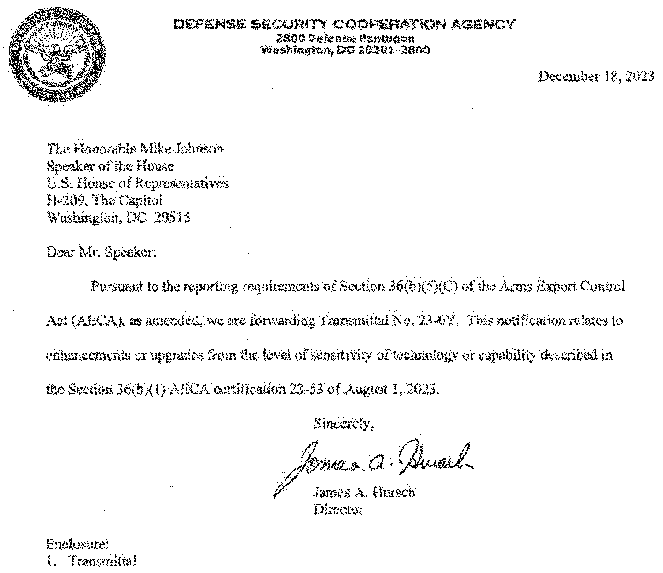 This 36(b)(5)(C) arms sales notification is published to fulfill the requirements of section 155 of Public Law 104-164 dated July 21, 1996. The following is a copy of a letter to the Speaker of the House of Representatives with attached Transmittal 23-0Y.