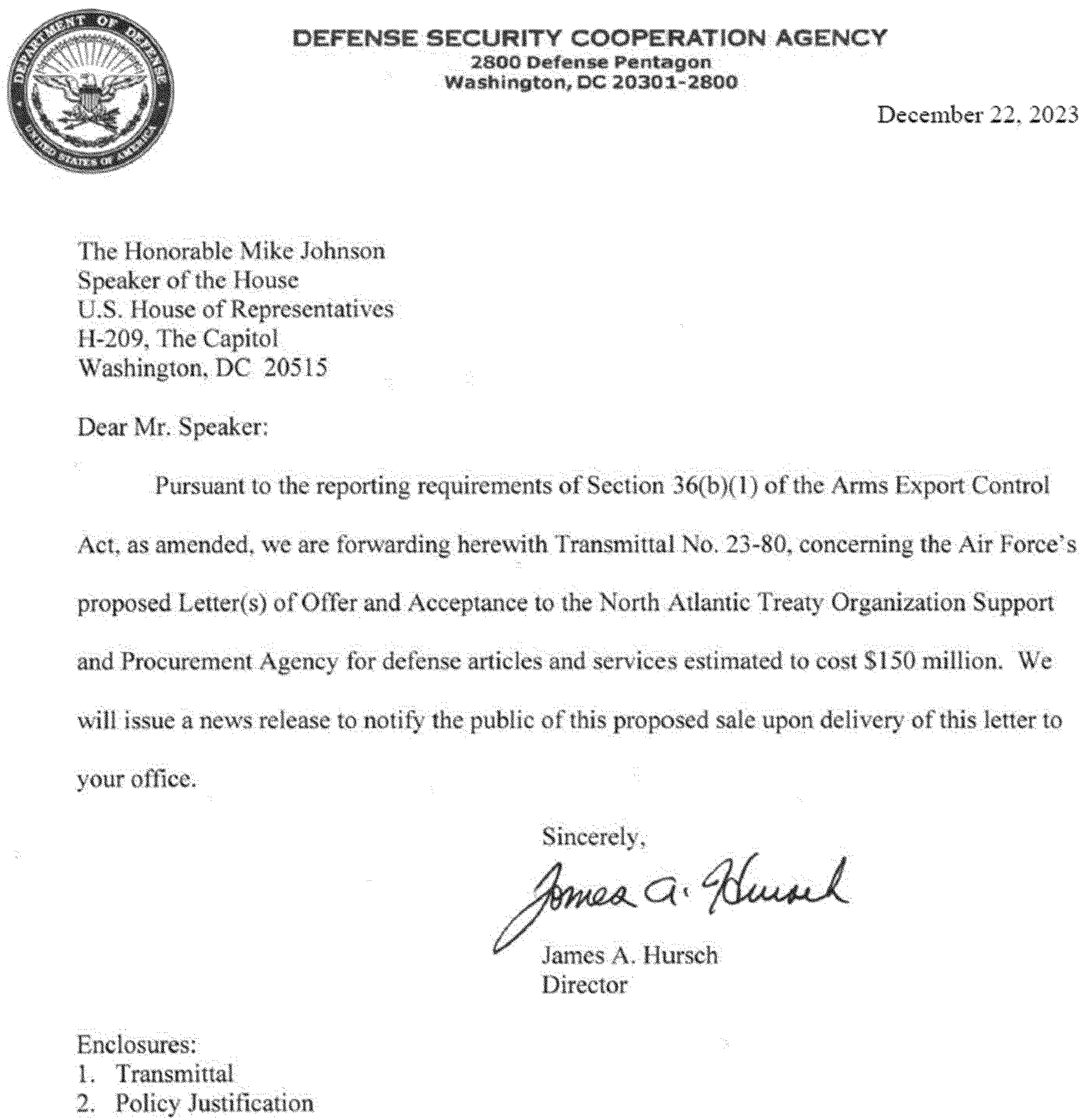 This 36(b)(1) arms sales notification is published to fulfill the requirements of section 155 of Public Law 104-164 dated July 21, 1996. The following is a copy of a letter to the Speaker of the House of Representatives with attached Transmittal 23-80 and Policy Justification.