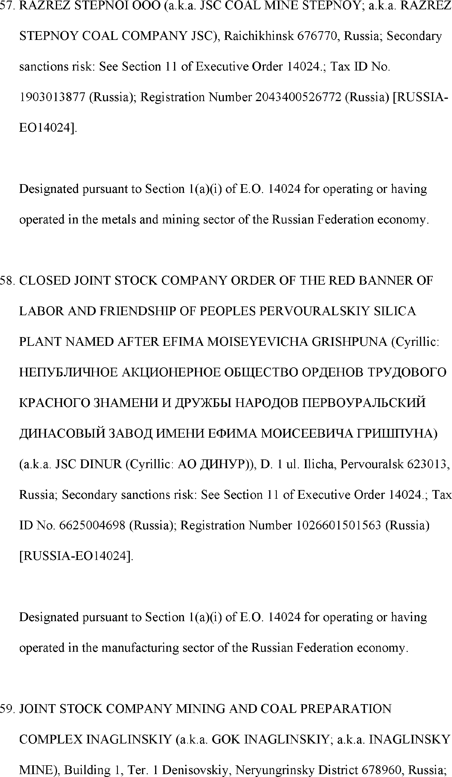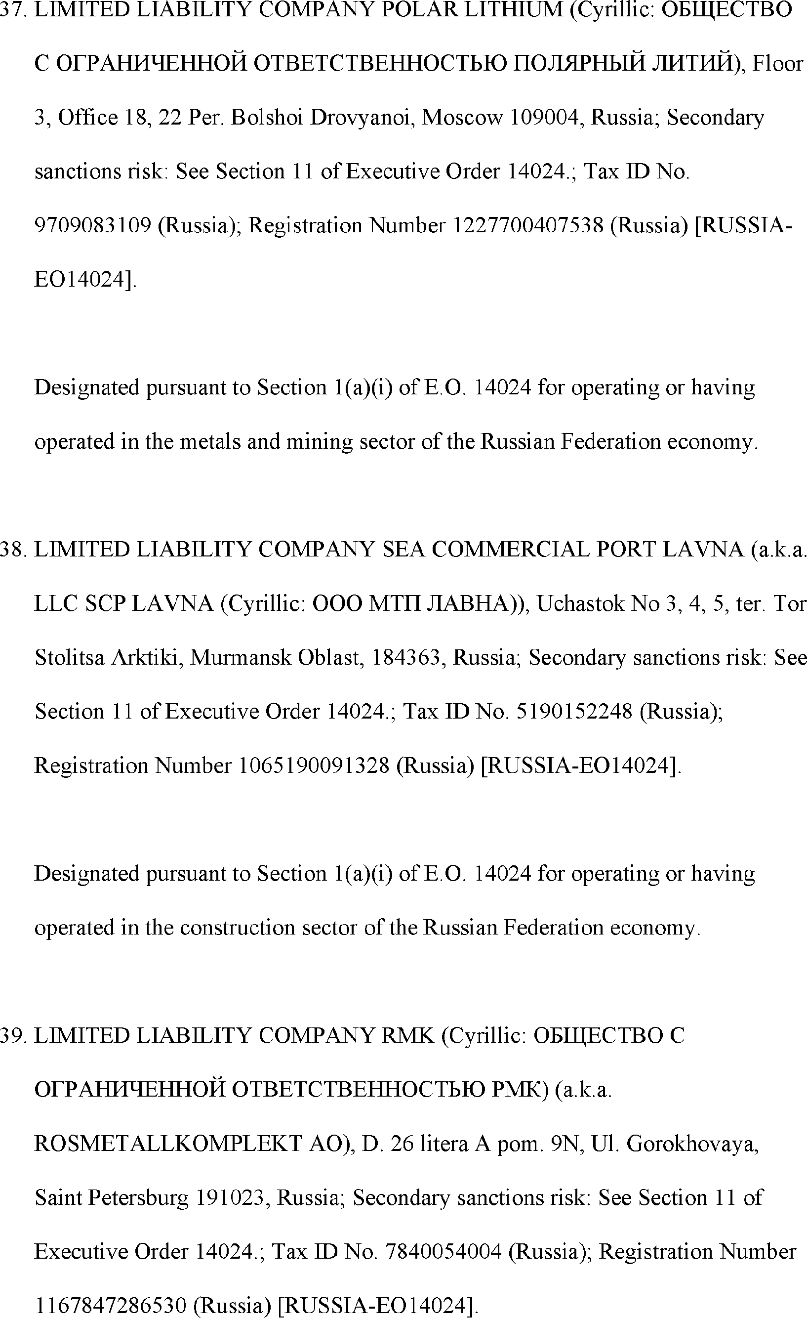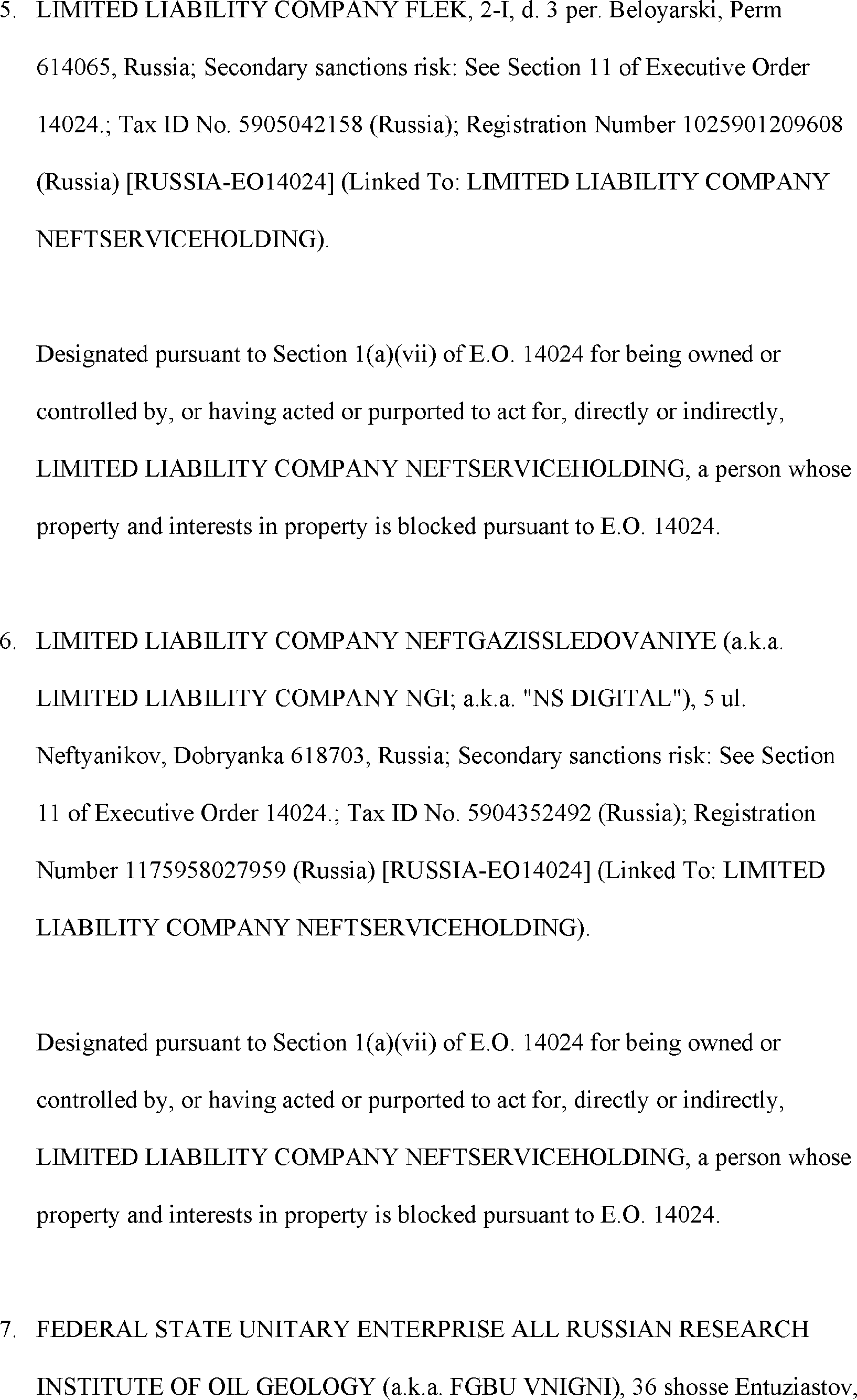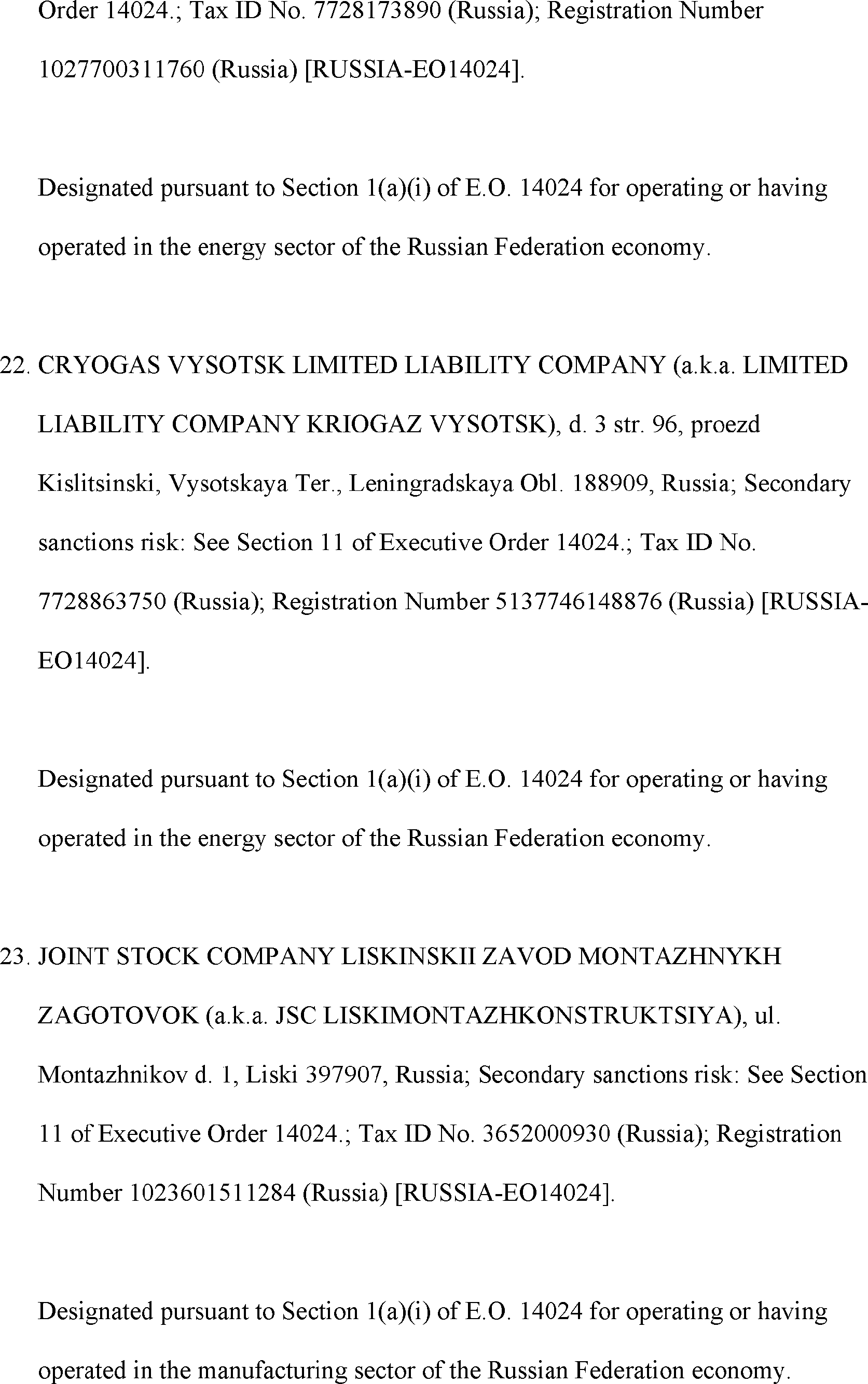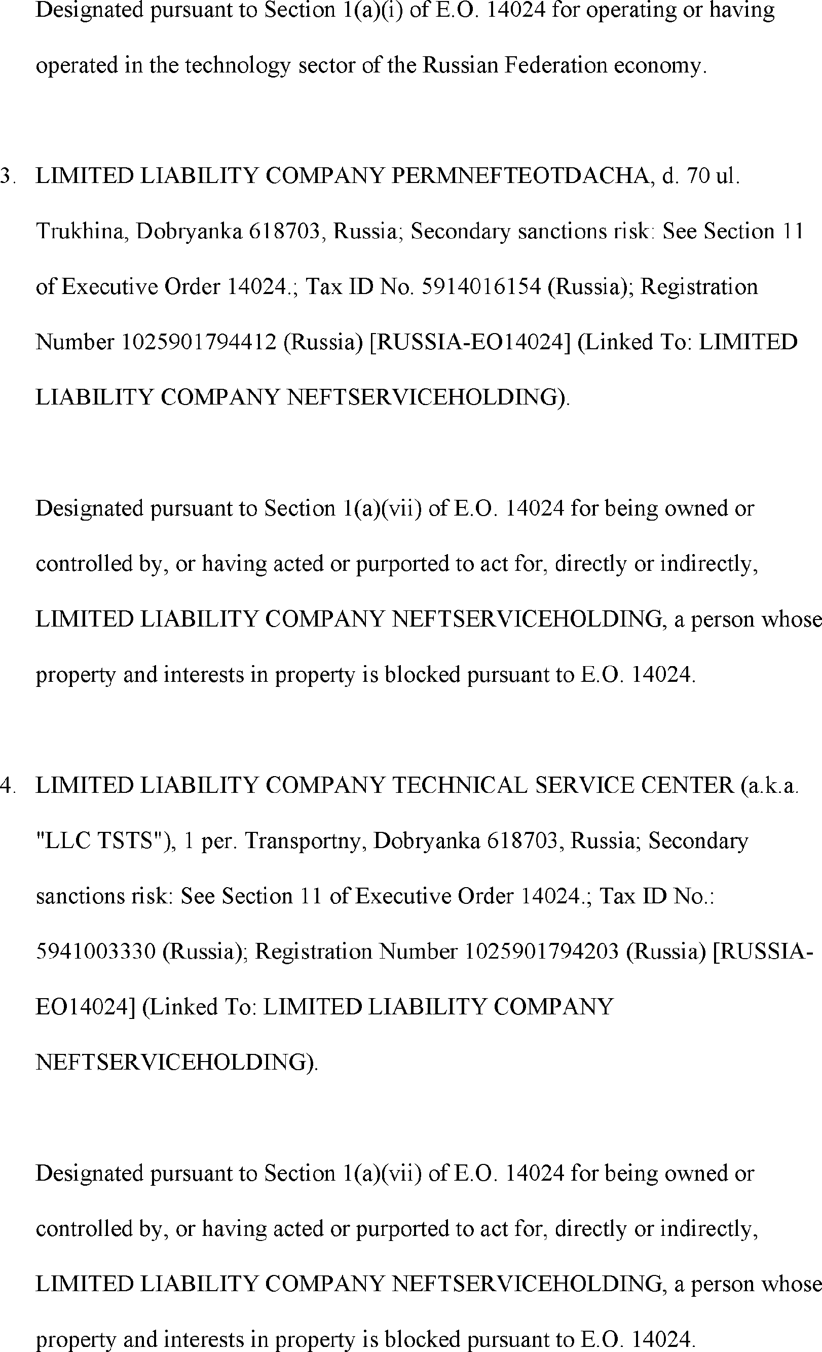 The Department of State is publishing the names of one or more persons that have been placed on the Department of Treasury's List of Specially Designated Nationals and Blocked Persons (SDN List) administered by the Office of Foreign Asset Control (OFAC) based on the Department of State's determination, in consultation with other departments, as appropriate, that one or more applicable legal criteria of the Executive Order regarding blocking property with respect to specified harmful foreign activities of the Government of the Russian Federation were satisfied. All property and interests in property subject to U.S. jurisdiction of these persons are blocked, and U.S. persons are generally prohibited from engaging in transactions with them.