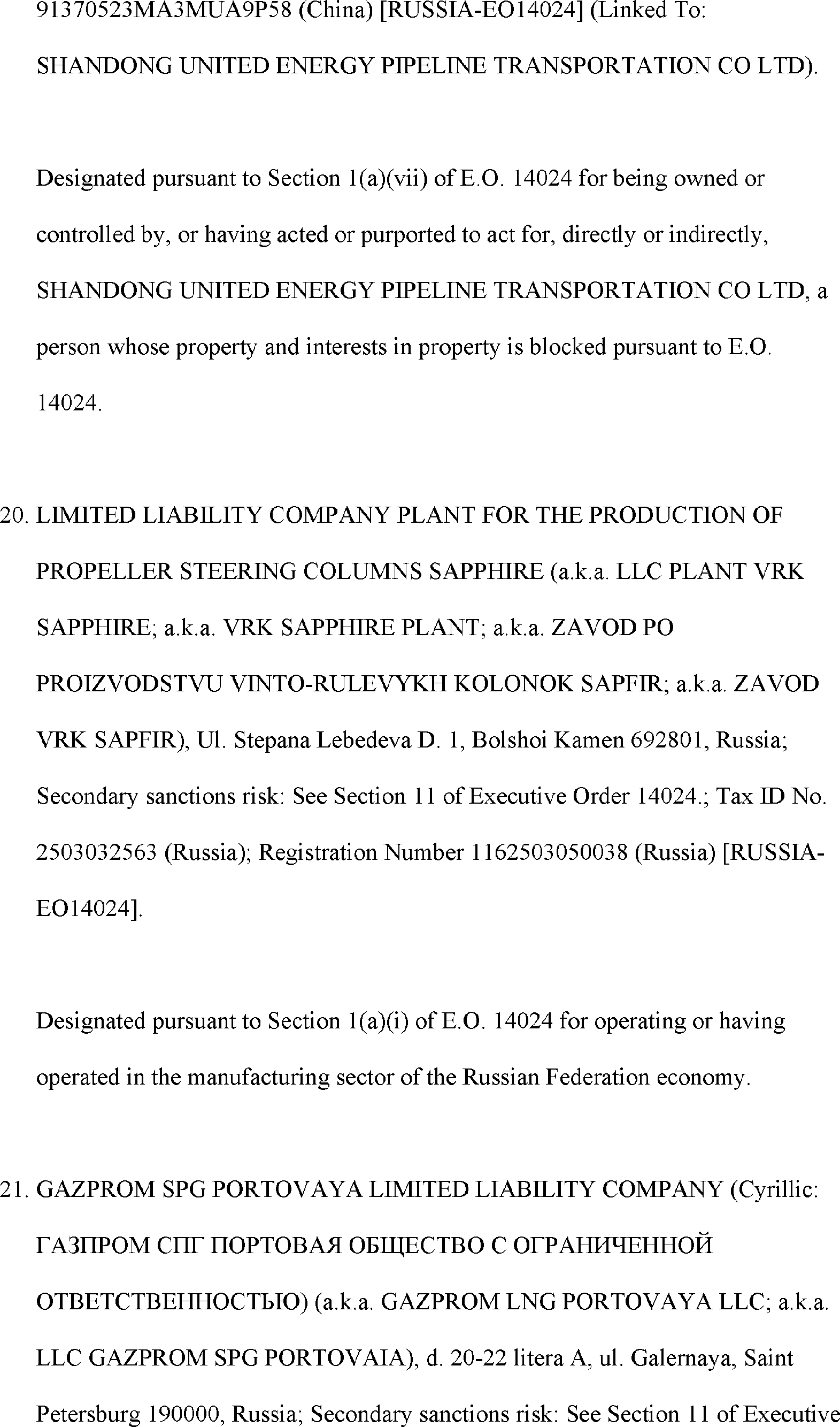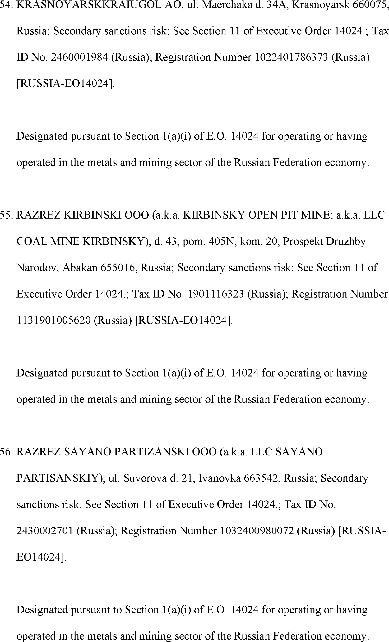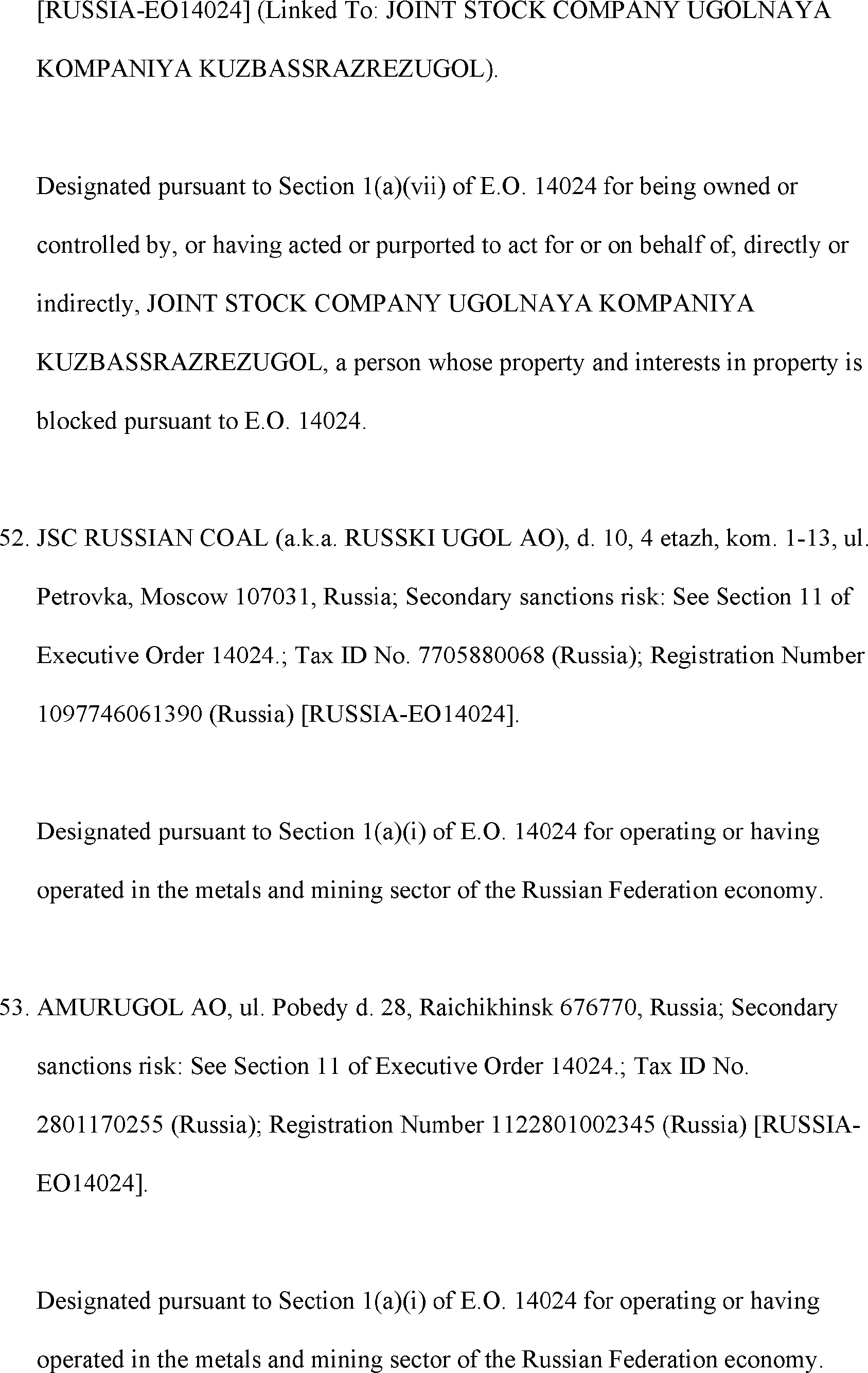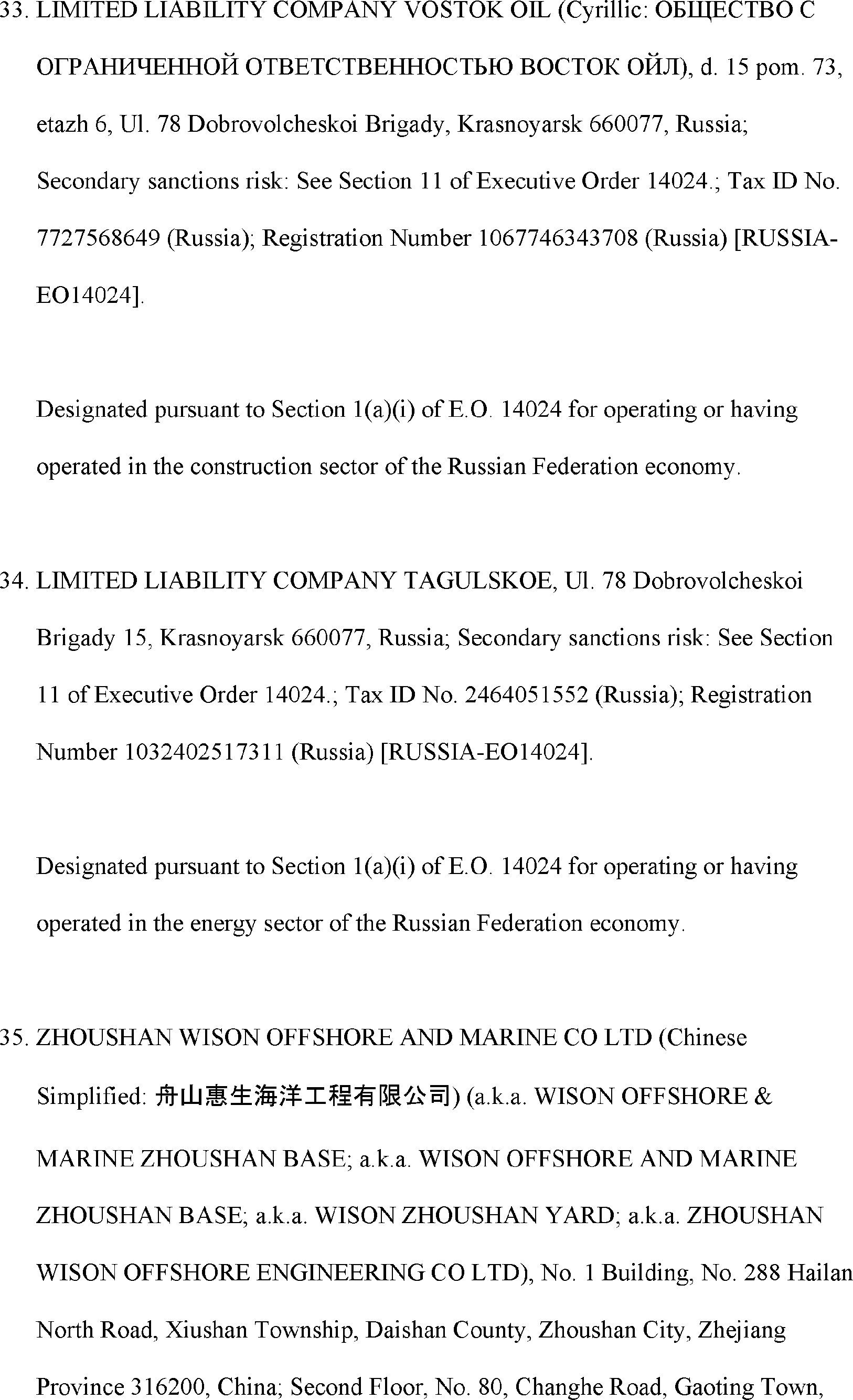The Department of State is publishing the names of one or more persons that have been placed on the Department of Treasury's List of Specially Designated Nationals and Blocked Persons (SDN List) administered by the Office of Foreign Asset Control (OFAC) based on the Department of State's determination, in consultation with other departments, as appropriate, that one or more applicable legal criteria of the Executive Order regarding blocking property with respect to specified harmful foreign activities of the Government of the Russian Federation were satisfied. All property and interests in property subject to U.S. jurisdiction of these persons are blocked, and U.S. persons are generally prohibited from engaging in transactions with them.