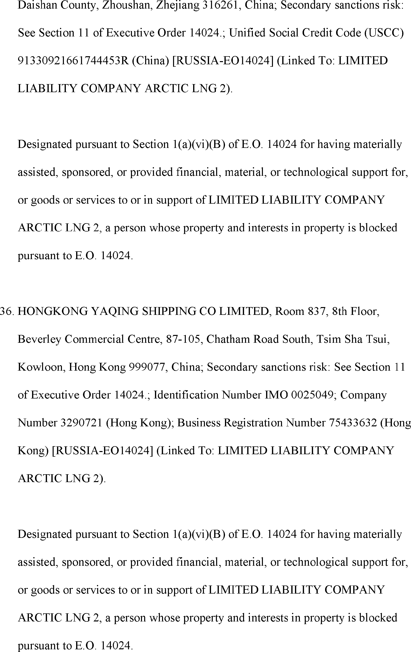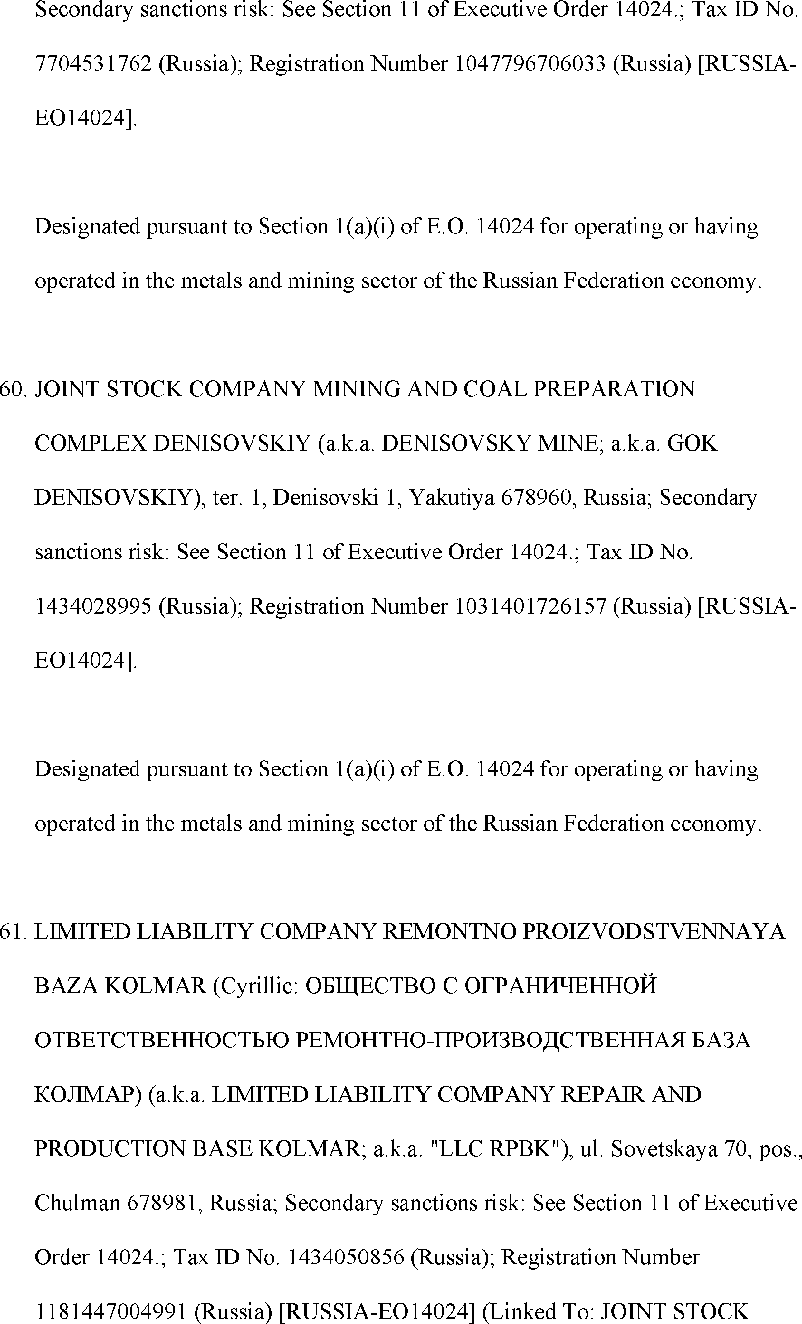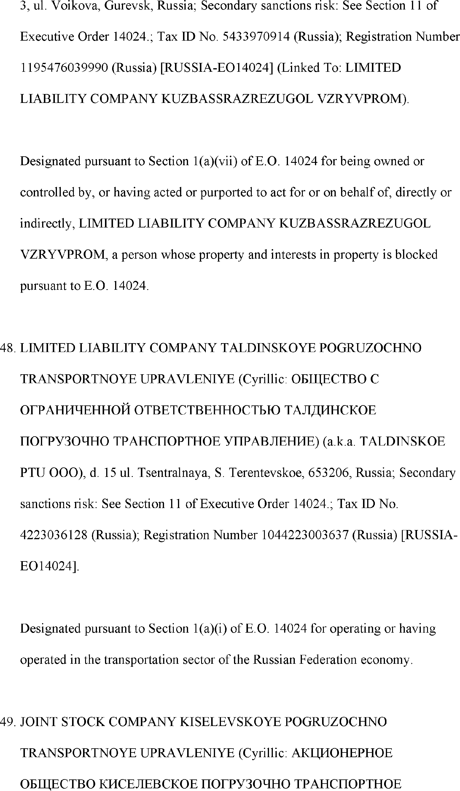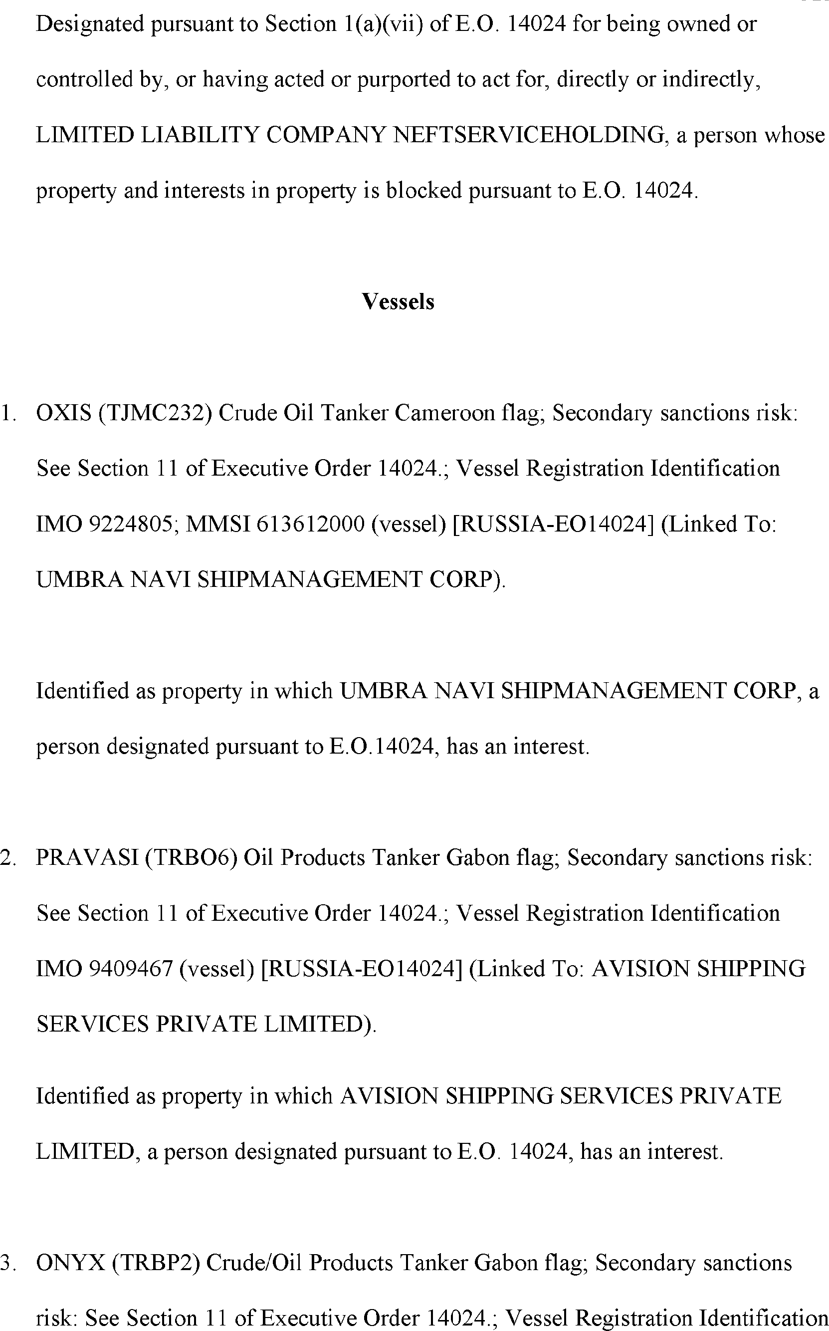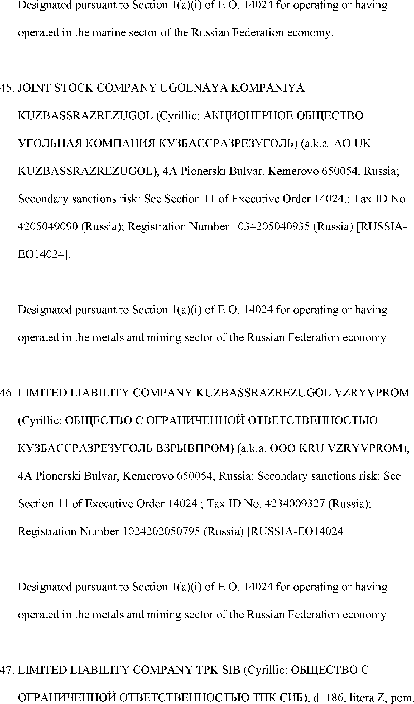 The Department of State is publishing the names of one or more persons that have been placed on the Department of Treasury's List of Specially Designated Nationals and Blocked Persons (SDN List) administered by the Office of Foreign Asset Control (OFAC) based on the Department of State's determination, in consultation with other departments, as appropriate, that one or more applicable legal criteria of the Executive Order regarding blocking property with respect to specified harmful foreign activities of the Government of the Russian Federation were satisfied. All property and interests in property subject to U.S. jurisdiction of these persons are blocked, and U.S. persons are generally prohibited from engaging in transactions with them.