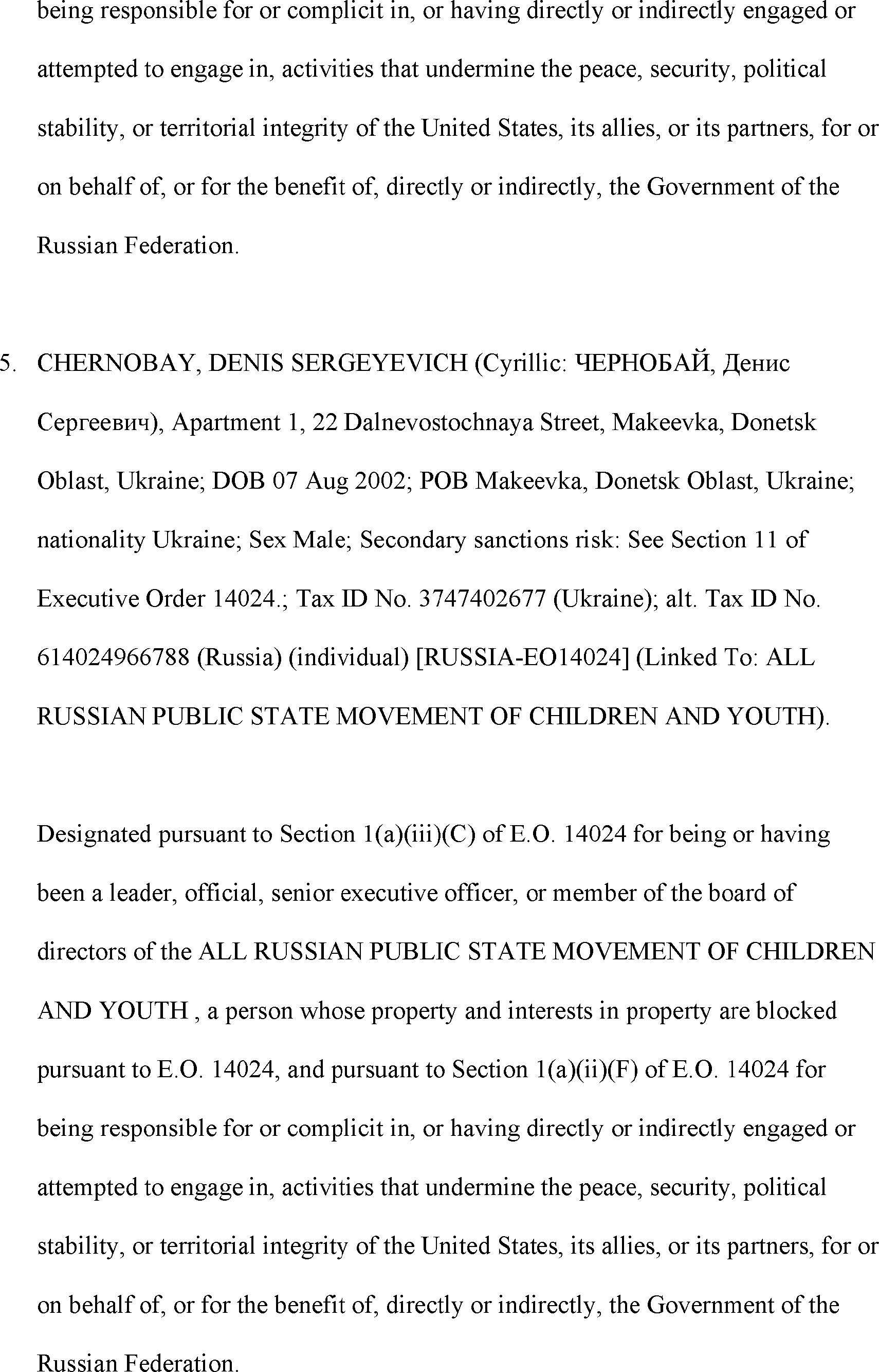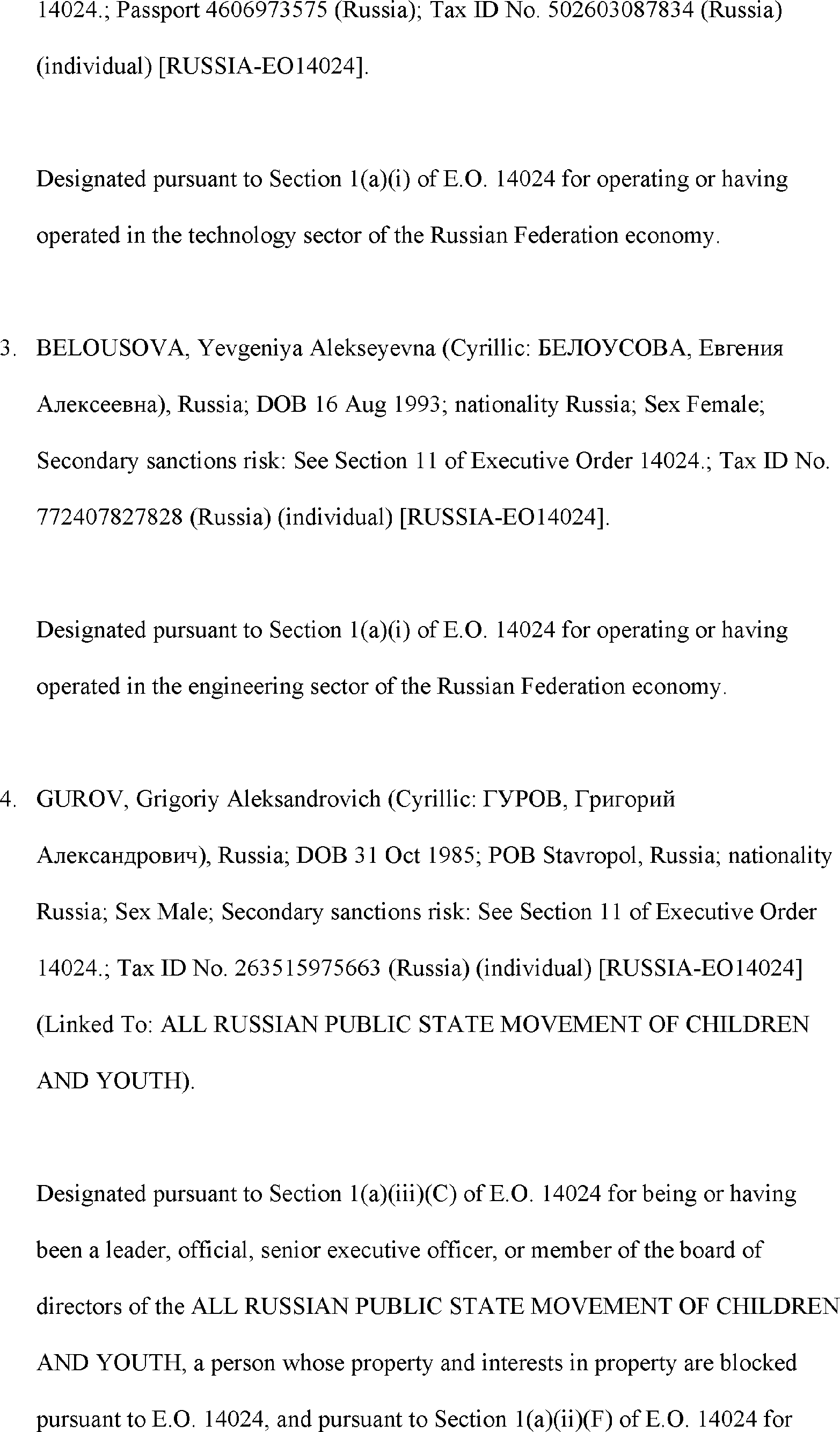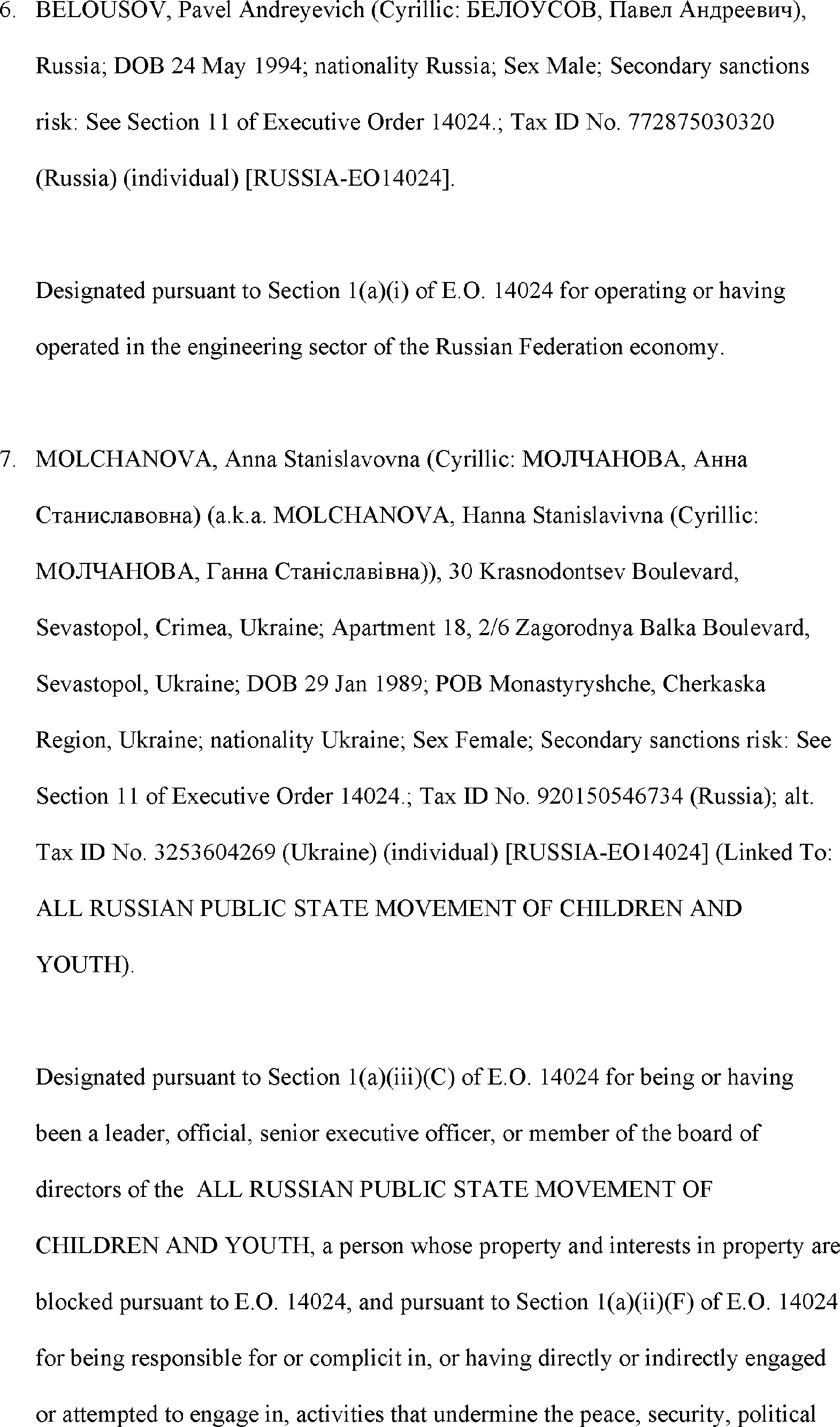 The Department of State is publishing the names of one or more persons that have been placed on the Department of Treasury's List of Specially Designated Nationals and Blocked Persons (SDN List) administered by the Office of Foreign Asset Control (OFAC) based on the Department of State's determination, in consultation with other departments, as appropriate, that one or more applicable legal criteria of the Executive Order regarding blocking property with respect to specified harmful foreign activities of the Government of the Russian Federation were satisfied. All property and interests in property subject to U.S. jurisdiction of these persons are blocked, and U.S. persons are generally prohibited from engaging in transactions with them.