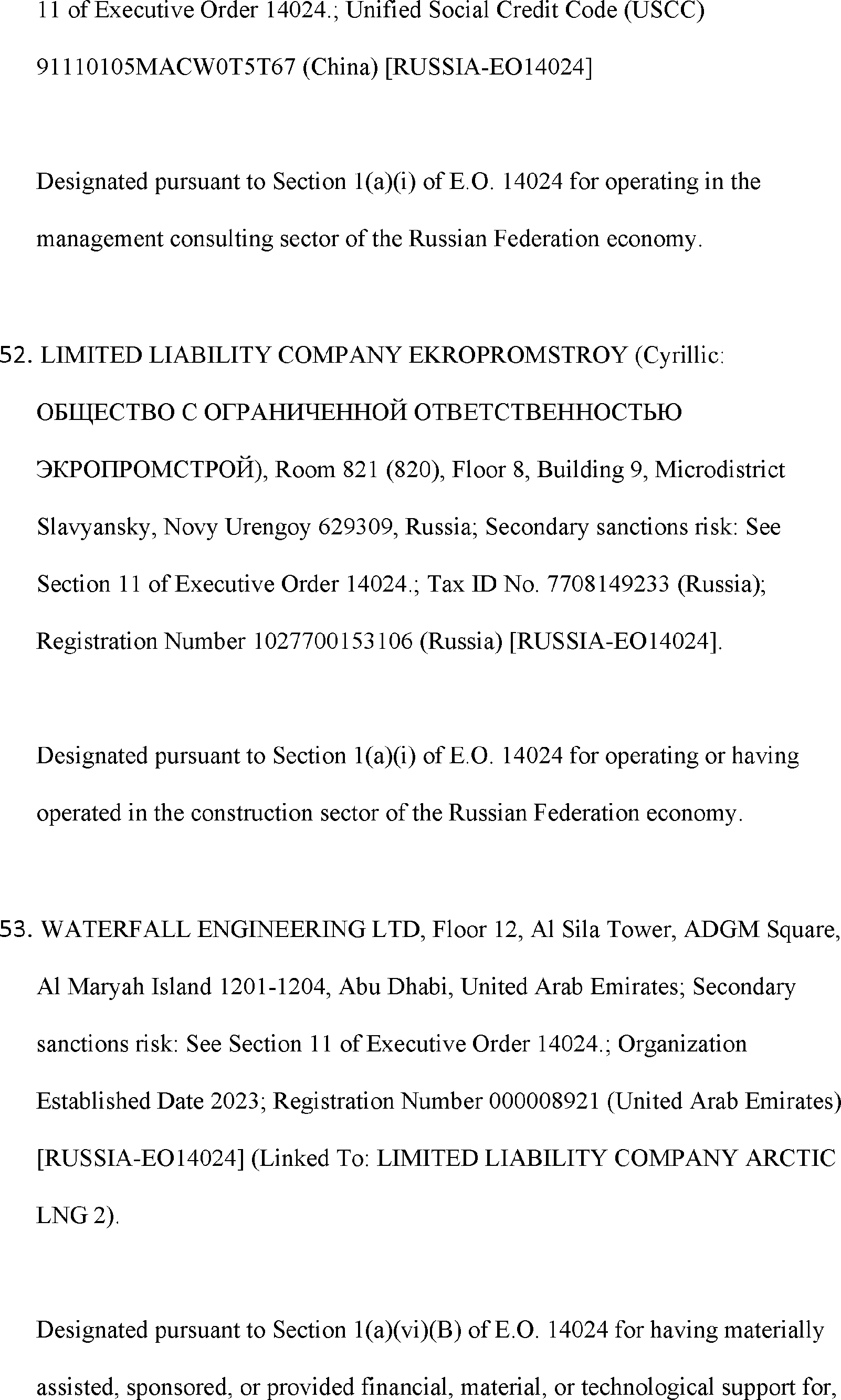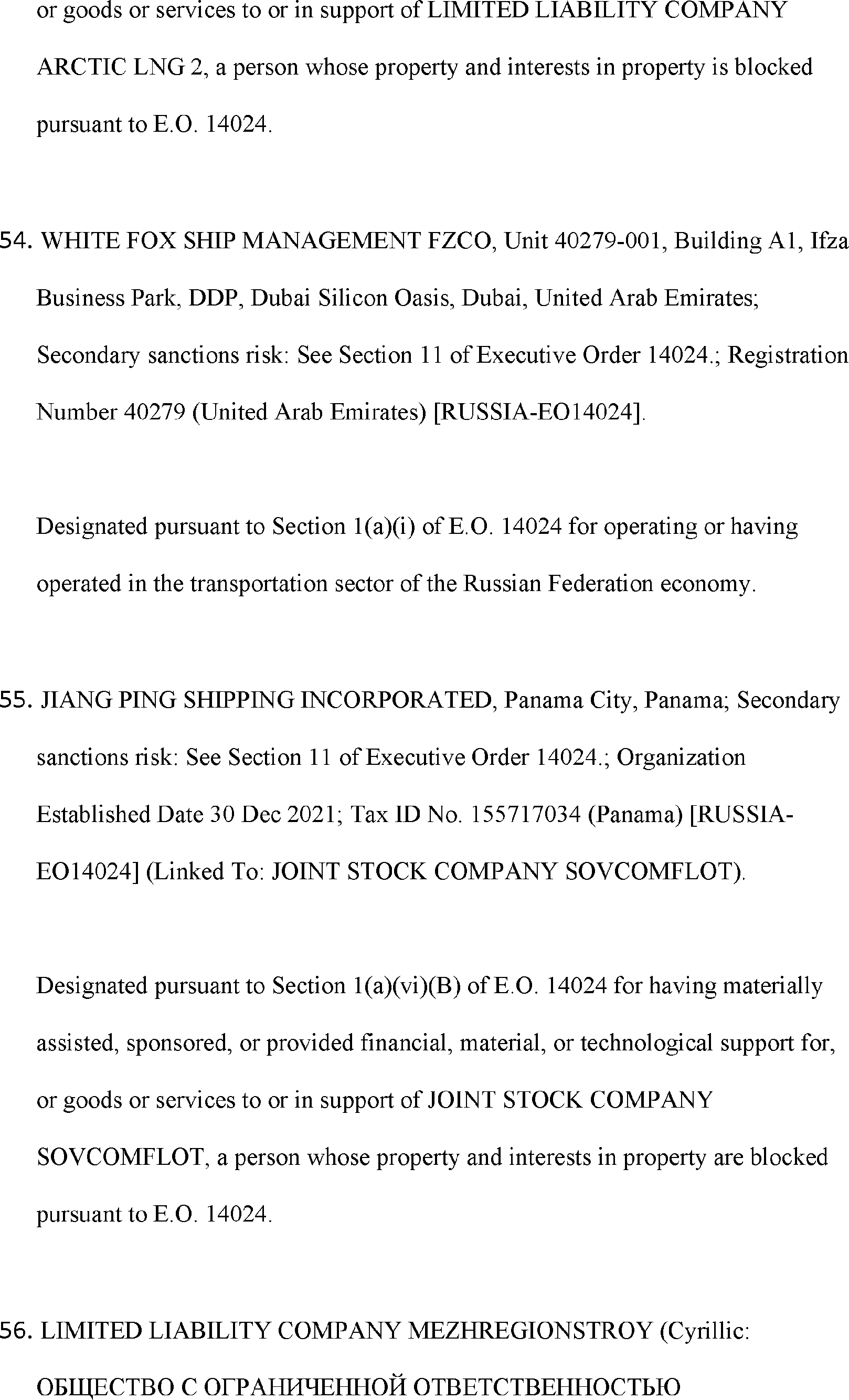 1. NORTH WAY (3E5924) LNG Carrier Panama flag; Secondary sanctions risk: See Section 11 of Executive Order 14024.; Vessel Registration Identification IMO 9953535 (vessel) [RUSSIA-EO14024] (Linked To: WHITE FOX SHIP MANAGEMENT FZCO).