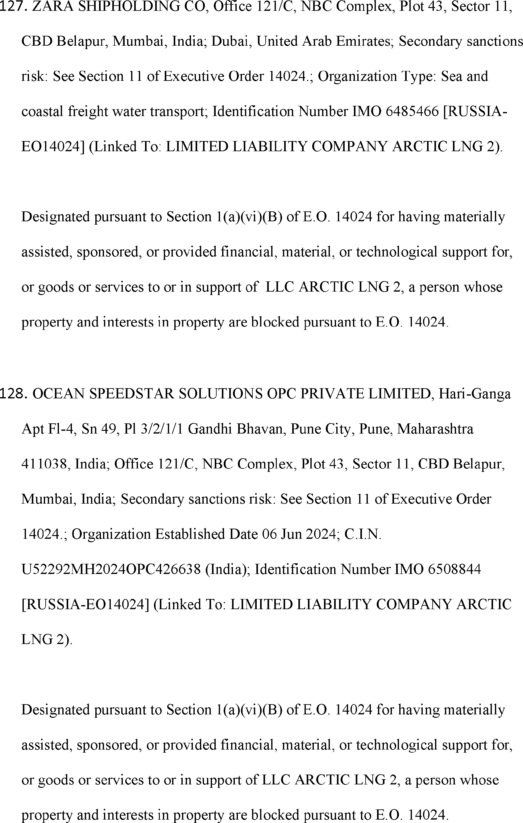 Identified as property in OCEAN SPEEDSTAR SOLUTIONS OPC PRIVATE LIMITED, a person designated pursuant to E.O. 14024, has an interest.