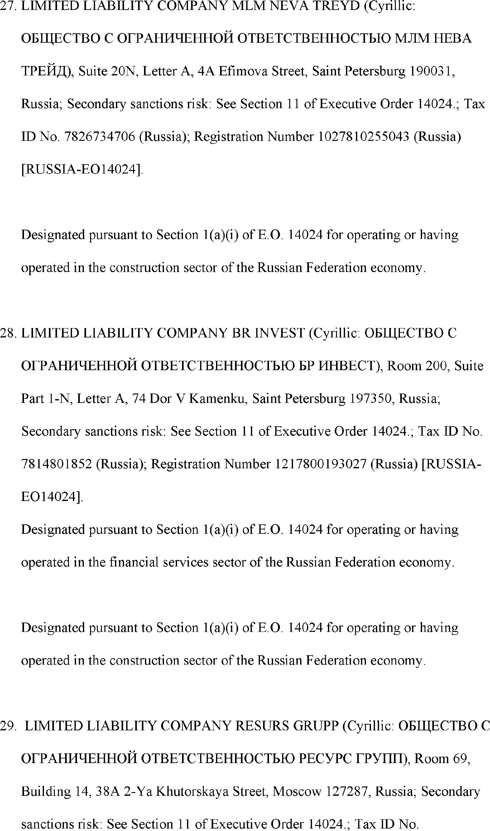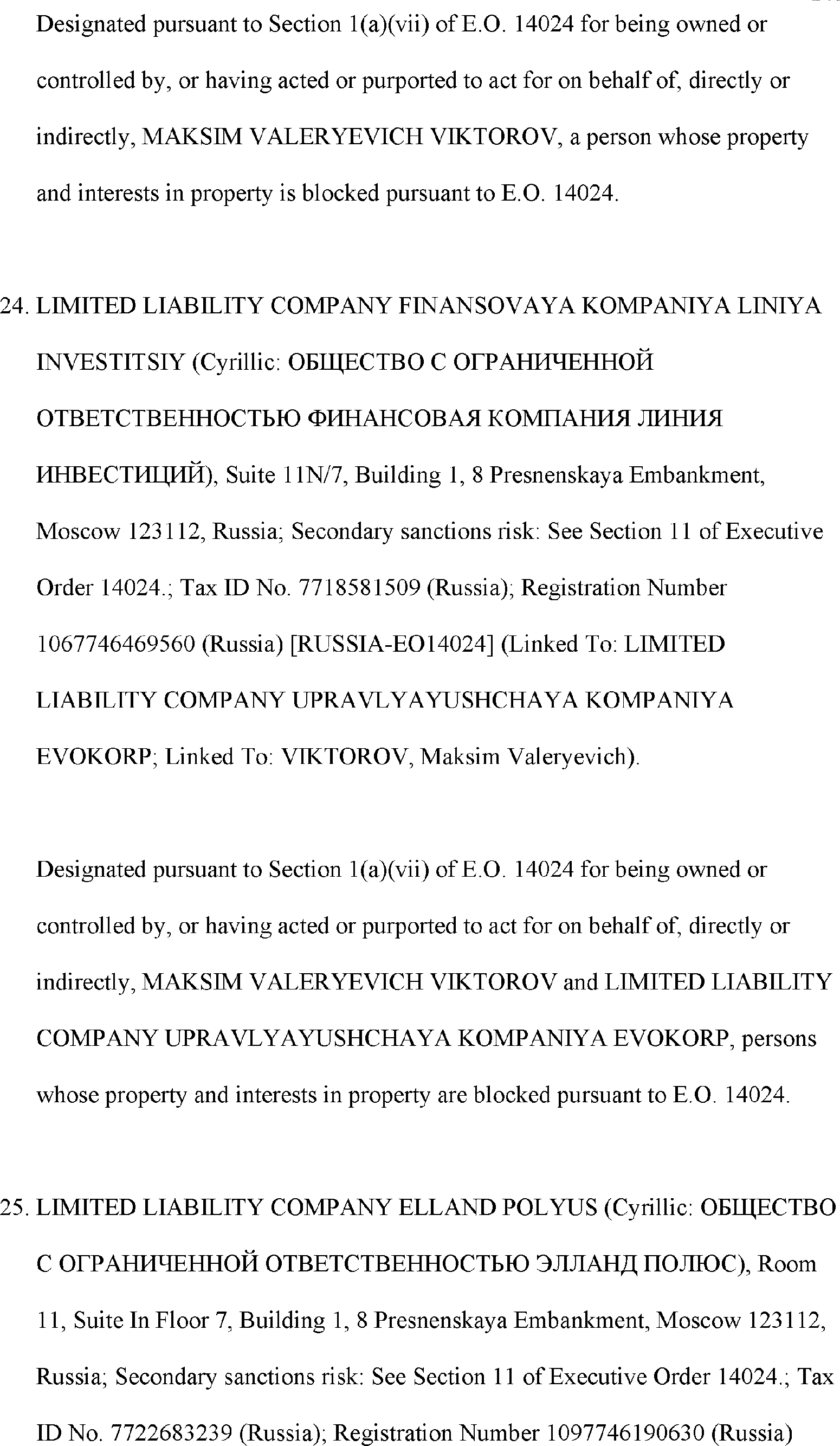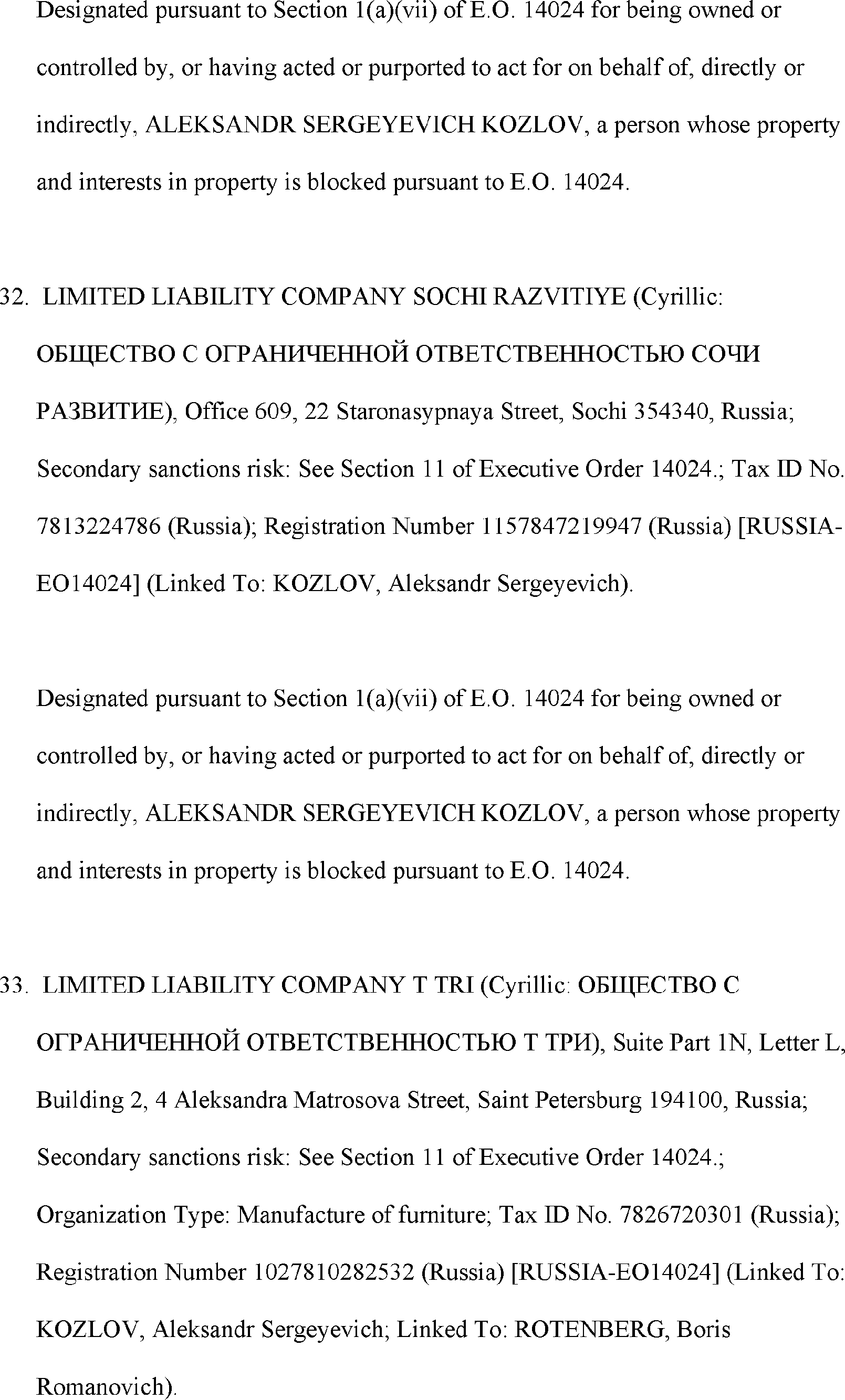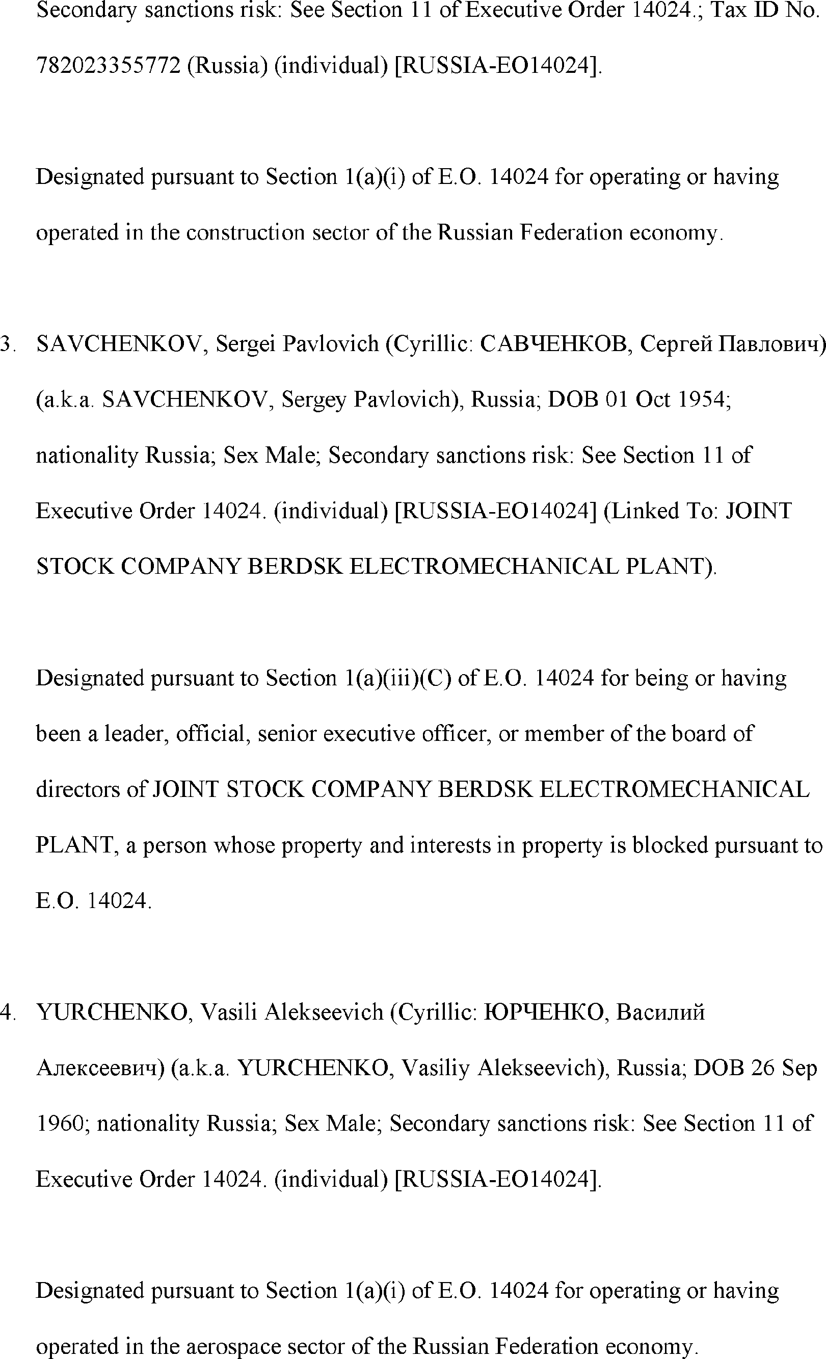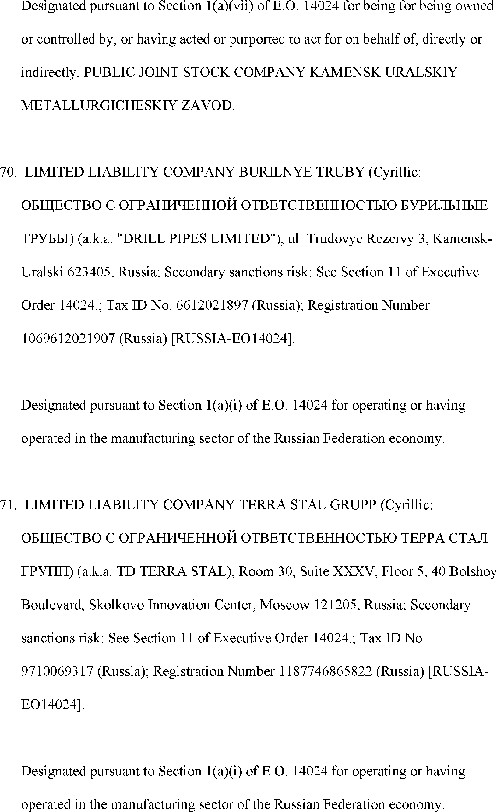 The Department of State is publishing the names of one or more persons that have been placed on the Department of Treasury's List of Specially Designated Nationals and Blocked Persons (SDN List) administered by the Office of Foreign Asset Control (OFAC) based on the Department of State's determination, in consultation with other departments, as appropriate, that one or more applicable legal criteria of the Executive Order regarding blocking property with respect to specified harmful foreign activities of the Government of the Russian Federation were satisfied. All property and interests in property subject to U.S. jurisdiction of these persons are blocked, and U.S. persons are generally prohibited from engaging in transactions with them.