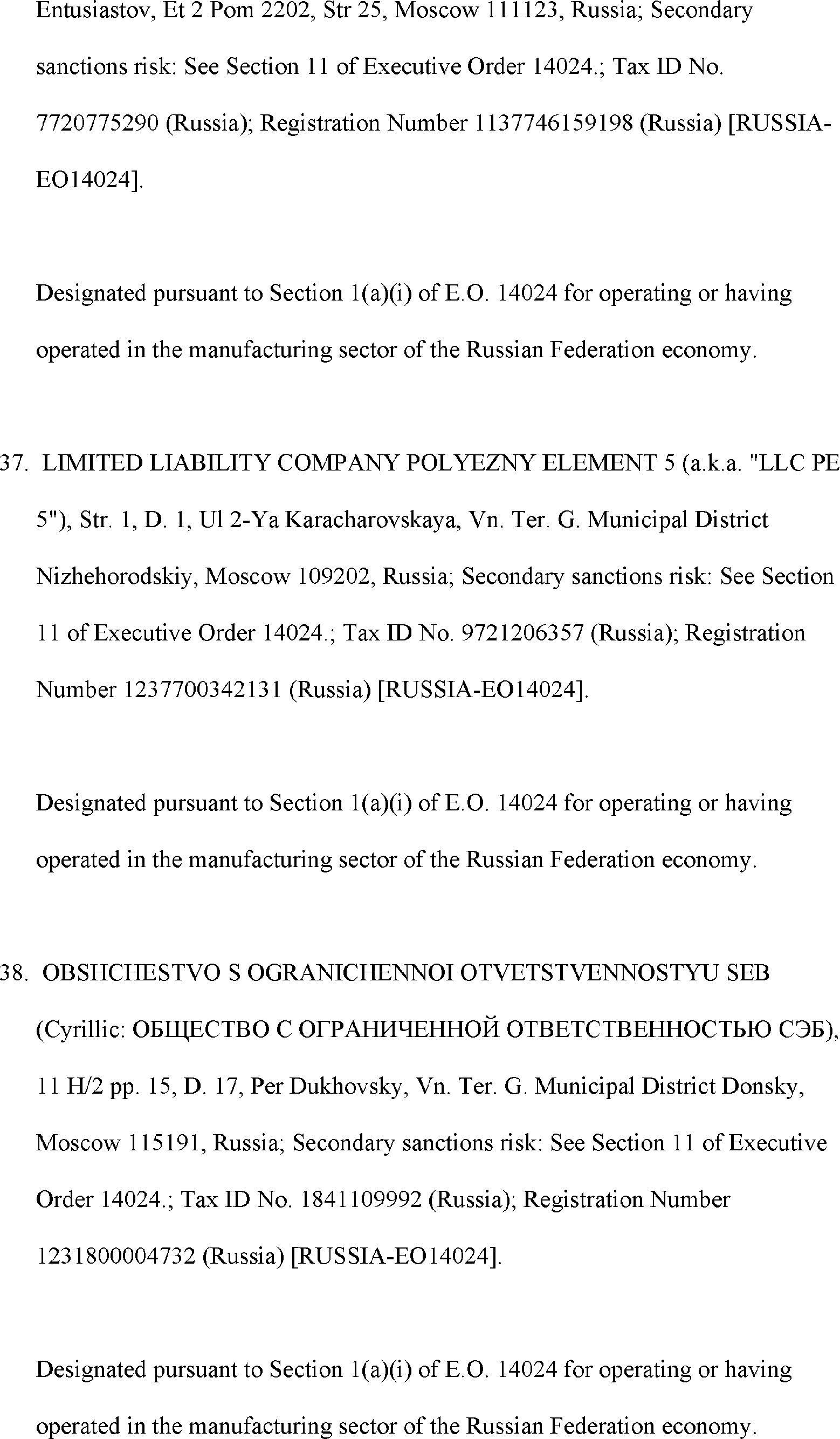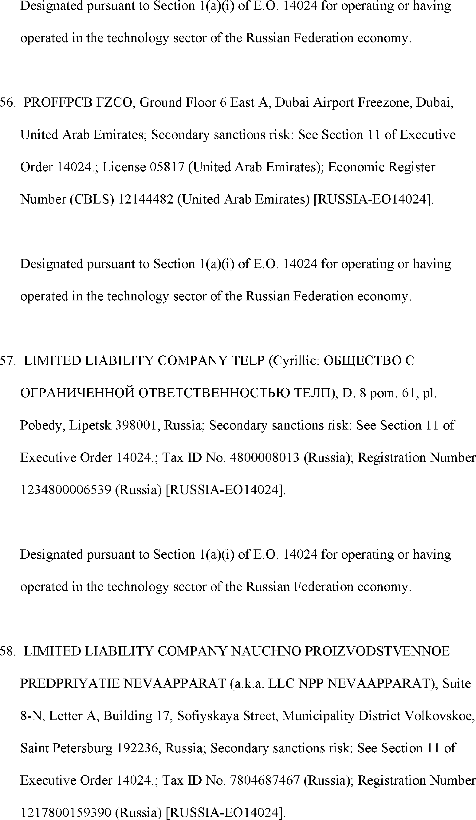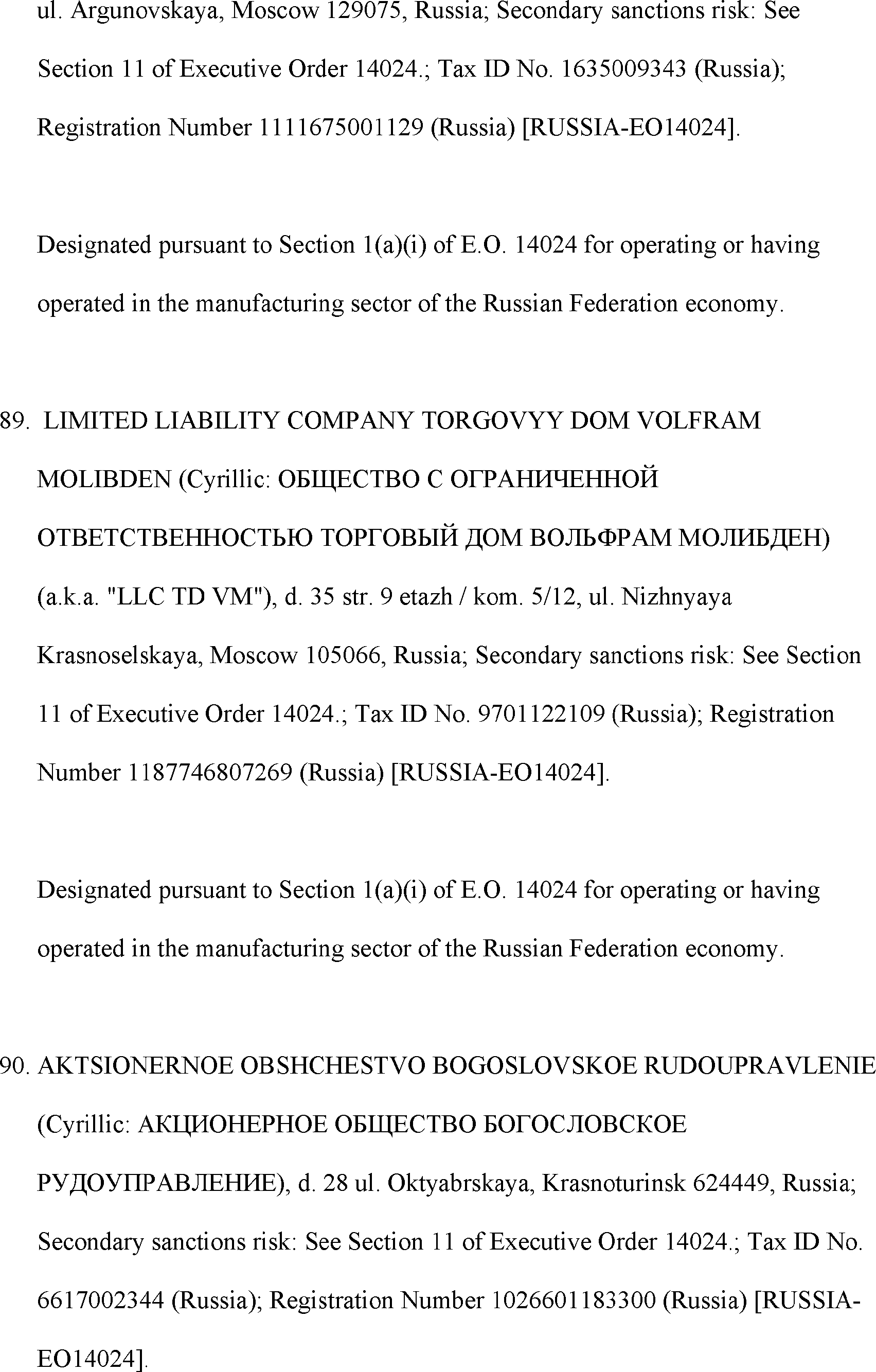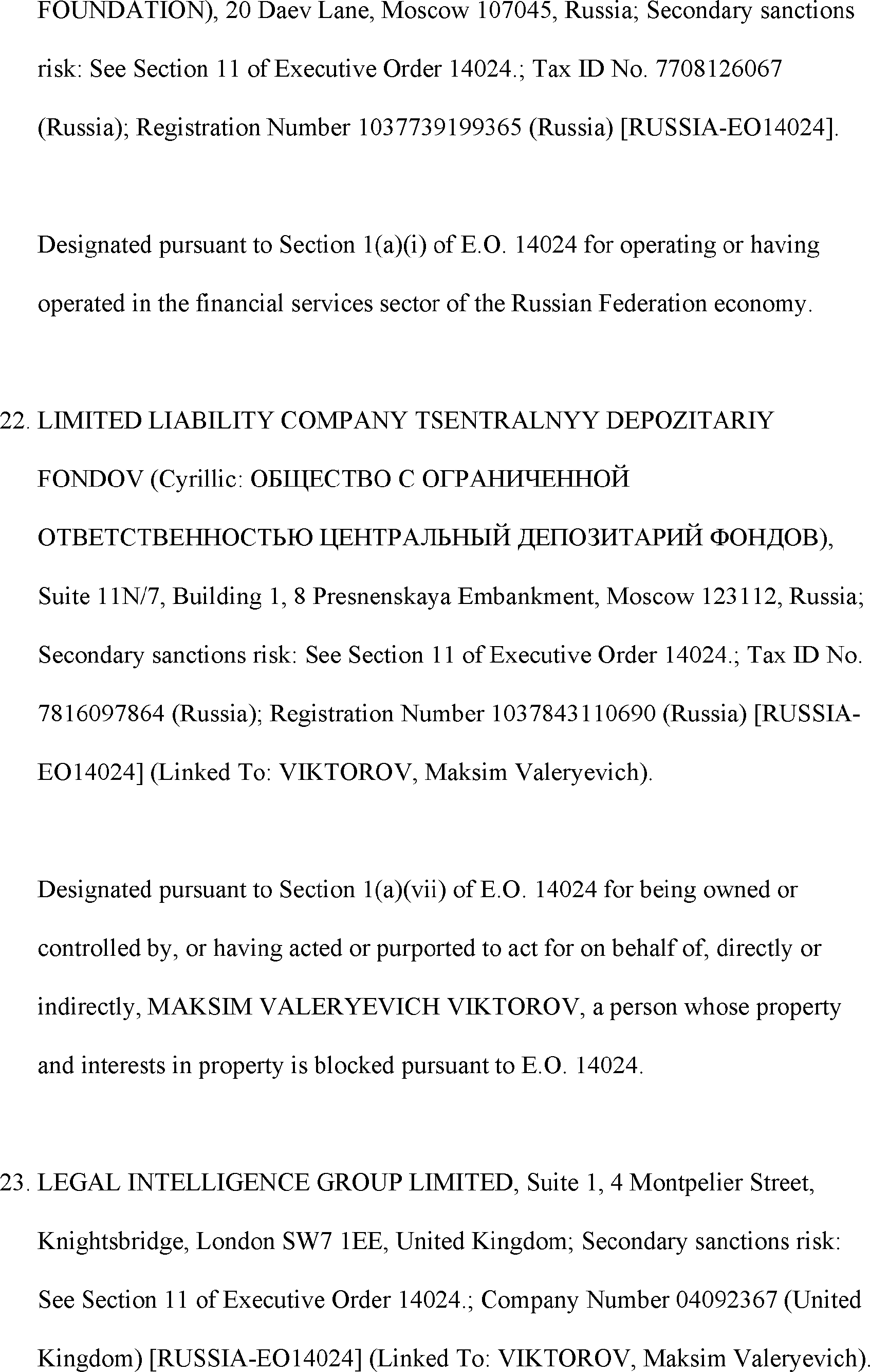The Department of State is publishing the names of one or more persons that have been placed on the Department of Treasury's List of Specially Designated Nationals and Blocked Persons (SDN List) administered by the Office of Foreign Asset Control (OFAC) based on the Department of State's determination, in consultation with other departments, as appropriate, that one or more applicable legal criteria of the Executive Order regarding blocking property with respect to specified harmful foreign activities of the Government of the Russian Federation were satisfied. All property and interests in property subject to U.S. jurisdiction of these persons are blocked, and U.S. persons are generally prohibited from engaging in transactions with them.