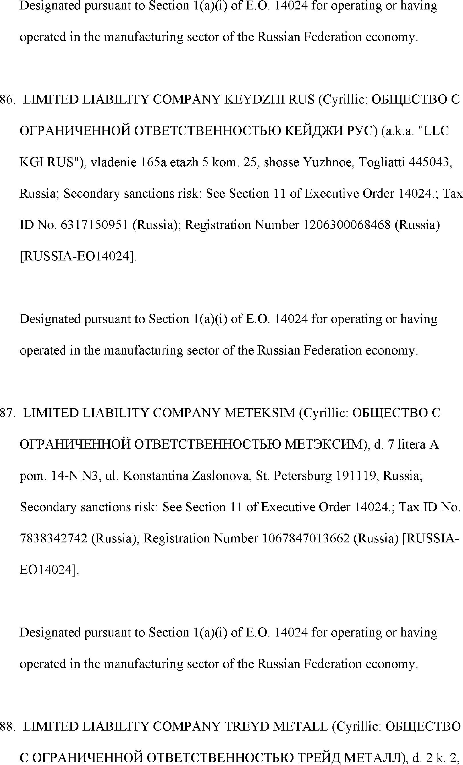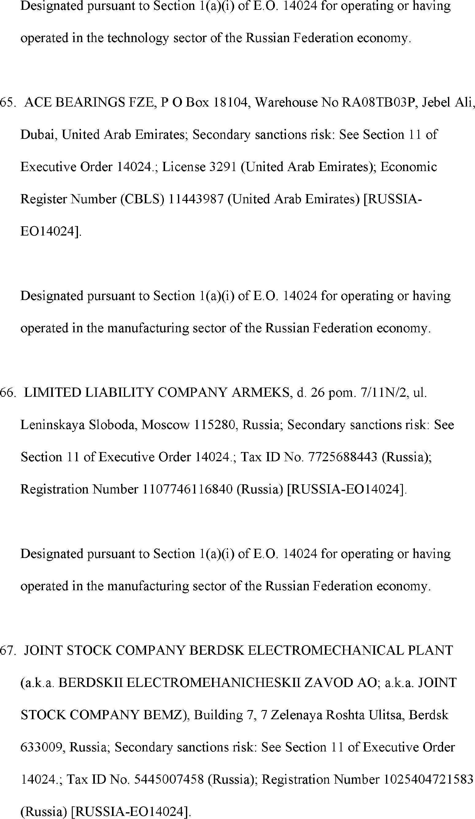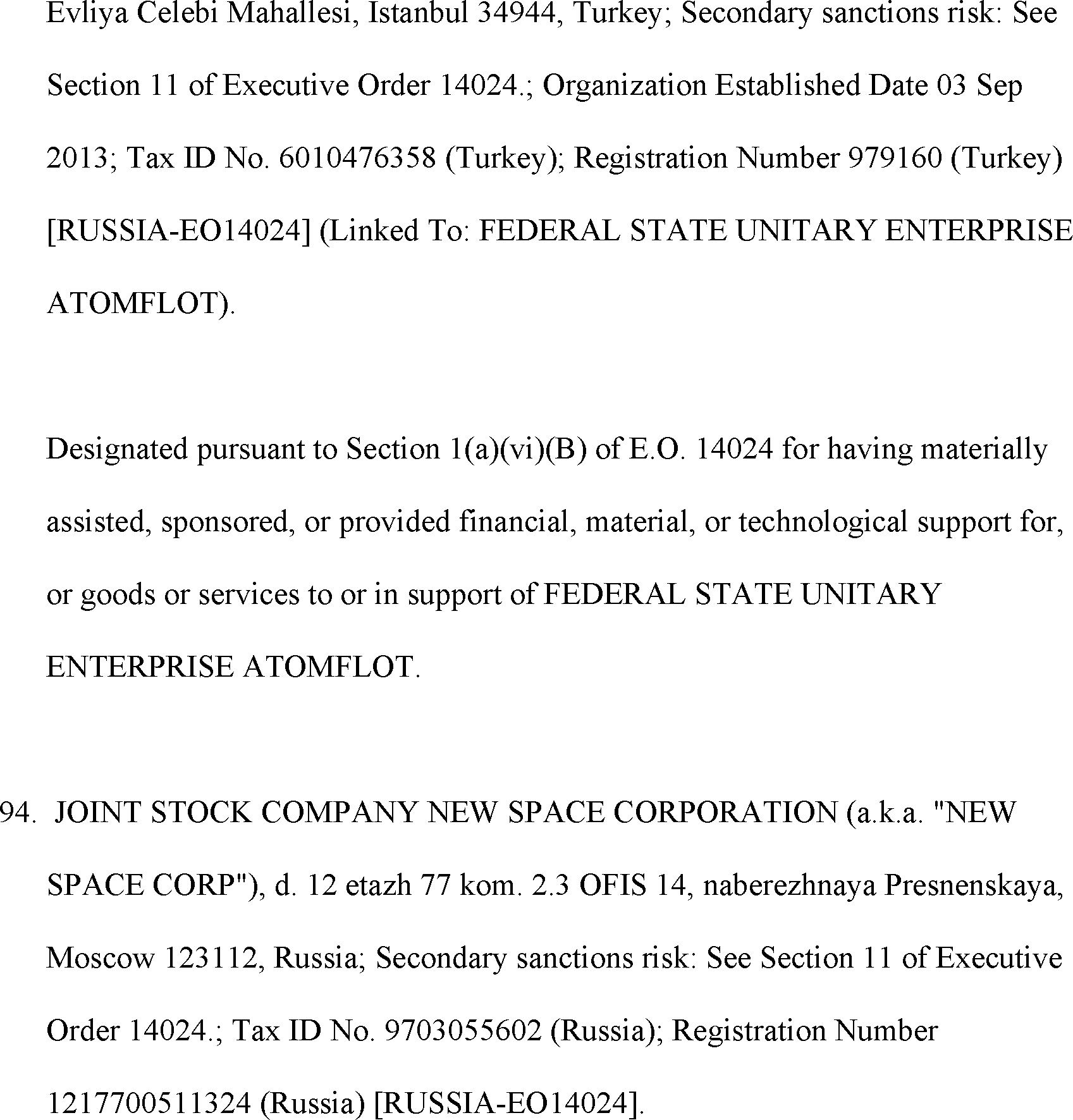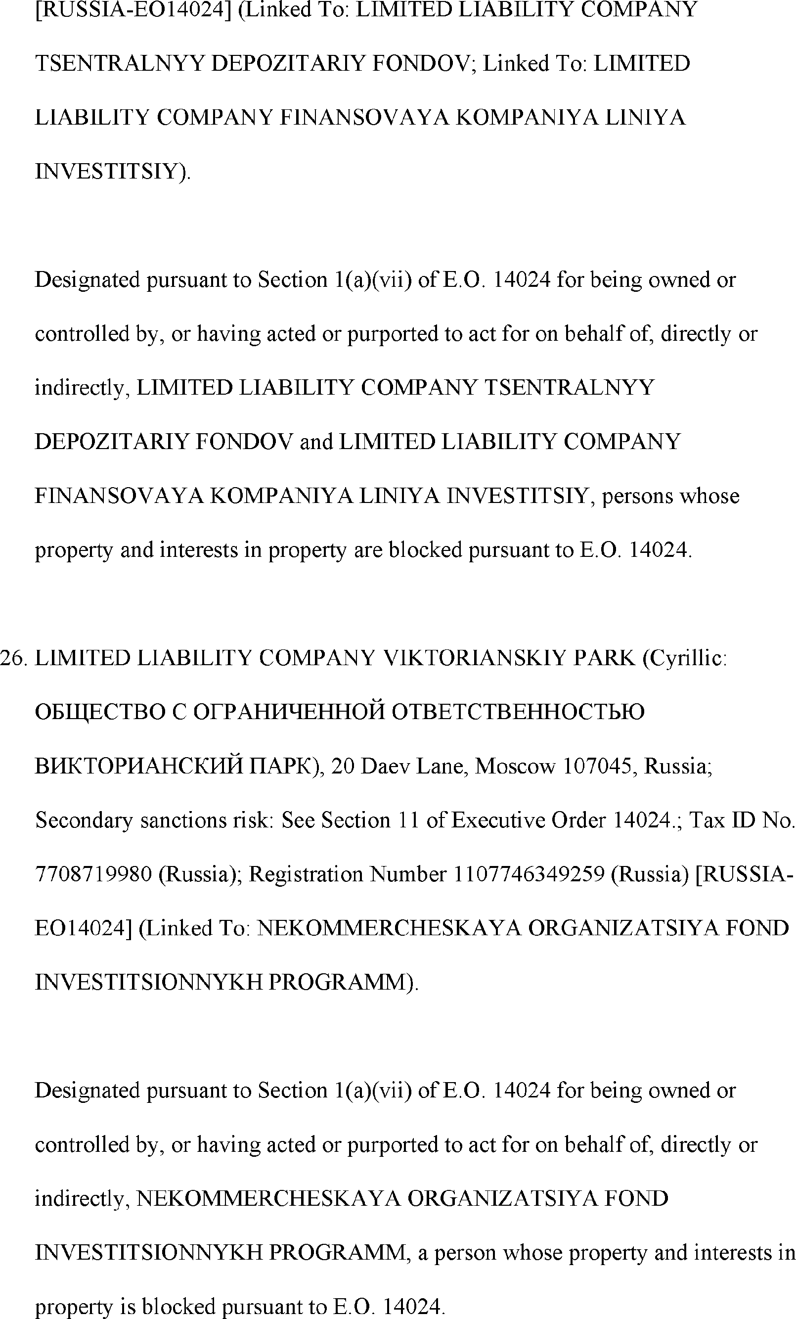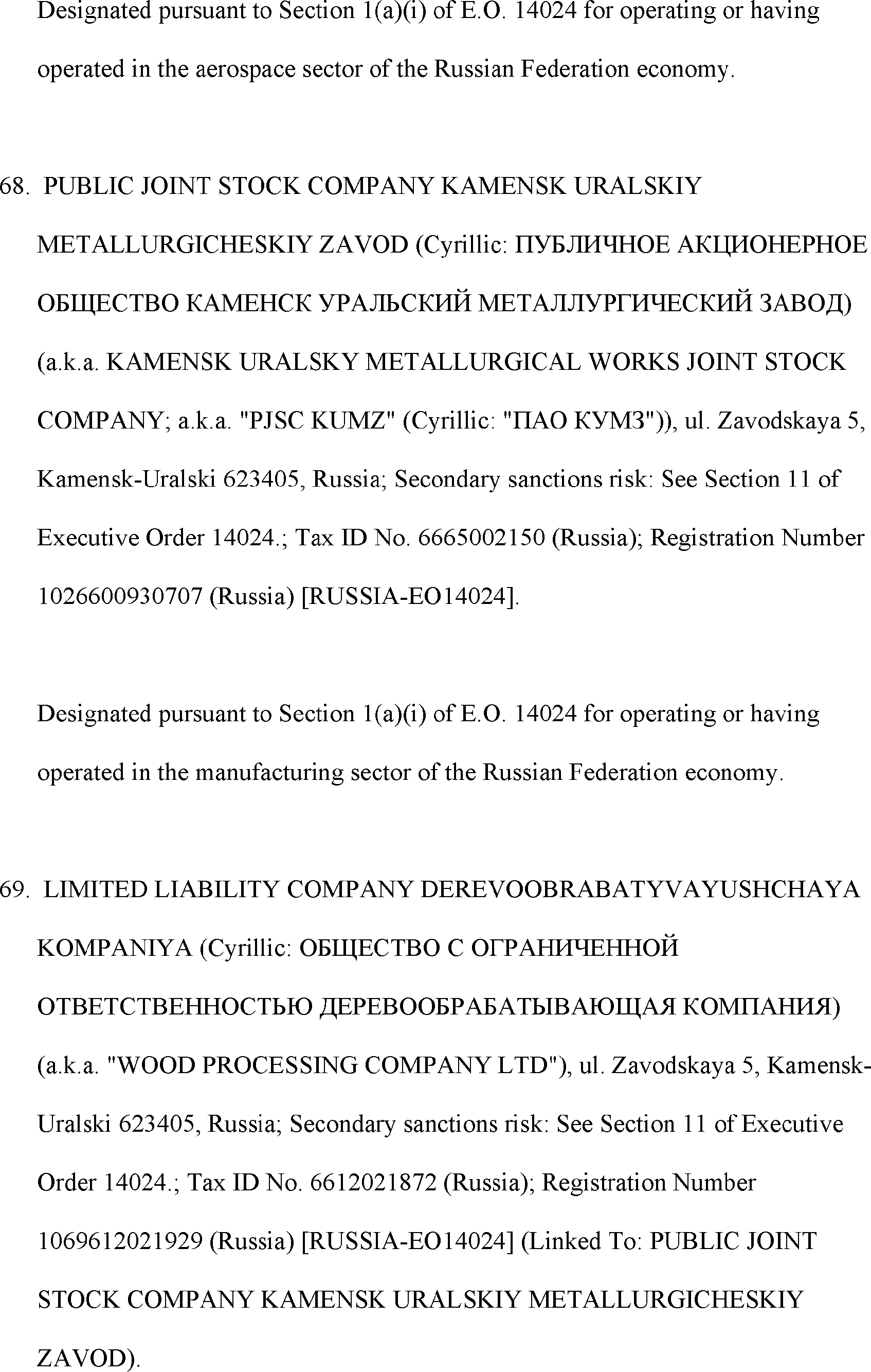 The Department of State is publishing the names of one or more persons that have been placed on the Department of Treasury's List of Specially Designated Nationals and Blocked Persons (SDN List) administered by the Office of Foreign Asset Control (OFAC) based on the Department of State's determination, in consultation with other departments, as appropriate, that one or more applicable legal criteria of the Executive Order regarding blocking property with respect to specified harmful foreign activities of the Government of the Russian Federation were satisfied. All property and interests in property subject to U.S. jurisdiction of these persons are blocked, and U.S. persons are generally prohibited from engaging in transactions with them.