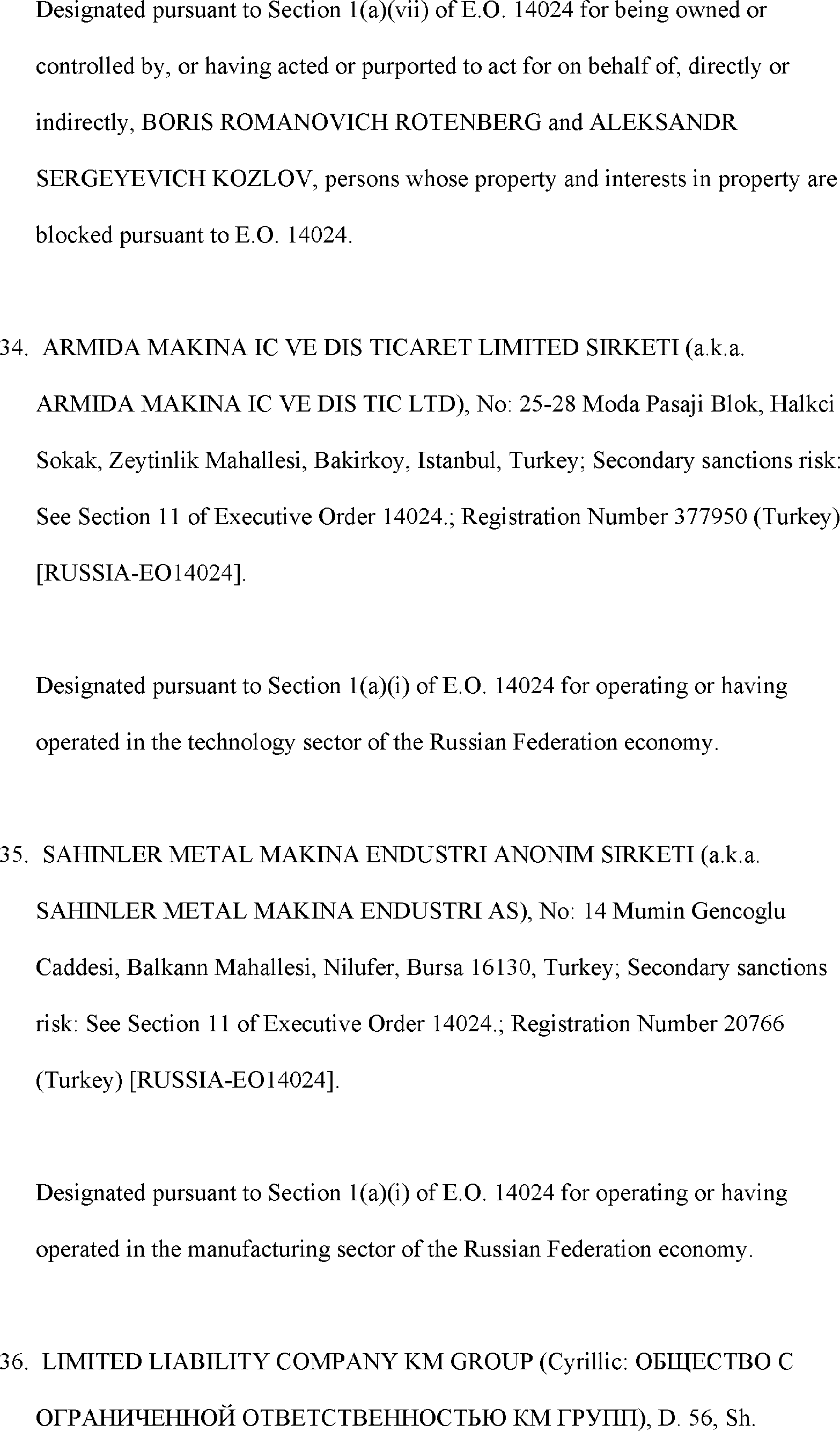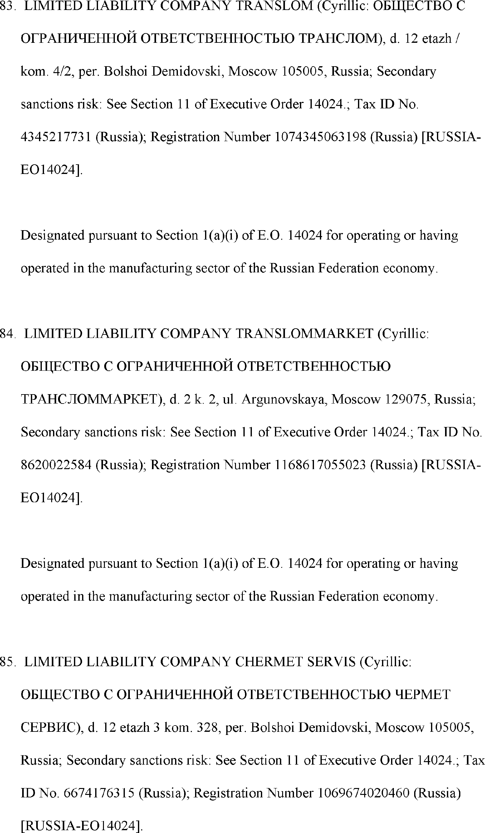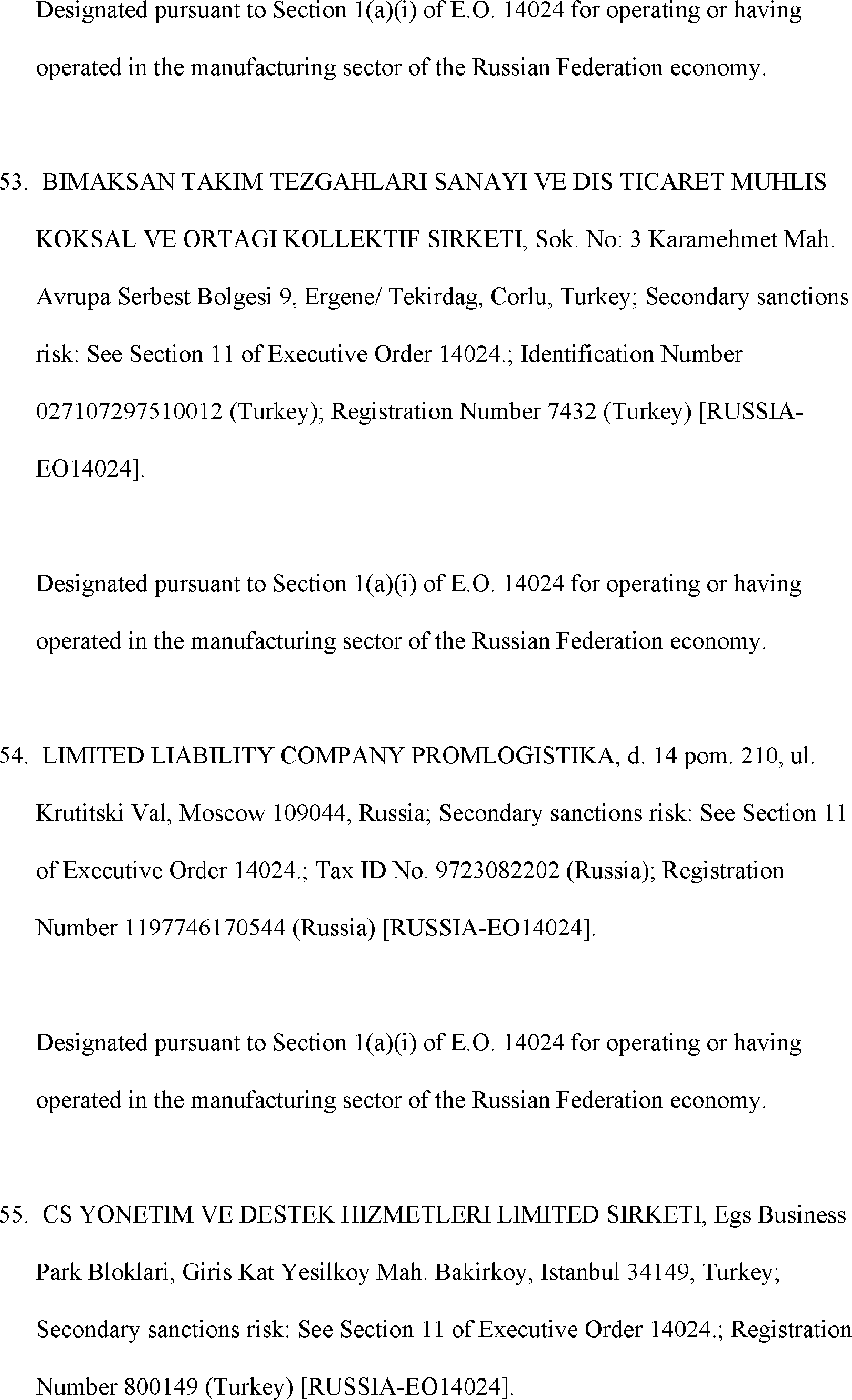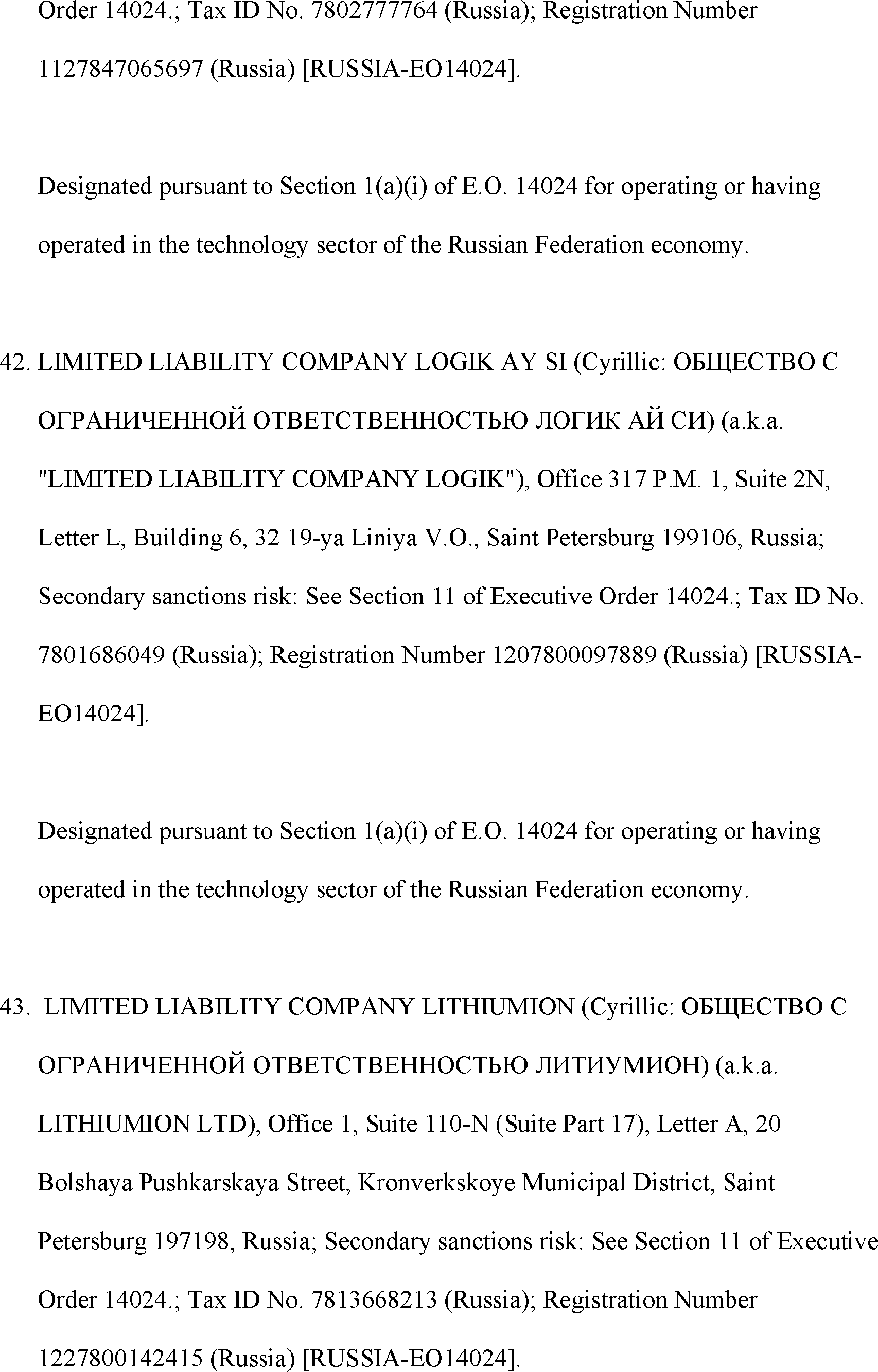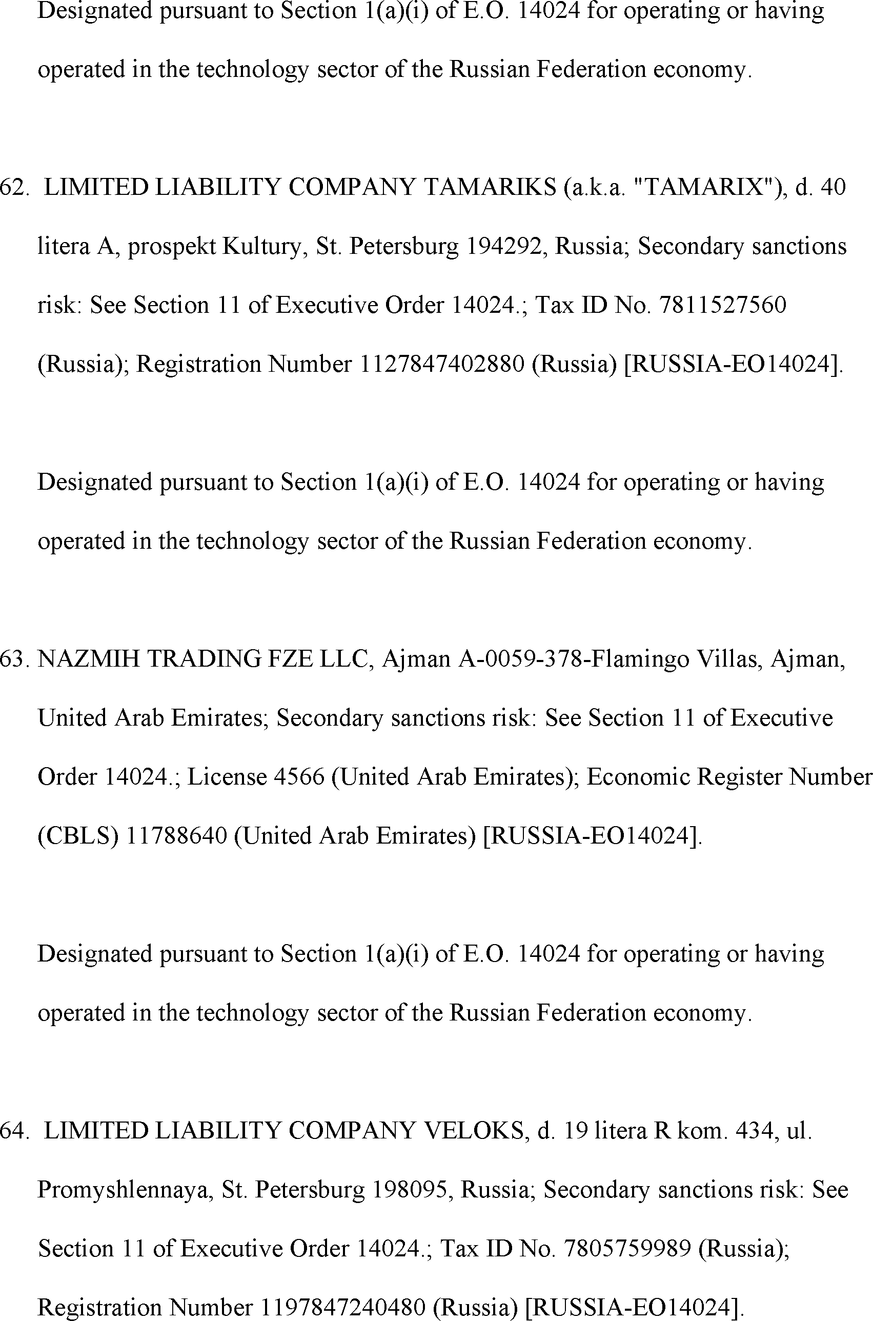 The Department of State is publishing the names of one or more persons that have been placed on the Department of Treasury's List of Specially Designated Nationals and Blocked Persons (SDN List) administered by the Office of Foreign Asset Control (OFAC) based on the Department of State's determination, in consultation with other departments, as appropriate, that one or more applicable legal criteria of the Executive Order regarding blocking property with respect to specified harmful foreign activities of the Government of the Russian Federation were satisfied. All property and interests in property subject to U.S. jurisdiction of these persons are blocked, and U.S. persons are generally prohibited from engaging in transactions with them.