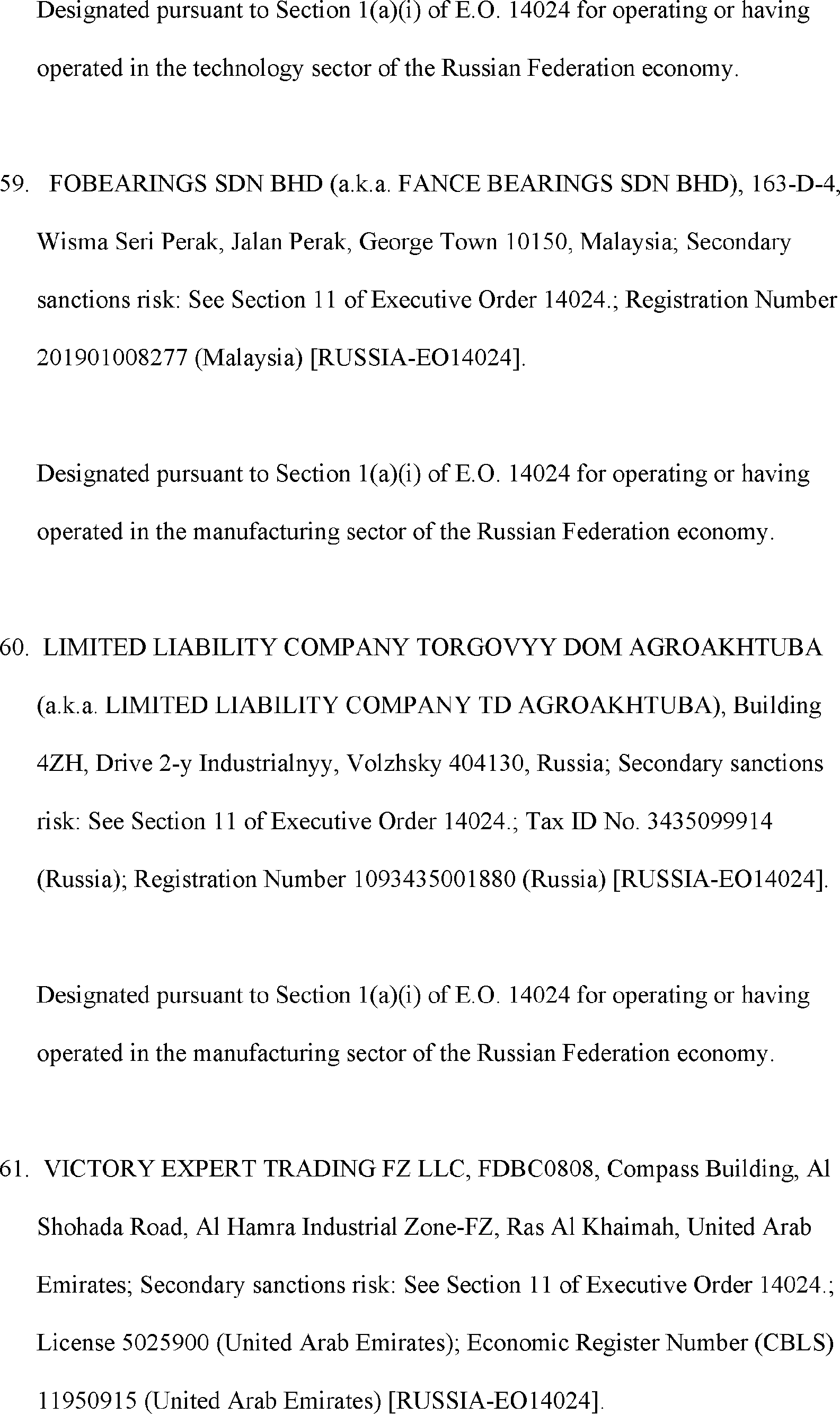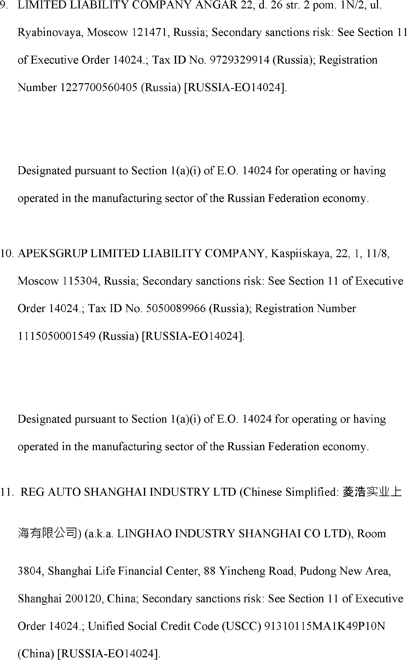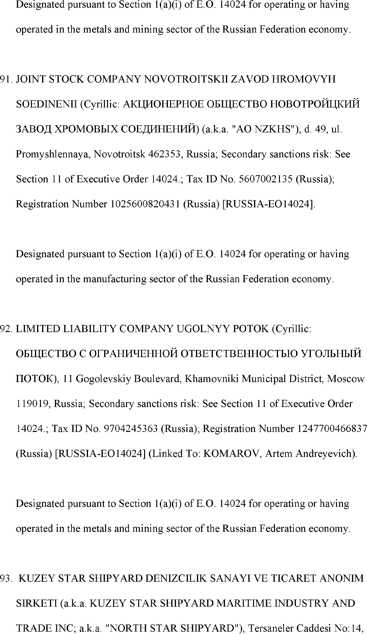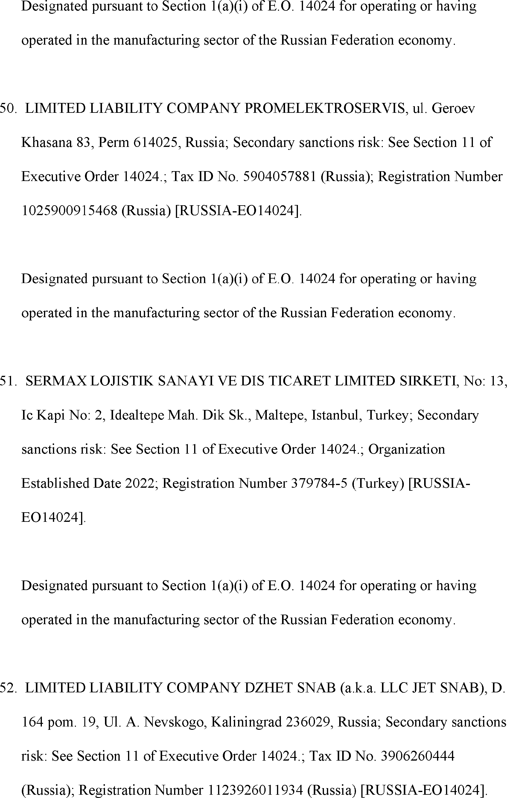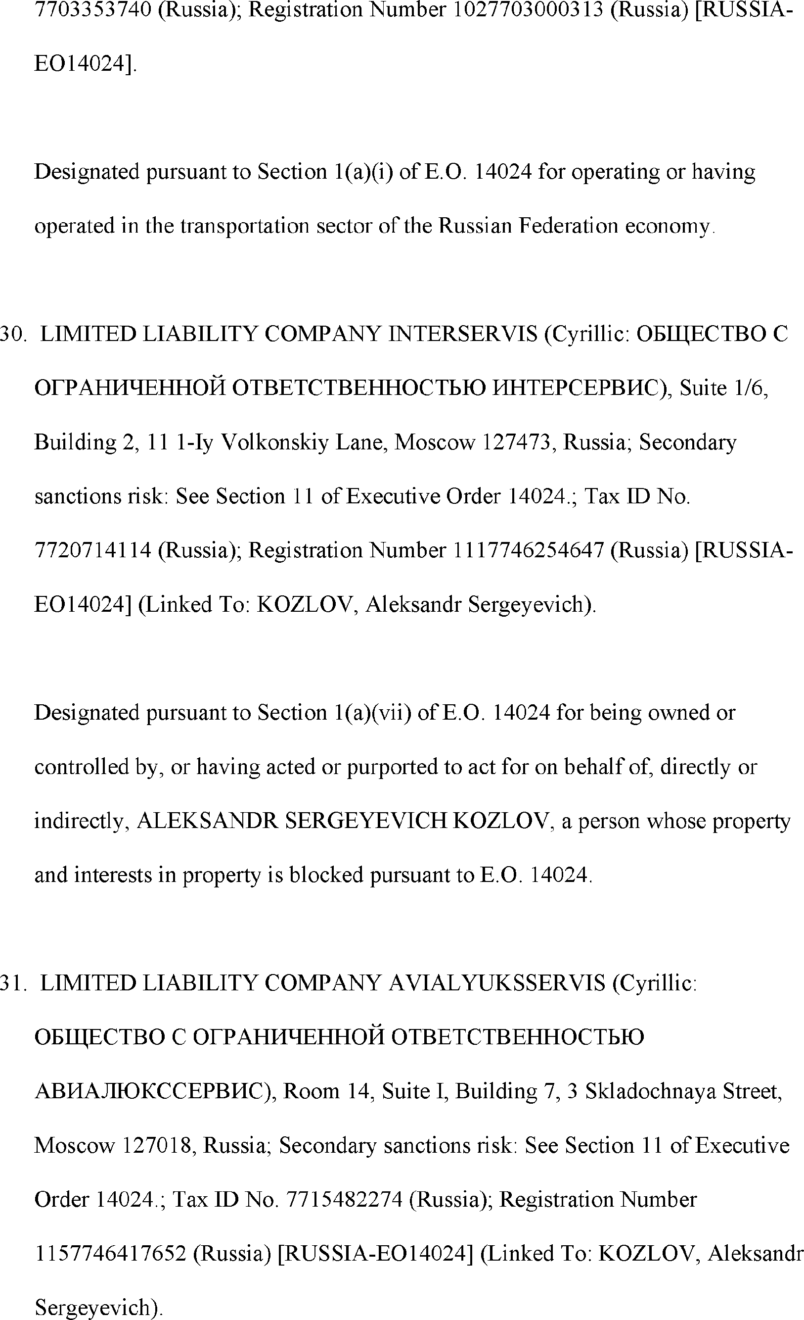 The Department of State is publishing the names of one or more persons that have been placed on the Department of Treasury's List of Specially Designated Nationals and Blocked Persons (SDN List) administered by the Office of Foreign Asset Control (OFAC) based on the Department of State's determination, in consultation with other departments, as appropriate, that one or more applicable legal criteria of the Executive Order regarding blocking property with respect to specified harmful foreign activities of the Government of the Russian Federation were satisfied. All property and interests in property subject to U.S. jurisdiction of these persons are blocked, and U.S. persons are generally prohibited from engaging in transactions with them.