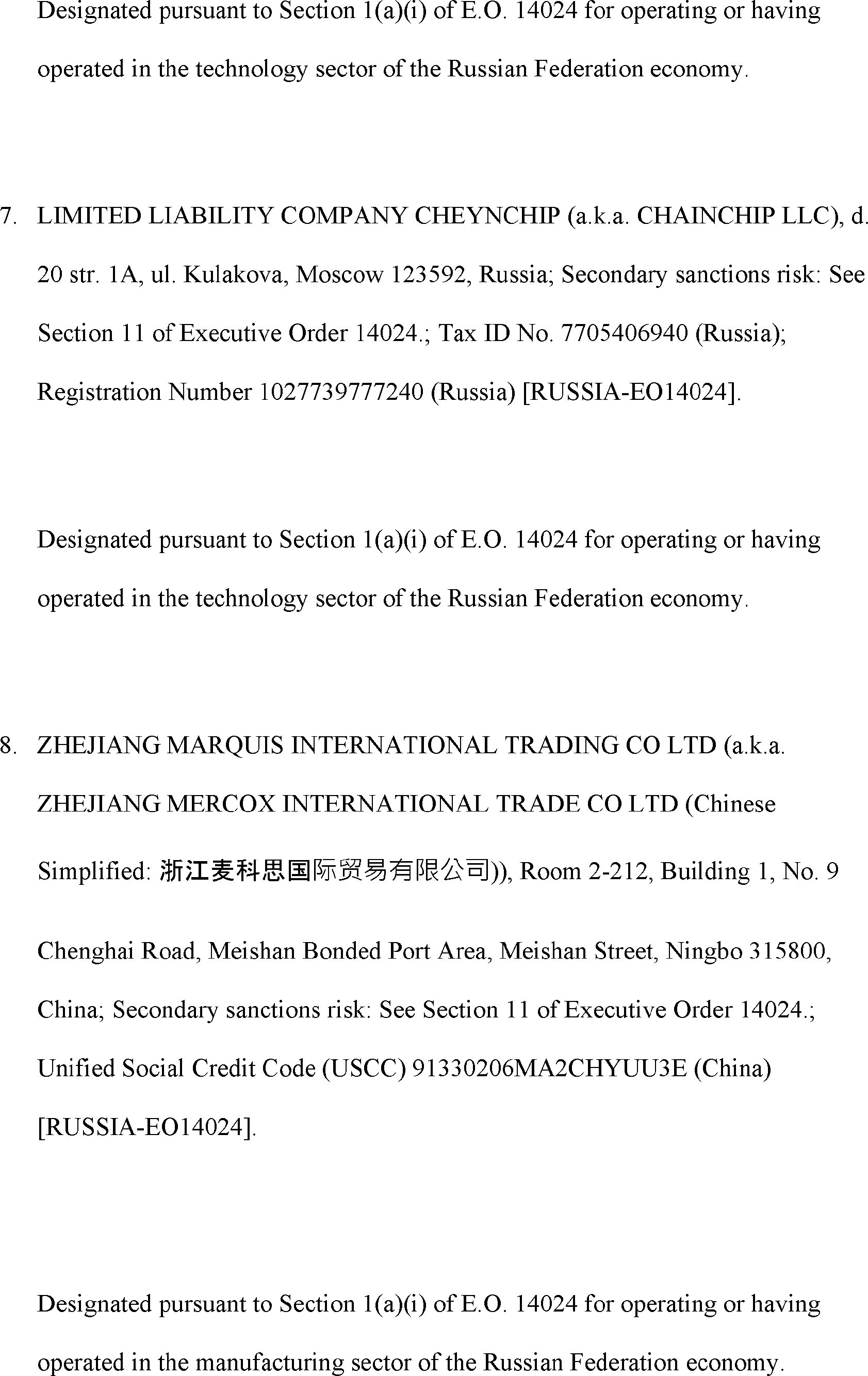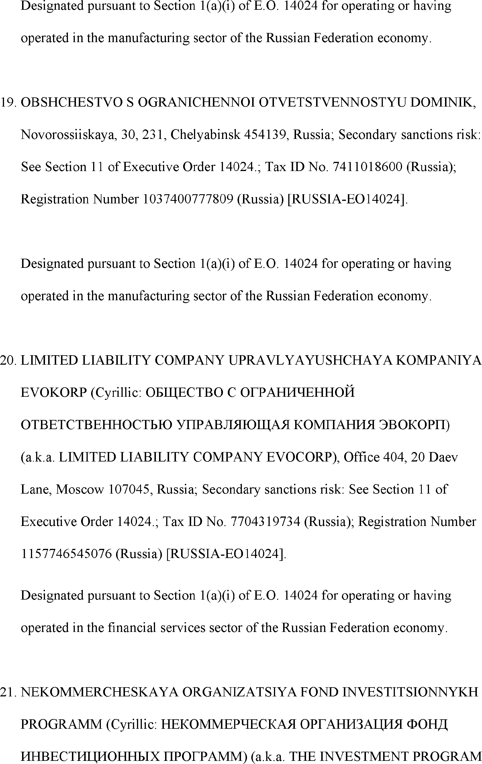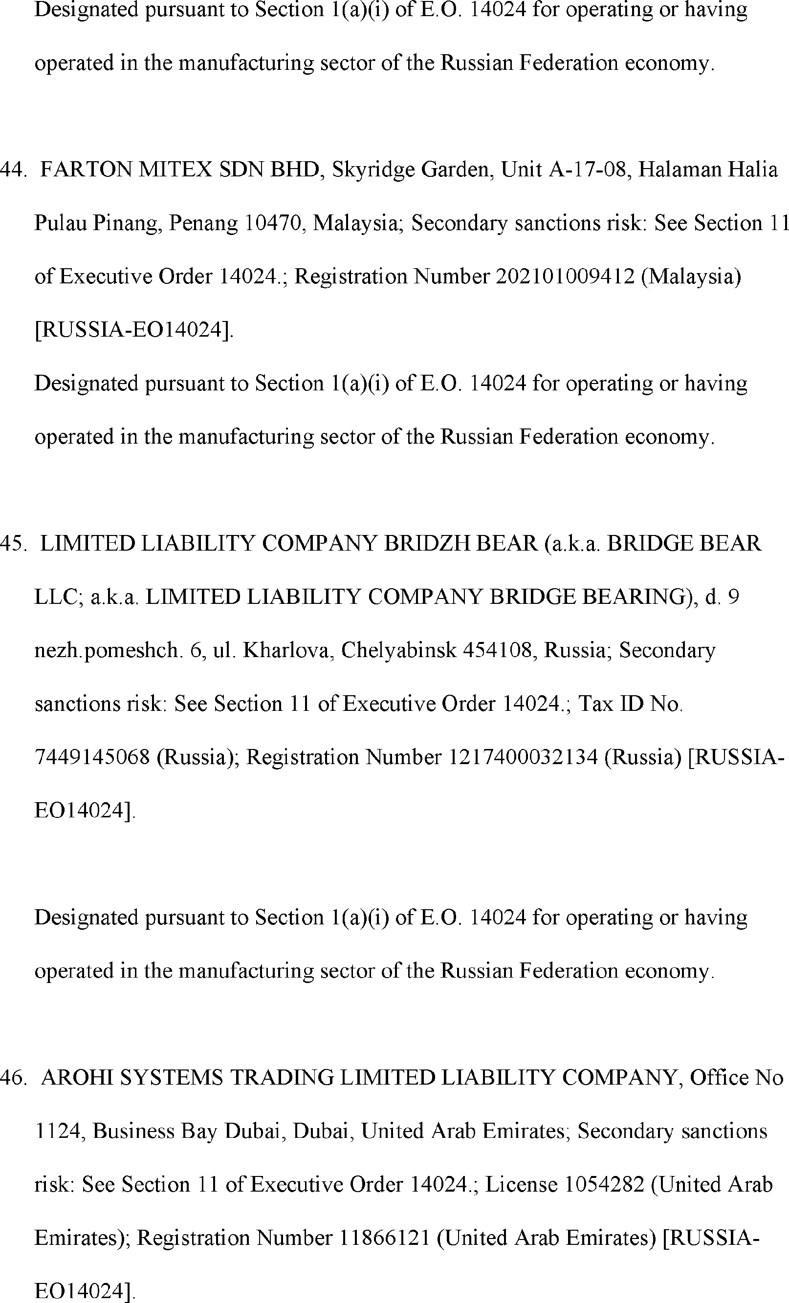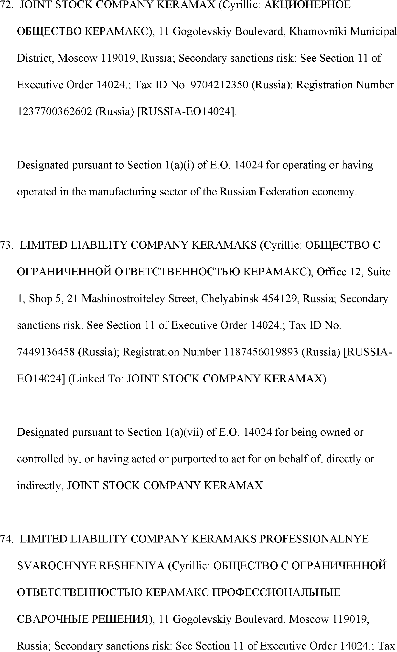 The Department of State is publishing the names of one or more persons that have been placed on the Department of Treasury's List of Specially Designated Nationals and Blocked Persons (SDN List) administered by the Office of Foreign Asset Control (OFAC) based on the Department of State's determination, in consultation with other departments, as appropriate, that one or more applicable legal criteria of the Executive Order regarding blocking property with respect to specified harmful foreign activities of the Government of the Russian Federation were satisfied. All property and interests in property subject to U.S. jurisdiction of these persons are blocked, and U.S. persons are generally prohibited from engaging in transactions with them.