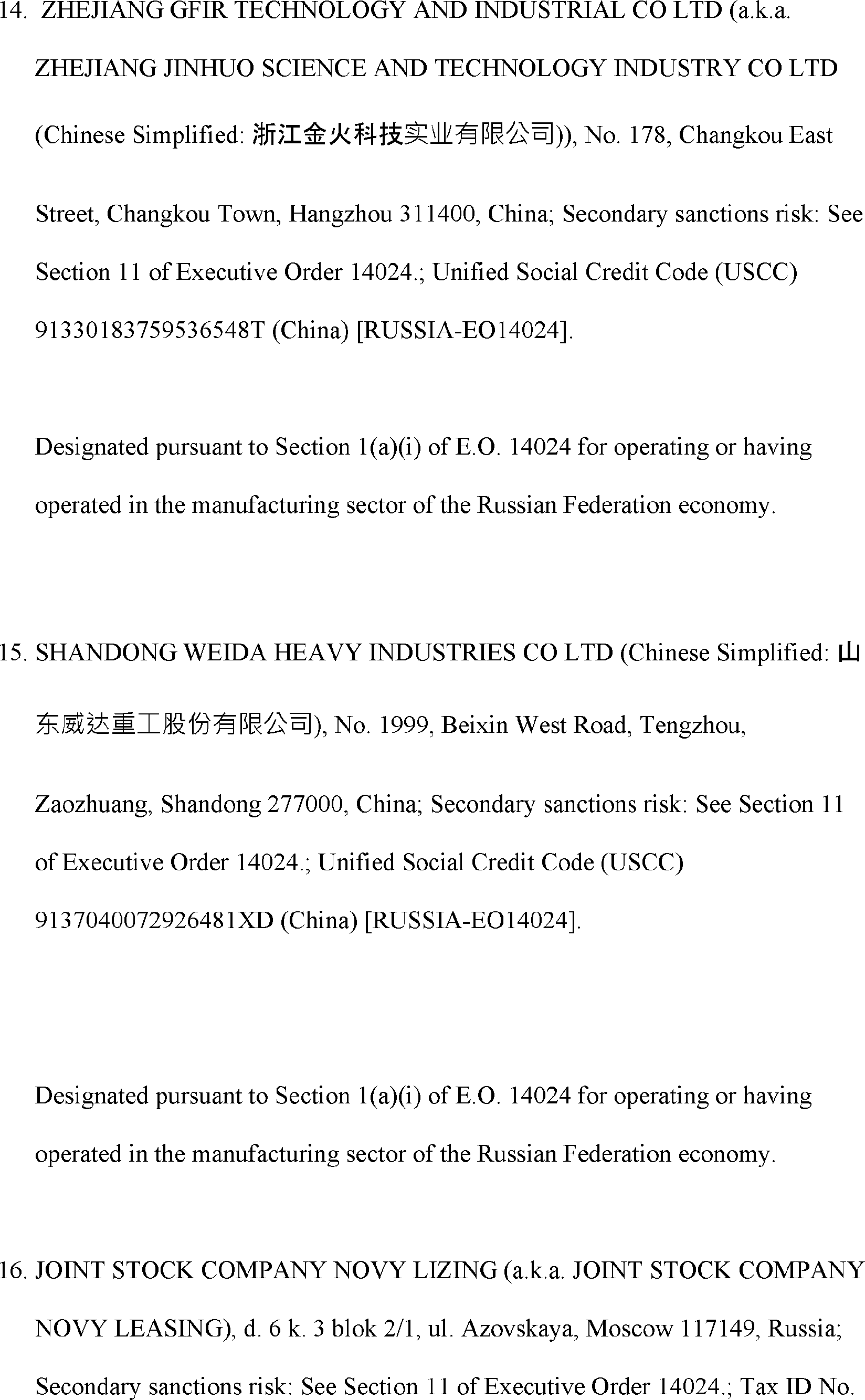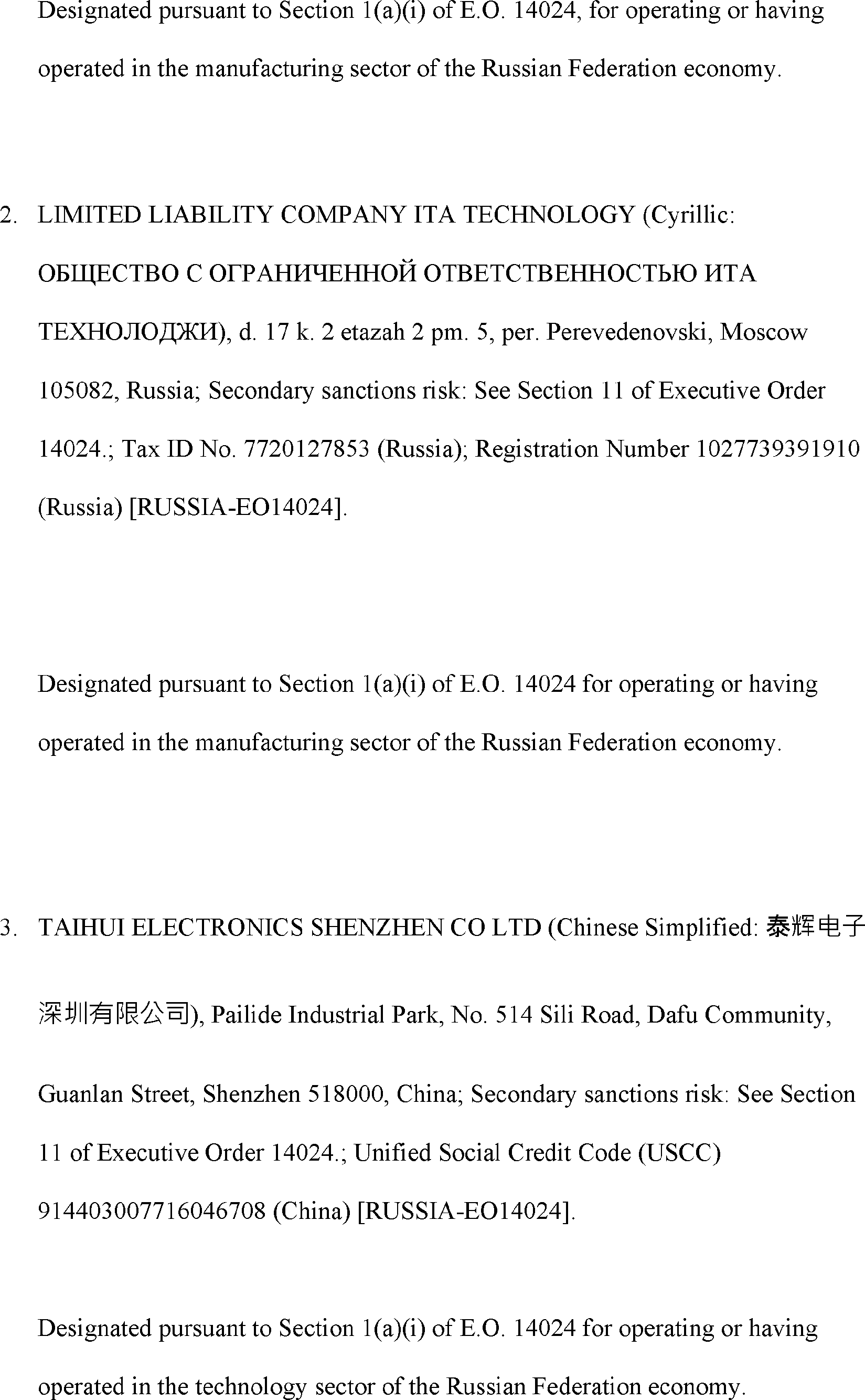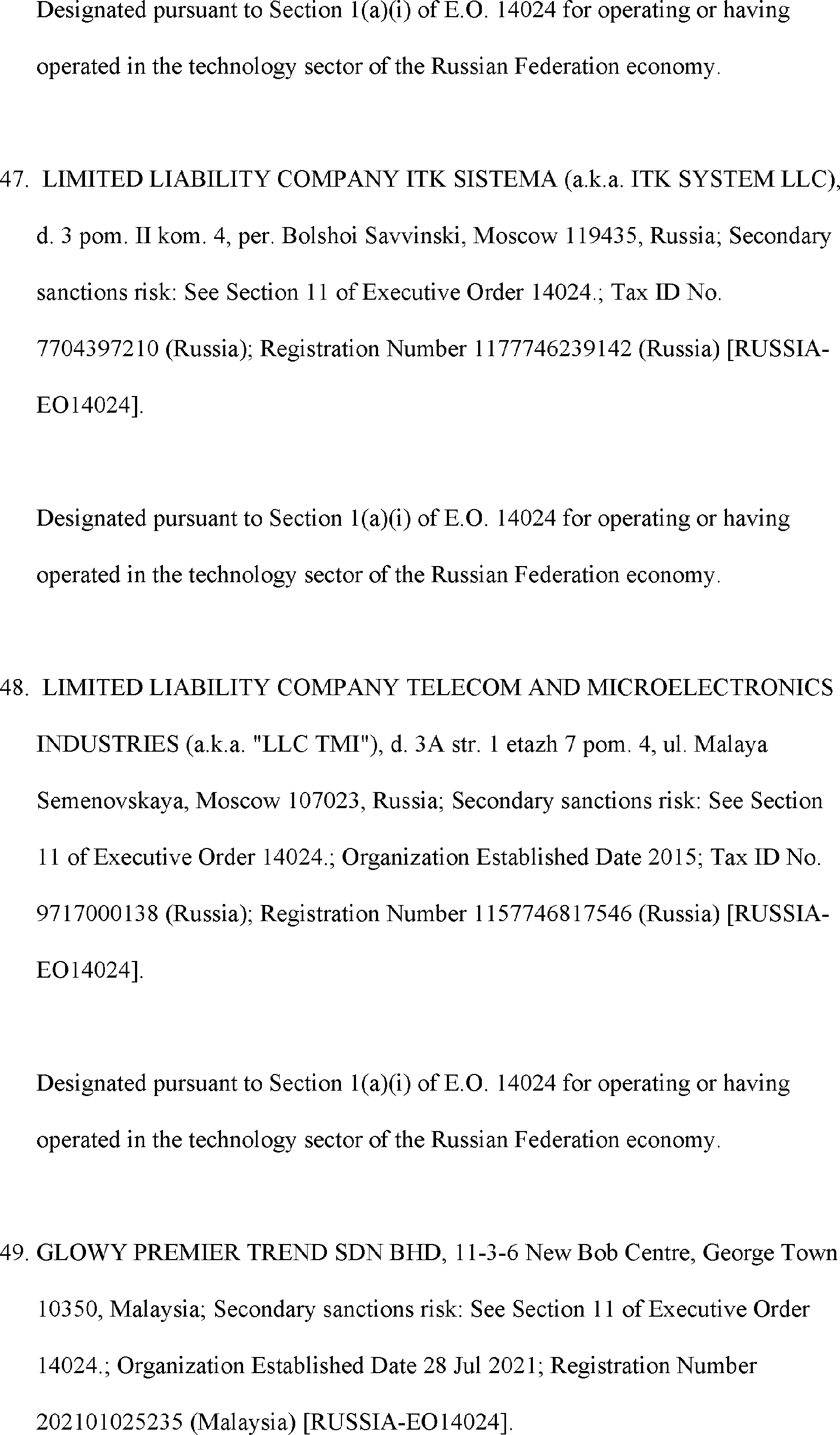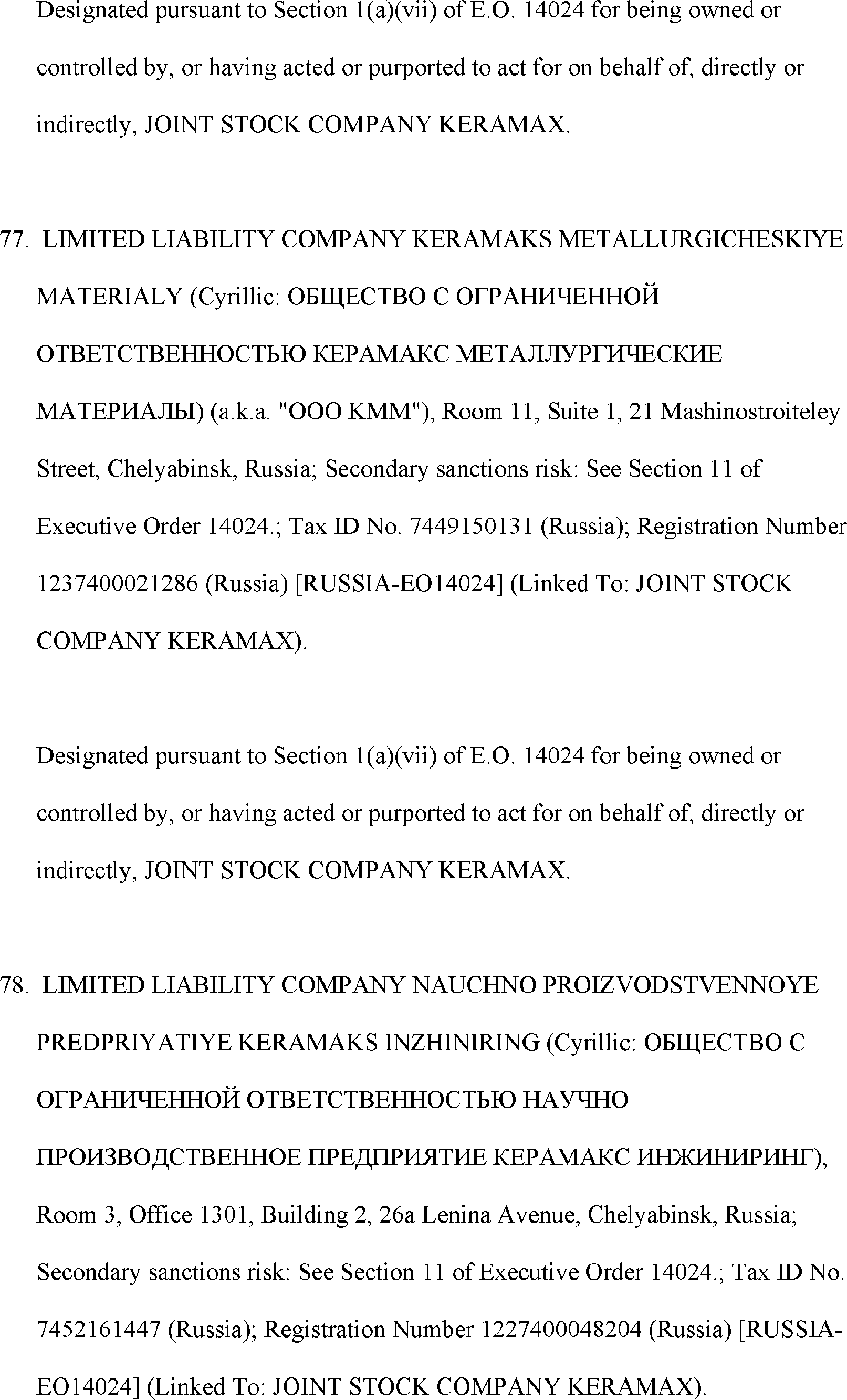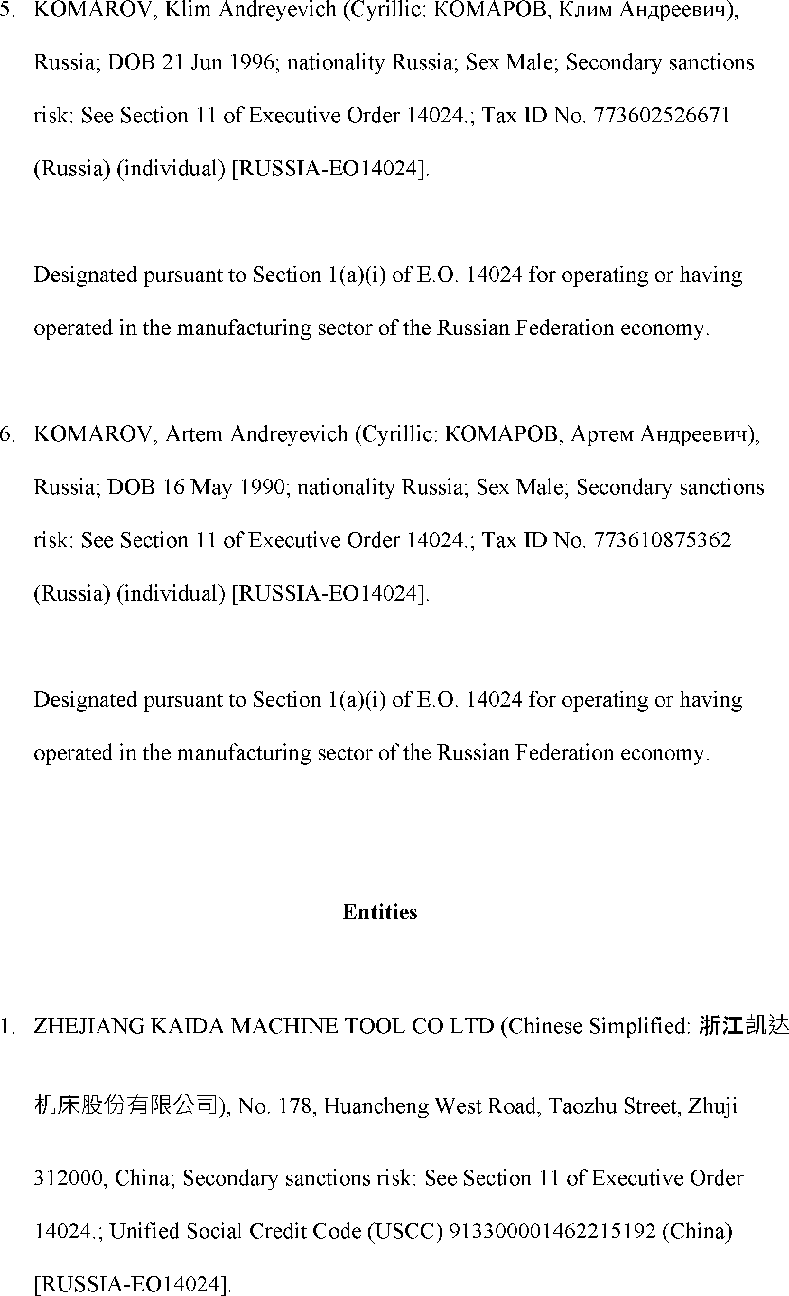 The Department of State is publishing the names of one or more persons that have been placed on the Department of Treasury's List of Specially Designated Nationals and Blocked Persons (SDN List) administered by the Office of Foreign Asset Control (OFAC) based on the Department of State's determination, in consultation with other departments, as appropriate, that one or more applicable legal criteria of the Executive Order regarding blocking property with respect to specified harmful foreign activities of the Government of the Russian Federation were satisfied. All property and interests in property subject to U.S. jurisdiction of these persons are blocked, and U.S. persons are generally prohibited from engaging in transactions with them.