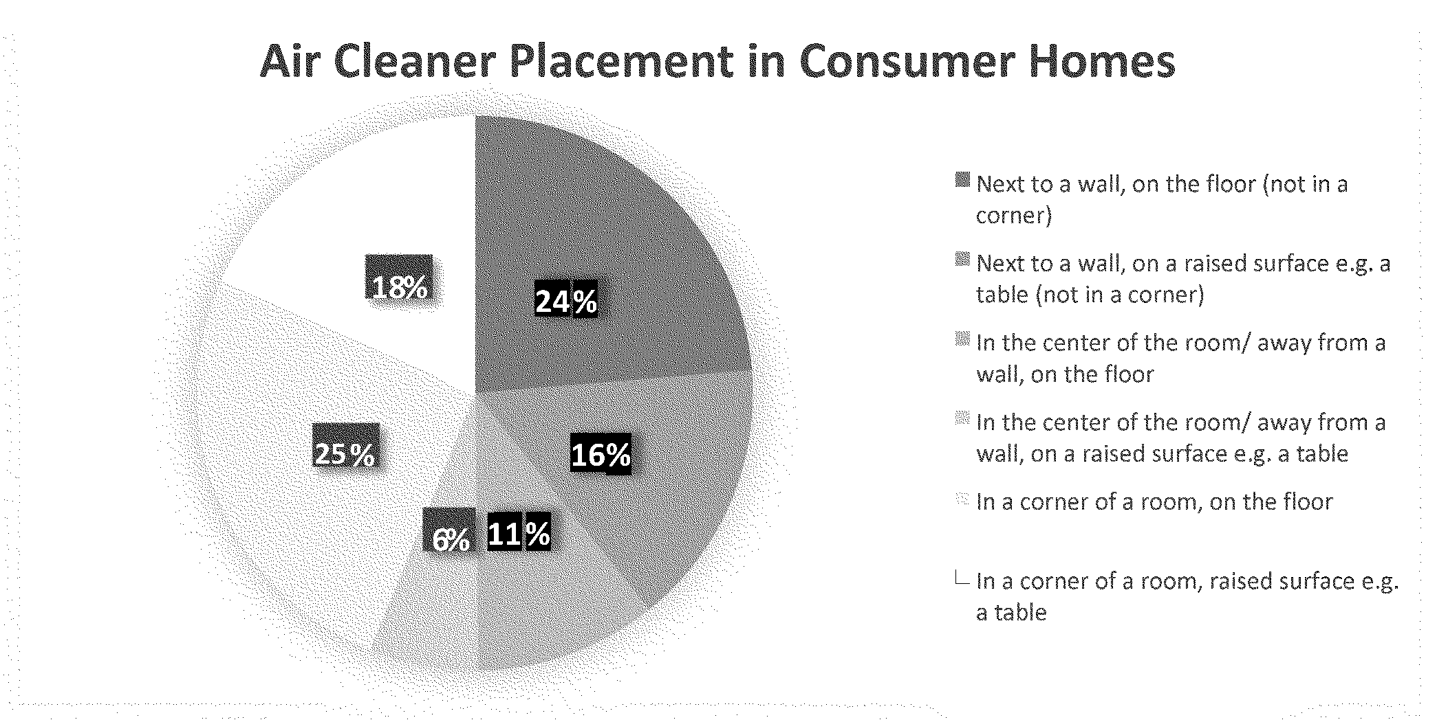 and perhaps purchase this product. However, when this consumer uses Product C in his home, he will not be using the product in the same conditions as found in the AHAM CADR Test chamber: he will not have a powerful recirculation fan and will likely place the product in the corner of an average-sized room—introducing simple real-world conditions that are not accounted for by the AHAM CADR Test and not reflected in room size coverage claims and IEF scores calculated using CADR.