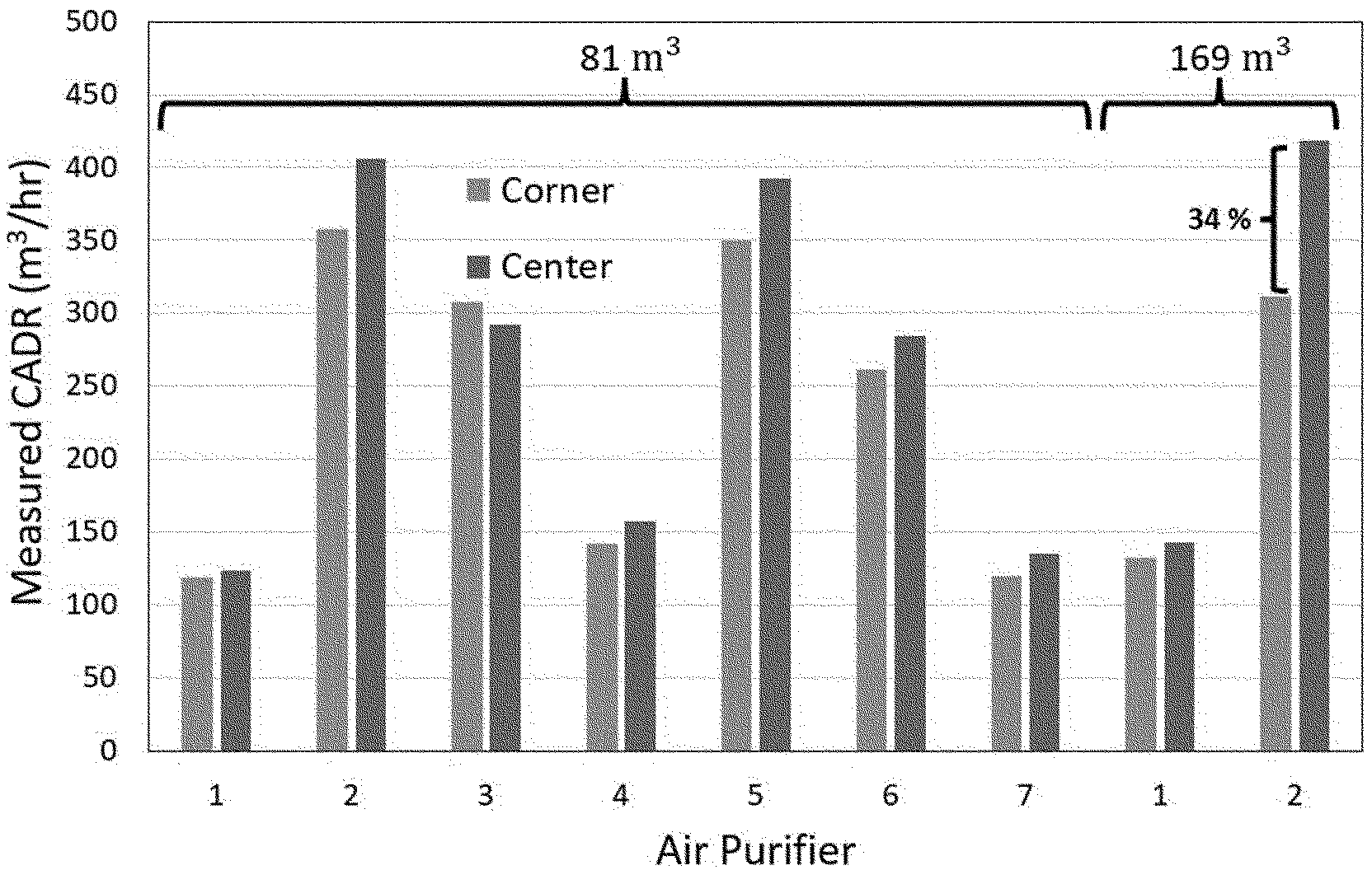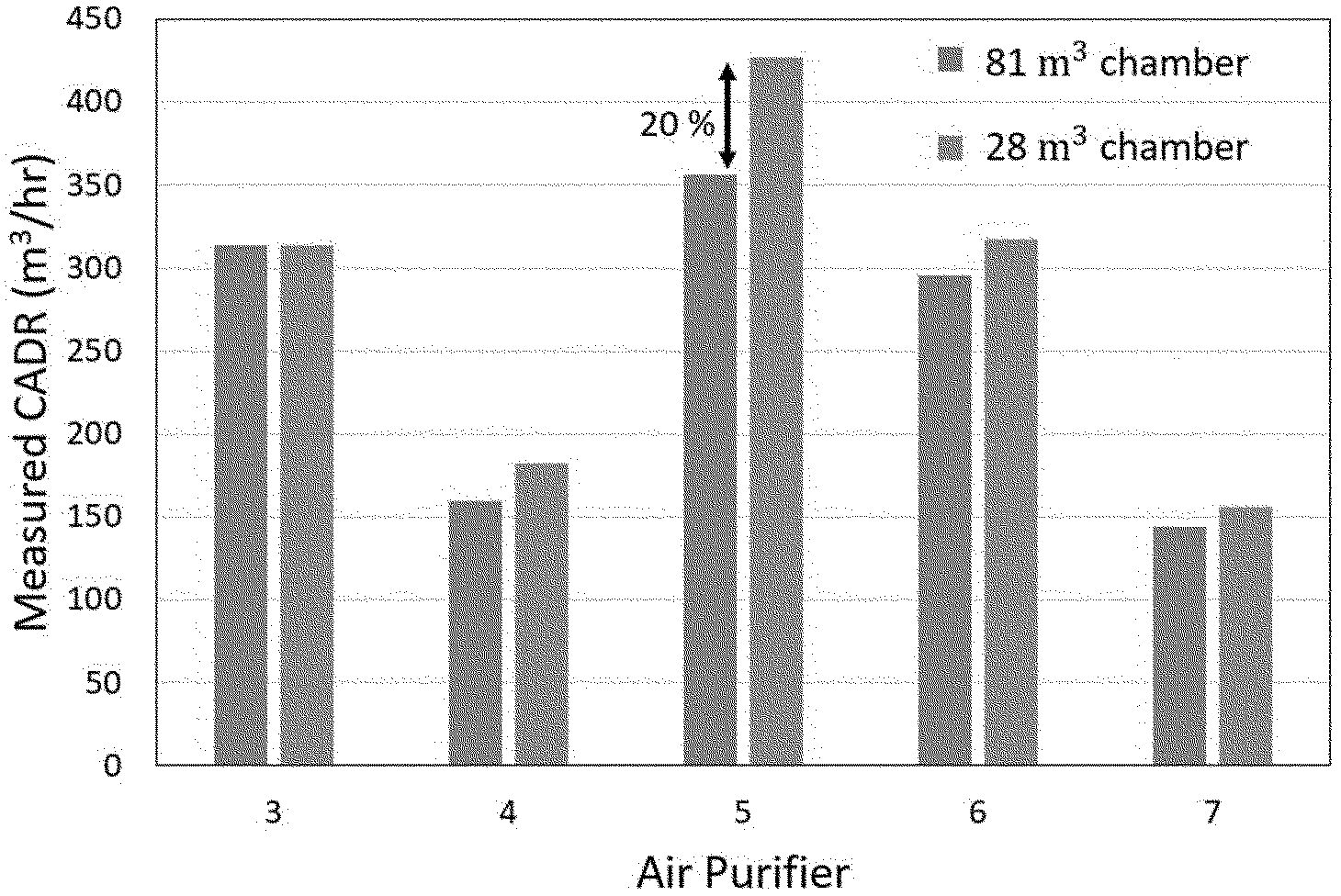 See id. CADR for various air cleaners tested in a 28 and 81 m3 chamber. Testing in different test chamber sizes can result in a 16% difference in CADR.