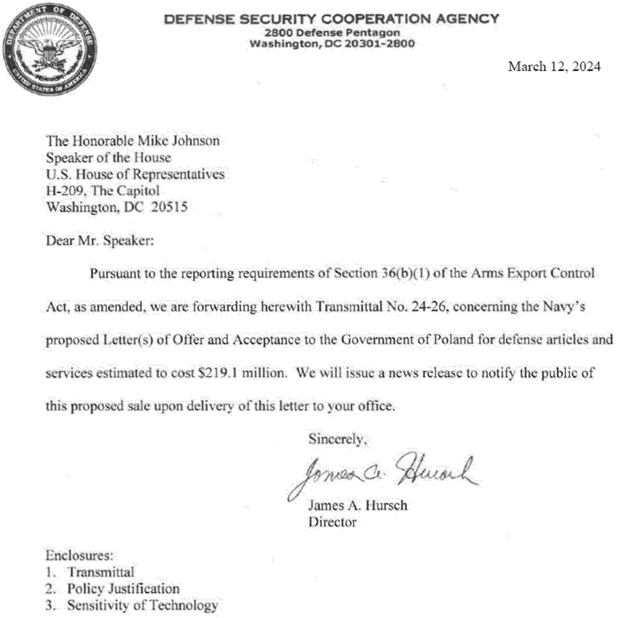 This 36(b)(1) arms sales notification is published to fulfill the requirements of section 155 of Public Law 104-164 dated July 21, 1996. The following is a copy of a letter to the Speaker of the House of Representatives with attached Transmittal 24-26, Policy Justification, and Sensitivity of Technology.