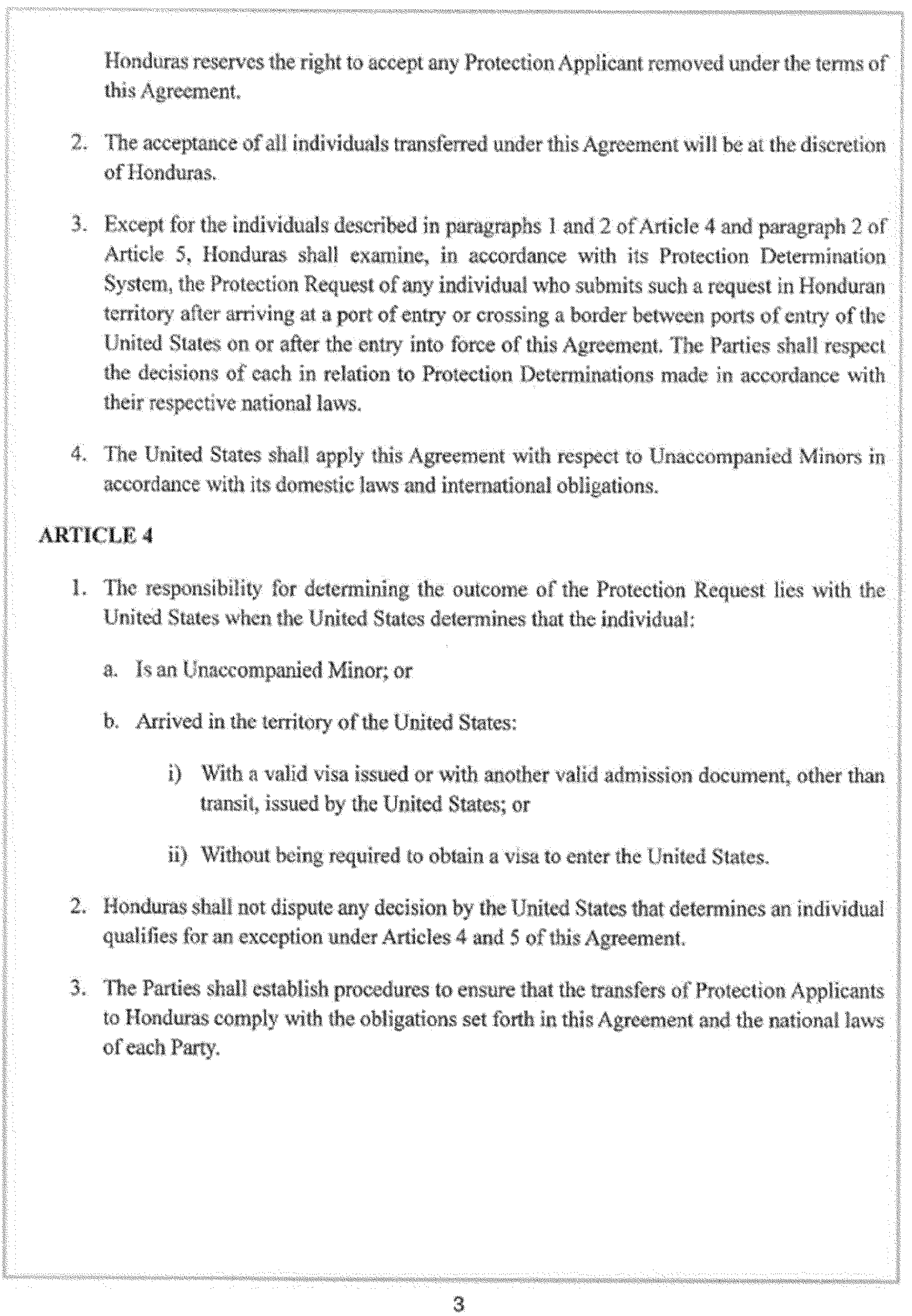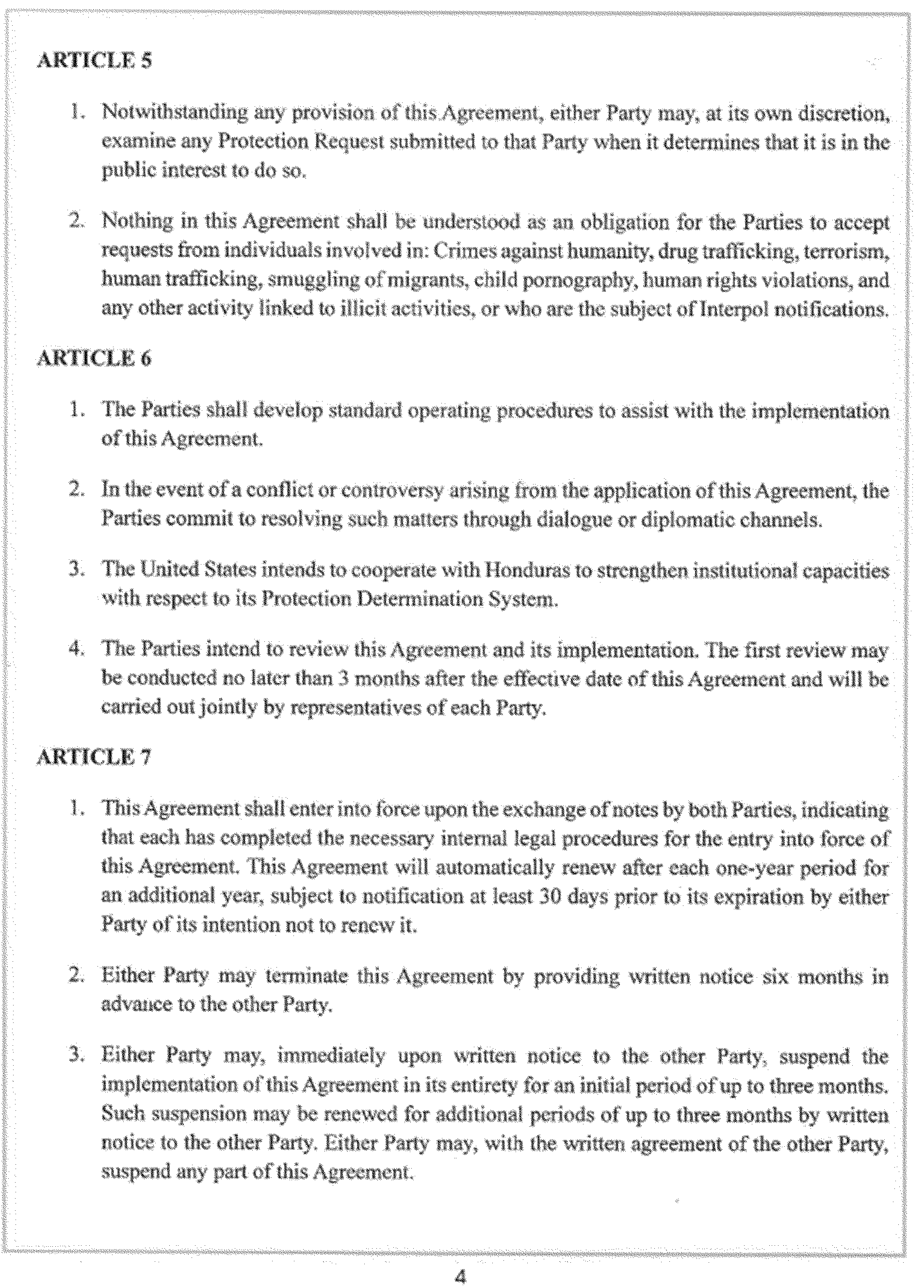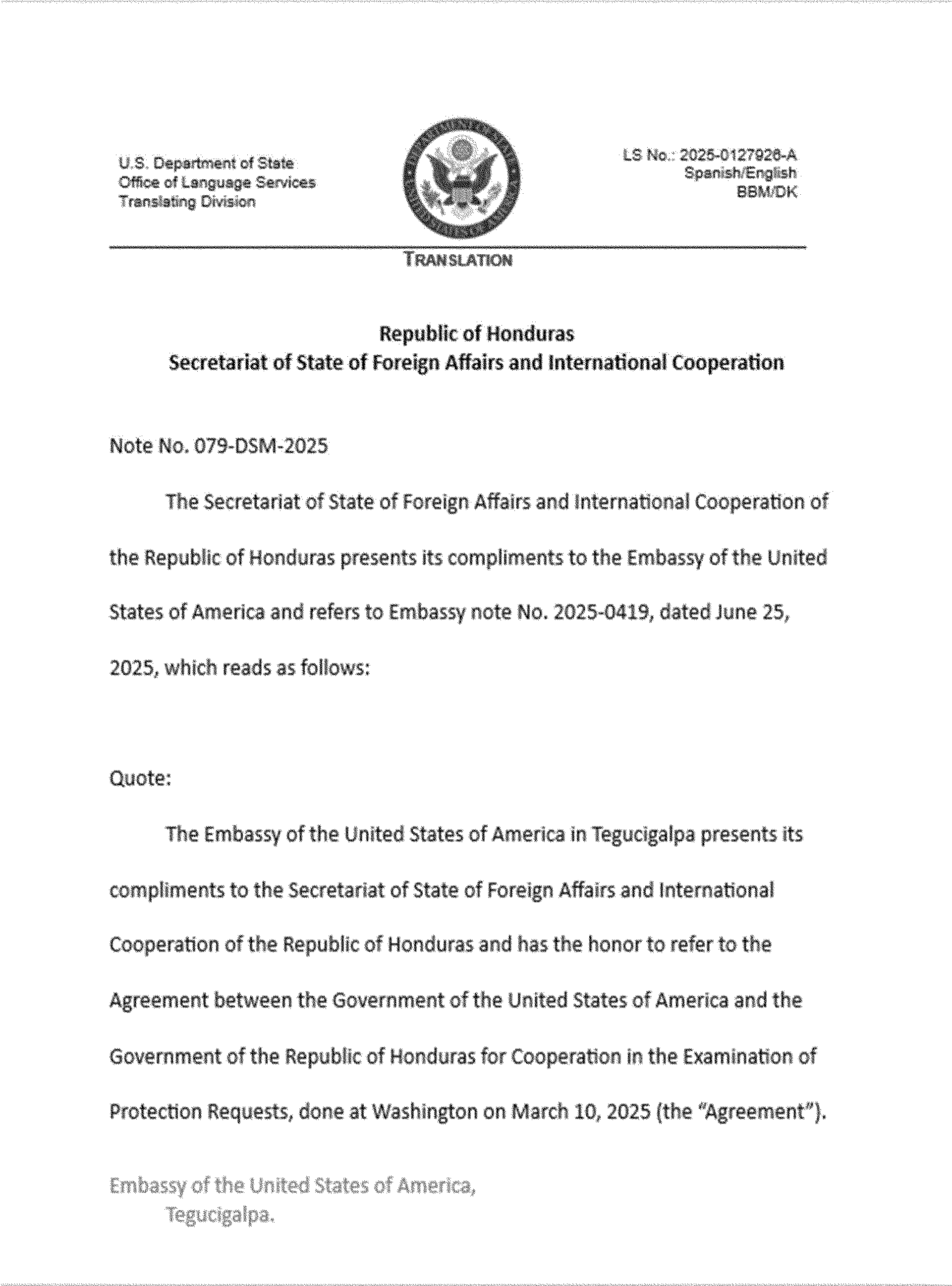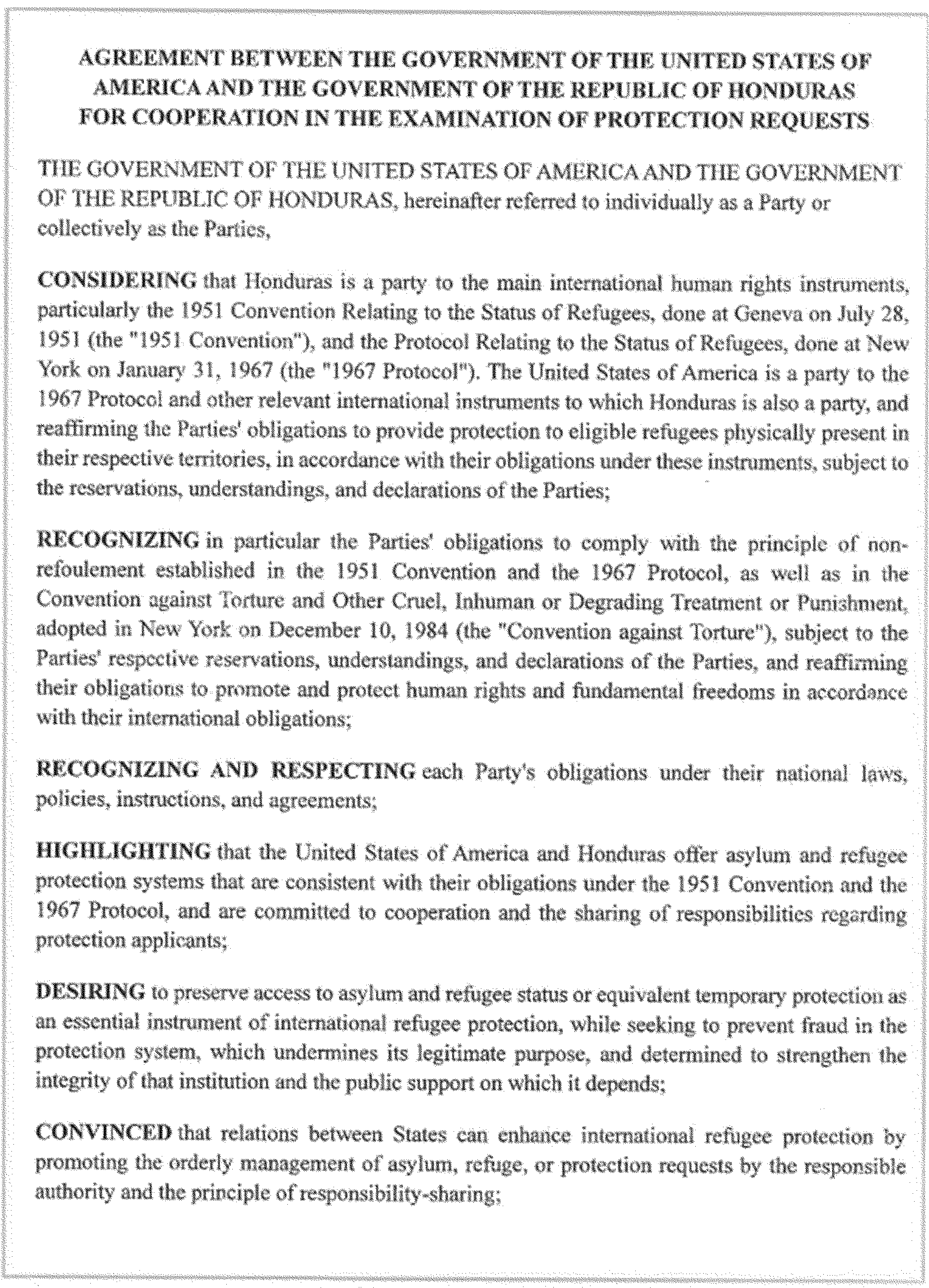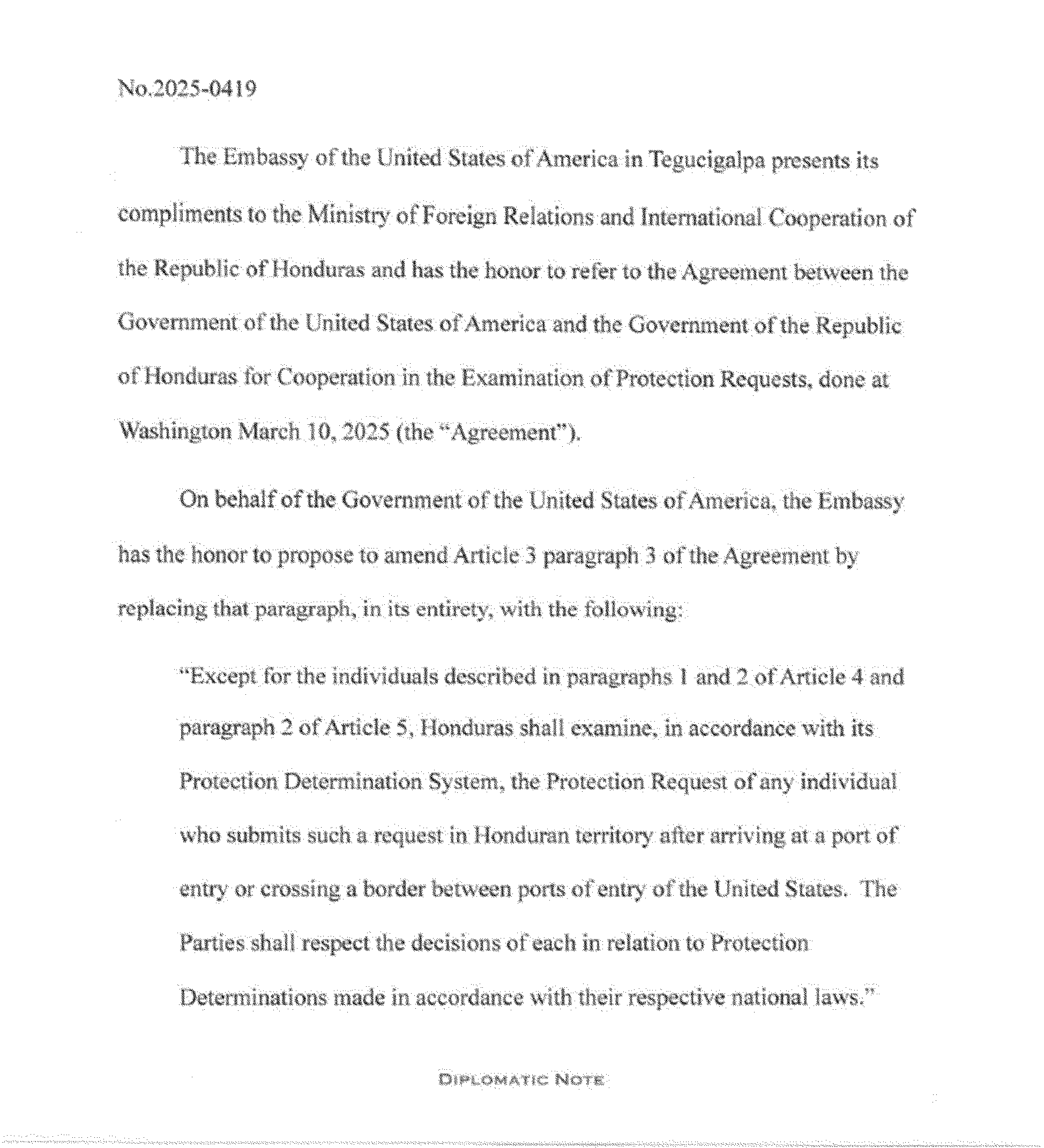 The Department of Homeland Security is publishing the Agreement Between the Government of the United States of America and the Government of the Republic of Honduras for Cooperation in the Examination of Protection Requests, signed at Washington on March 10, 2025 (the “Agreement”). DHS is also publishing an Amendment to the Agreement, which consists of diplomatic notes exchanged at Tegucigalpa on June 25, 2025. The text of the Agreement and the Amendment are set out below.
