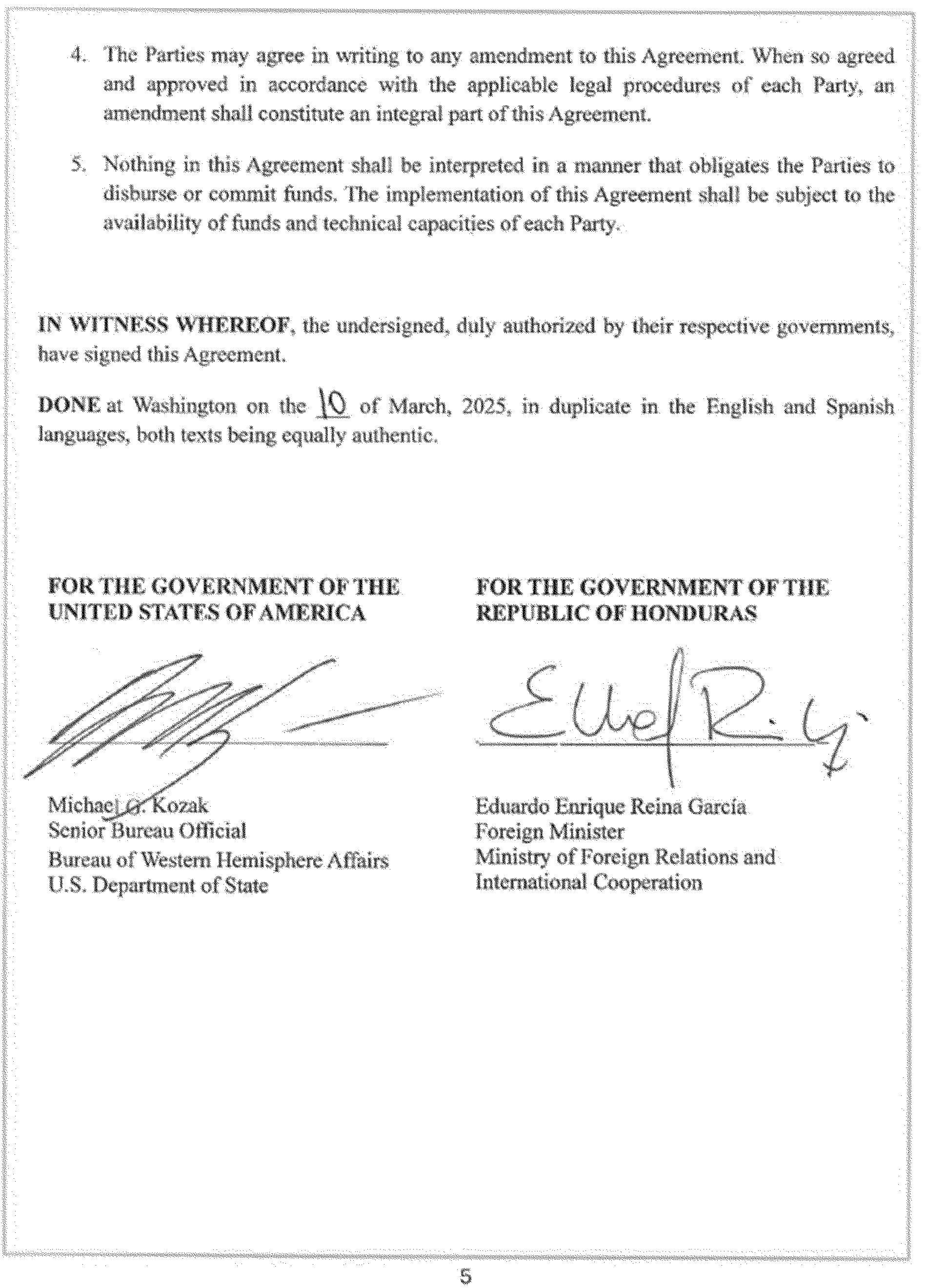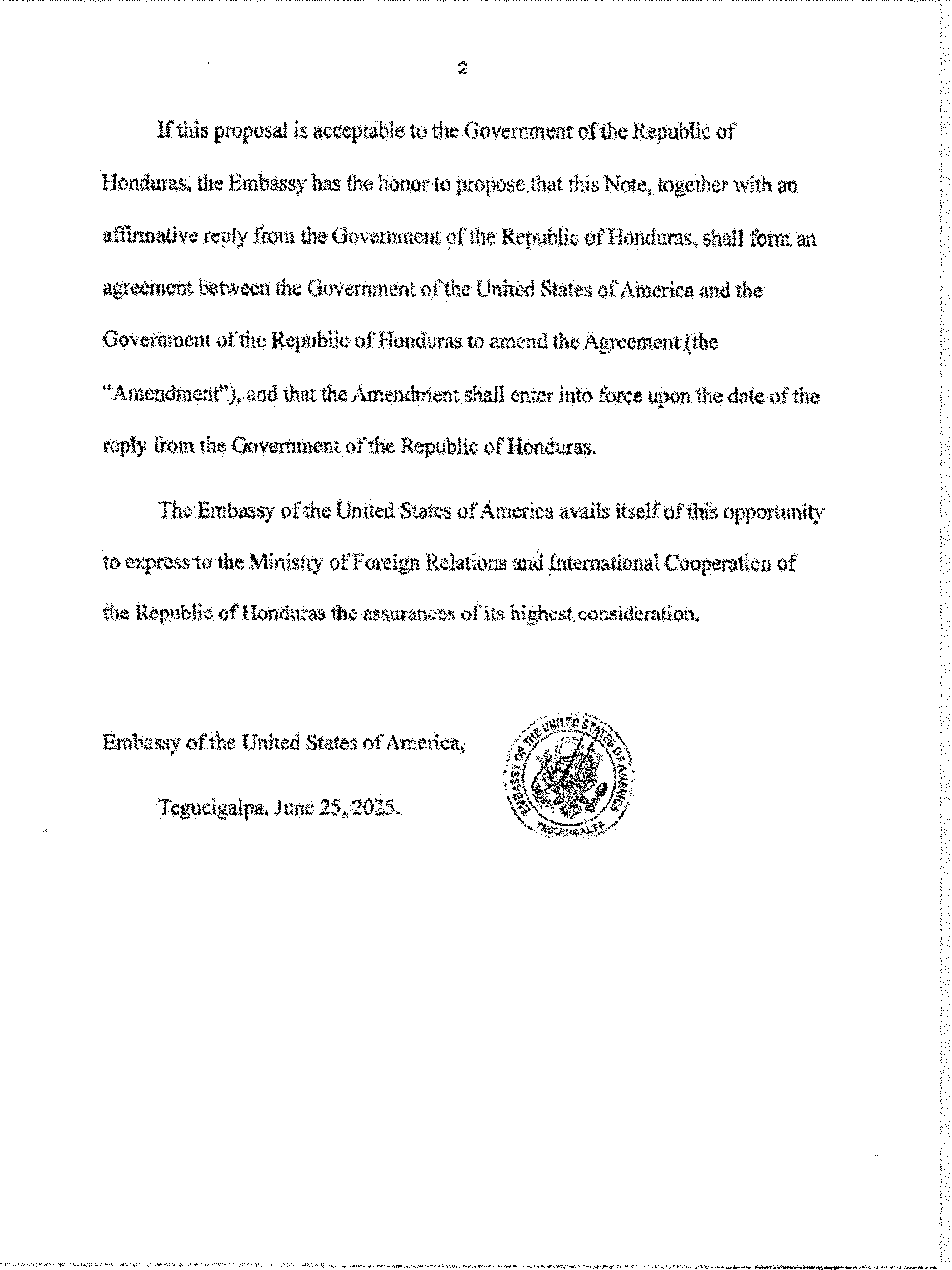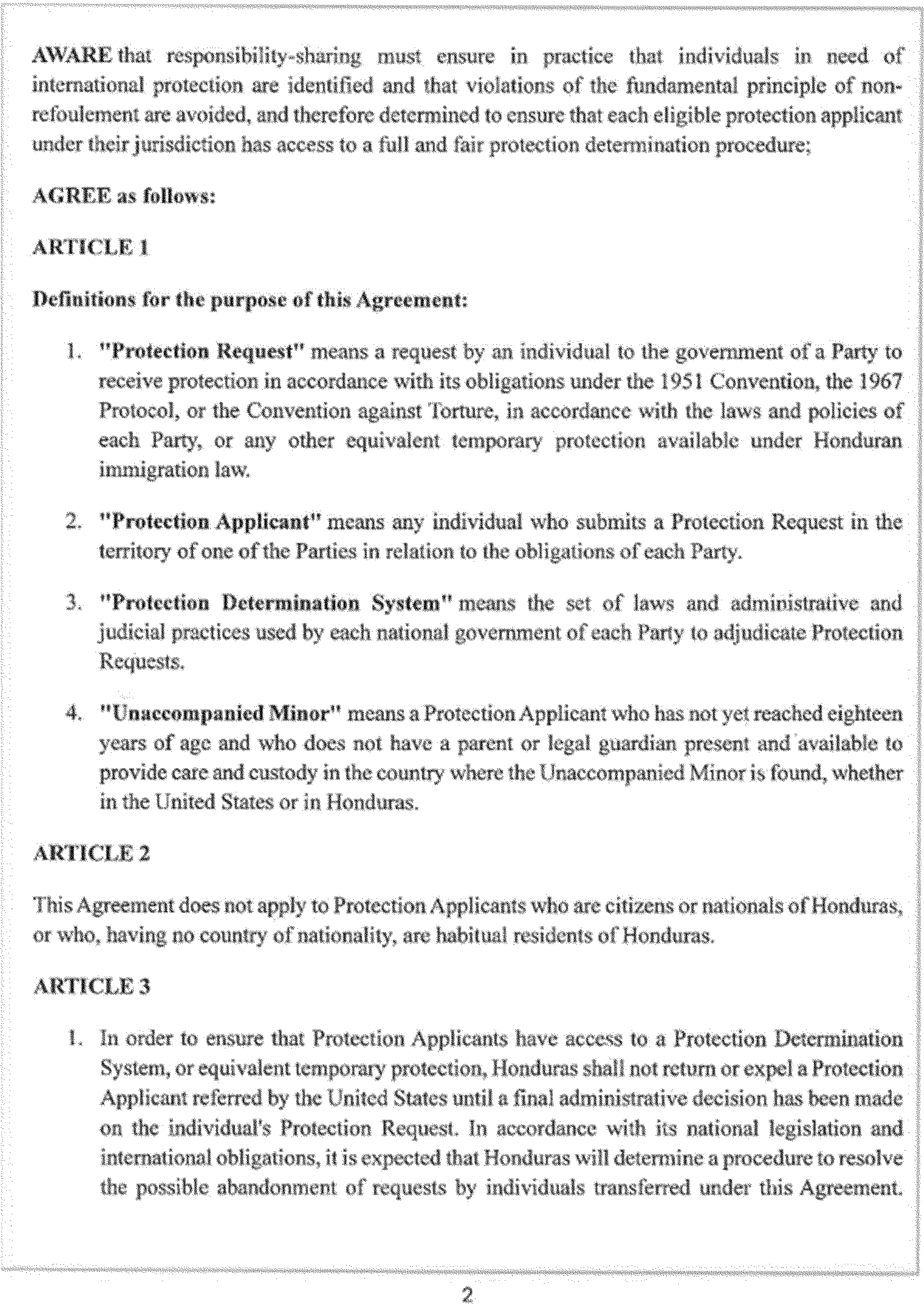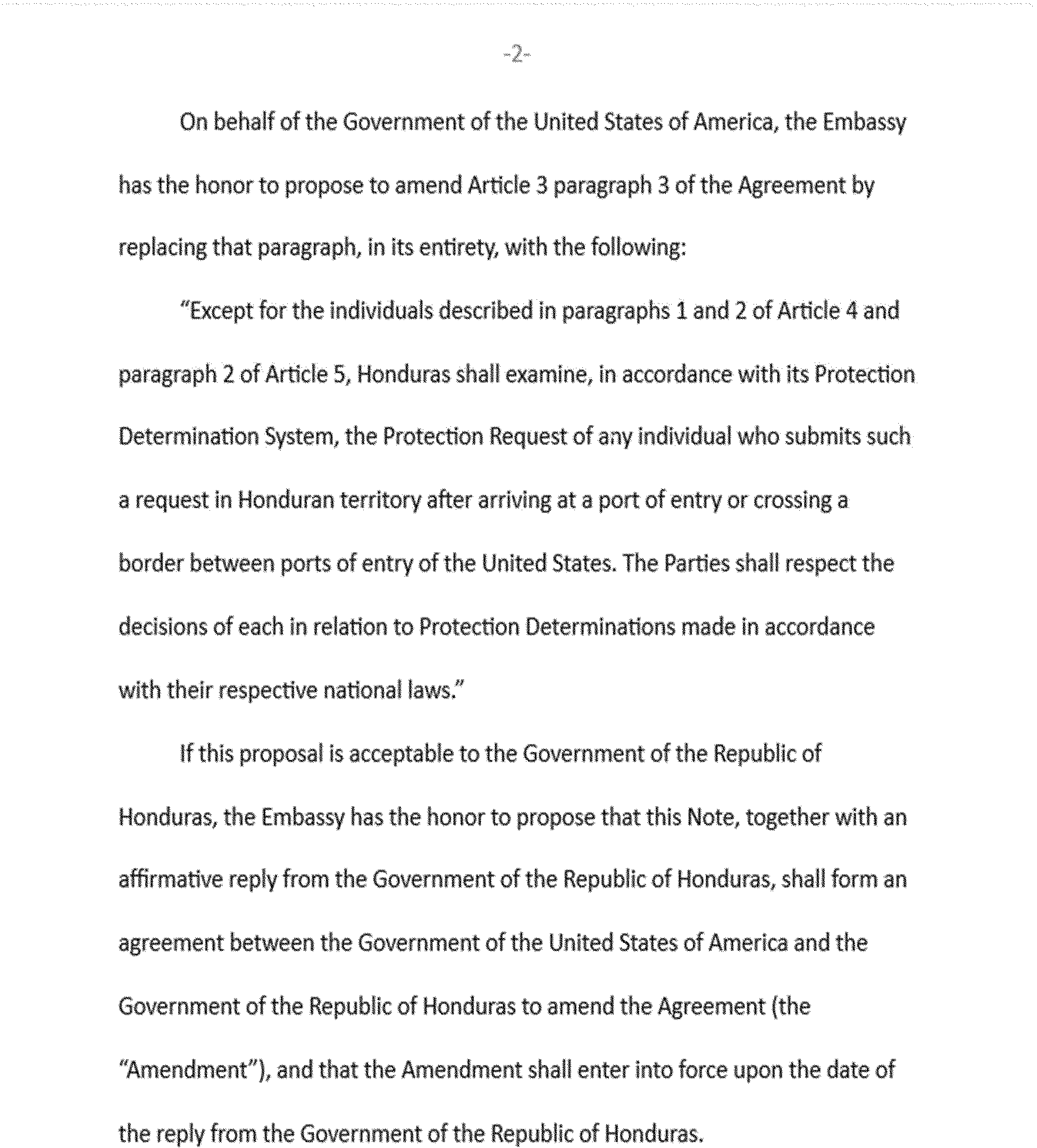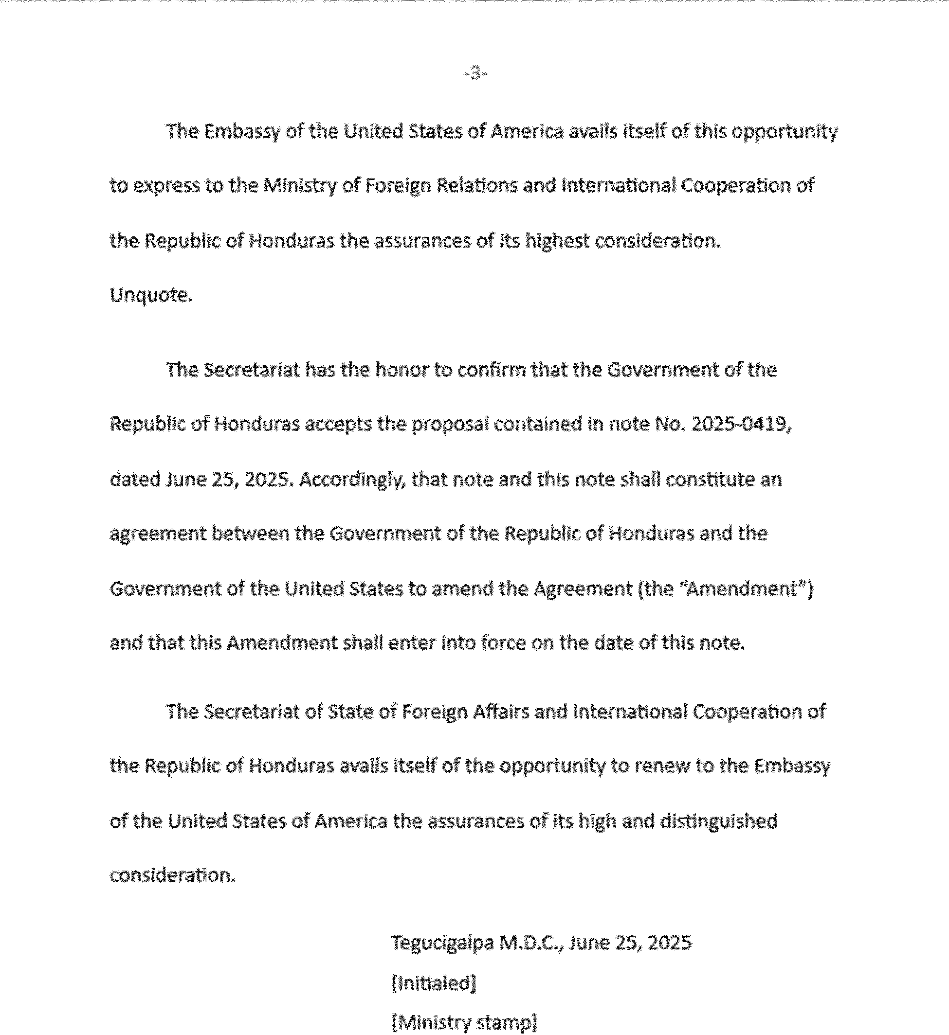 The Department of Homeland Security is publishing the Agreement Between the Government of the United States of America and the Government of the Republic of Honduras for Cooperation in the Examination of Protection Requests, signed at Washington on March 10, 2025 (the “Agreement”). DHS is also publishing an Amendment to the Agreement, which consists of diplomatic notes exchanged at Tegucigalpa on June 25, 2025. The text of the Agreement and the Amendment are set out below.