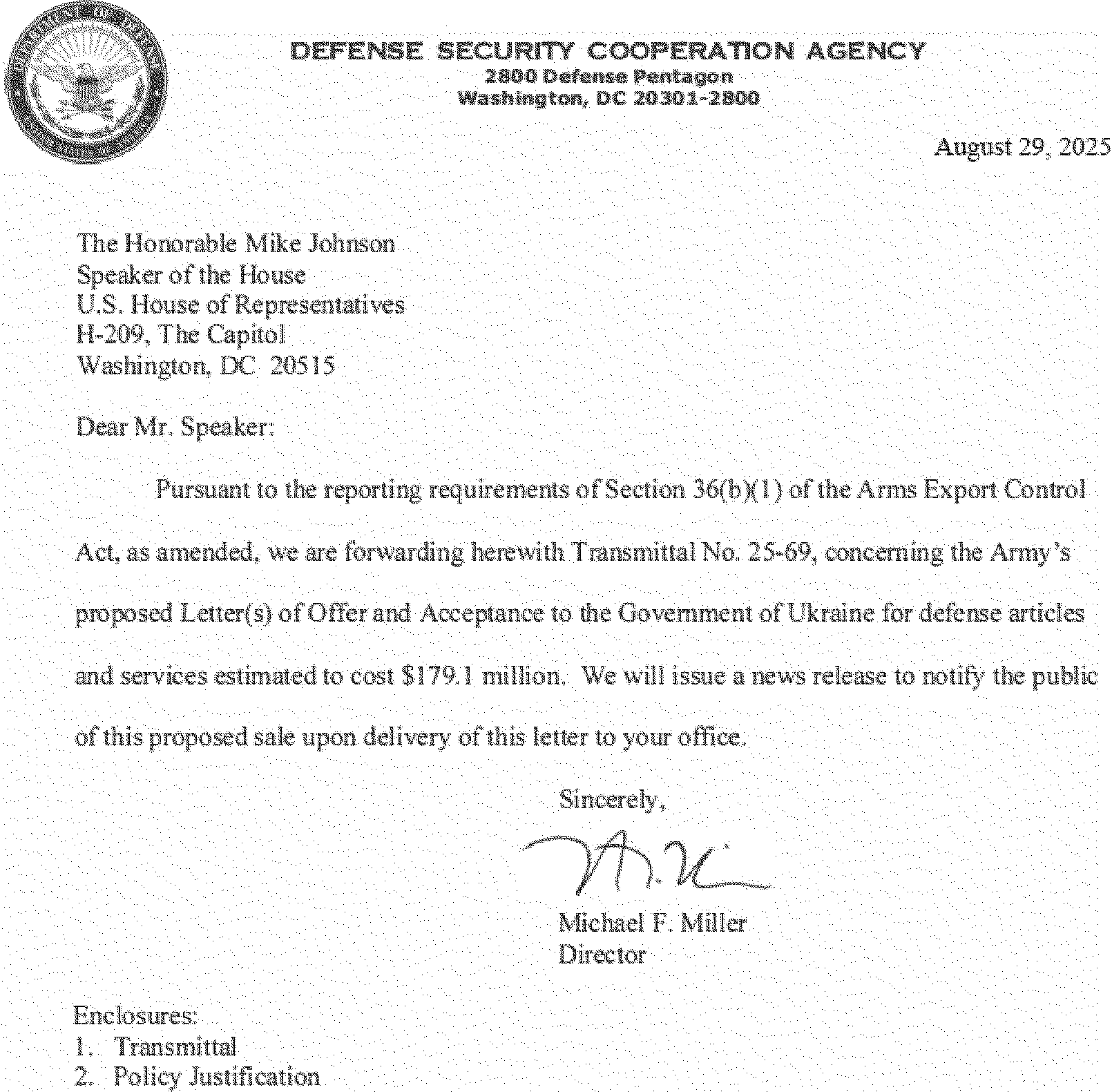 This 36(b) arms sales notification is published to fulfill the requirements of section 155 of Public Law 104-164 dated July 21, 1996. The following is a copy of a letter to the Speaker of the House of Representatives with attached Transmittal 25-69 and Policy Justification.