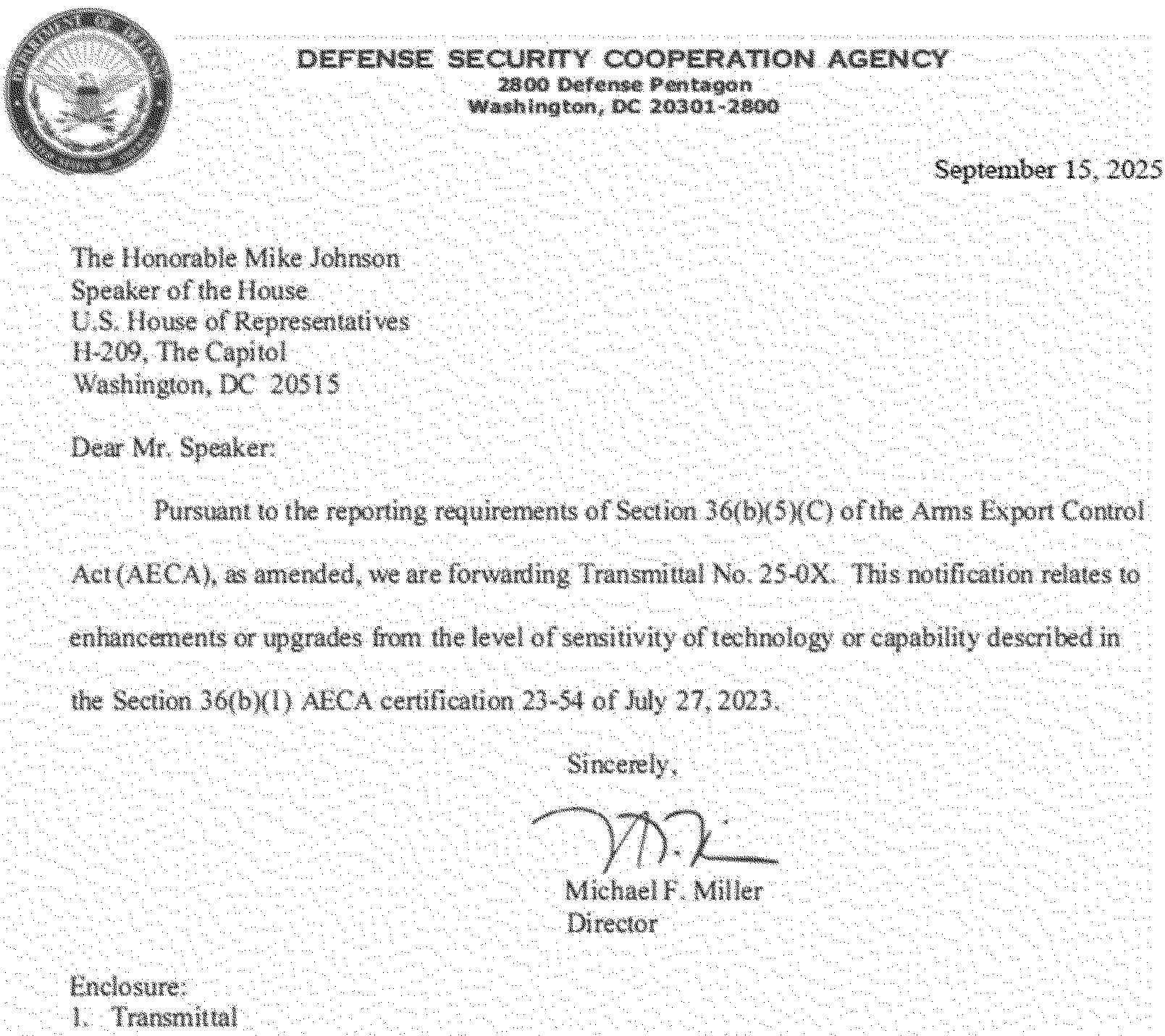 This 36(b) arms sales notification is published to fulfill the requirements of section 155 of Public Law 104-164 dated July 21, 1996. The following is a copy of a letter to the Speaker of the House of Representatives with attached Transmittal 25-0X.
