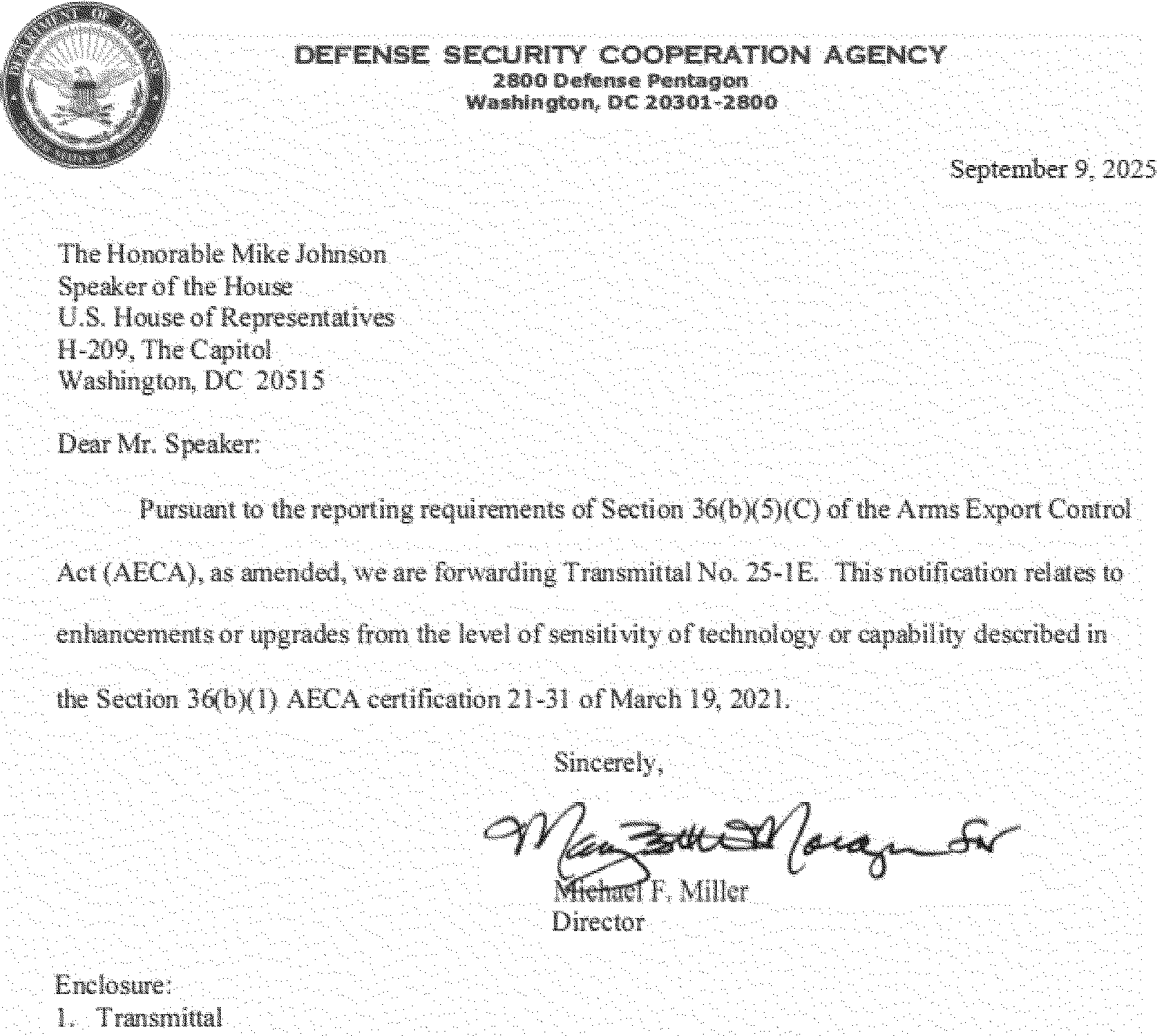 This 36(b) arms sales notification is published to fulfill the requirements of section 155 of Public Law 104-164 dated July 21, 1996. The following is a copy of a letter to the Speaker of the House of Representatives with attached Transmittal 25-1E.