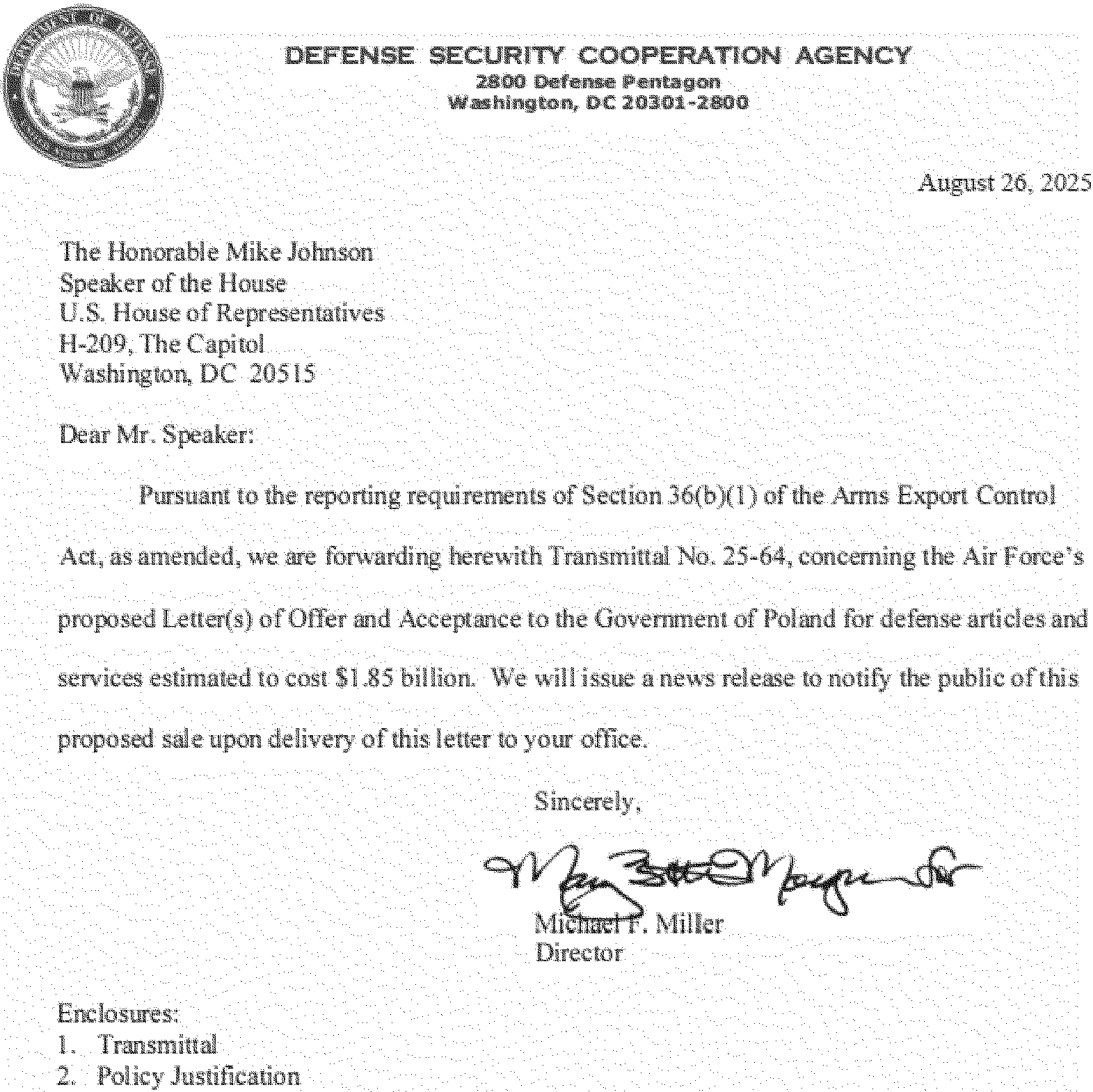This 36(b) arms sales notification is published to fulfill the requirements of section 155 of Public Law 104-164 dated July 21, 1996. The following is a copy of a letter to the Speaker of the House of Representatives with attached Transmittal 25-64 and Policy Justification.