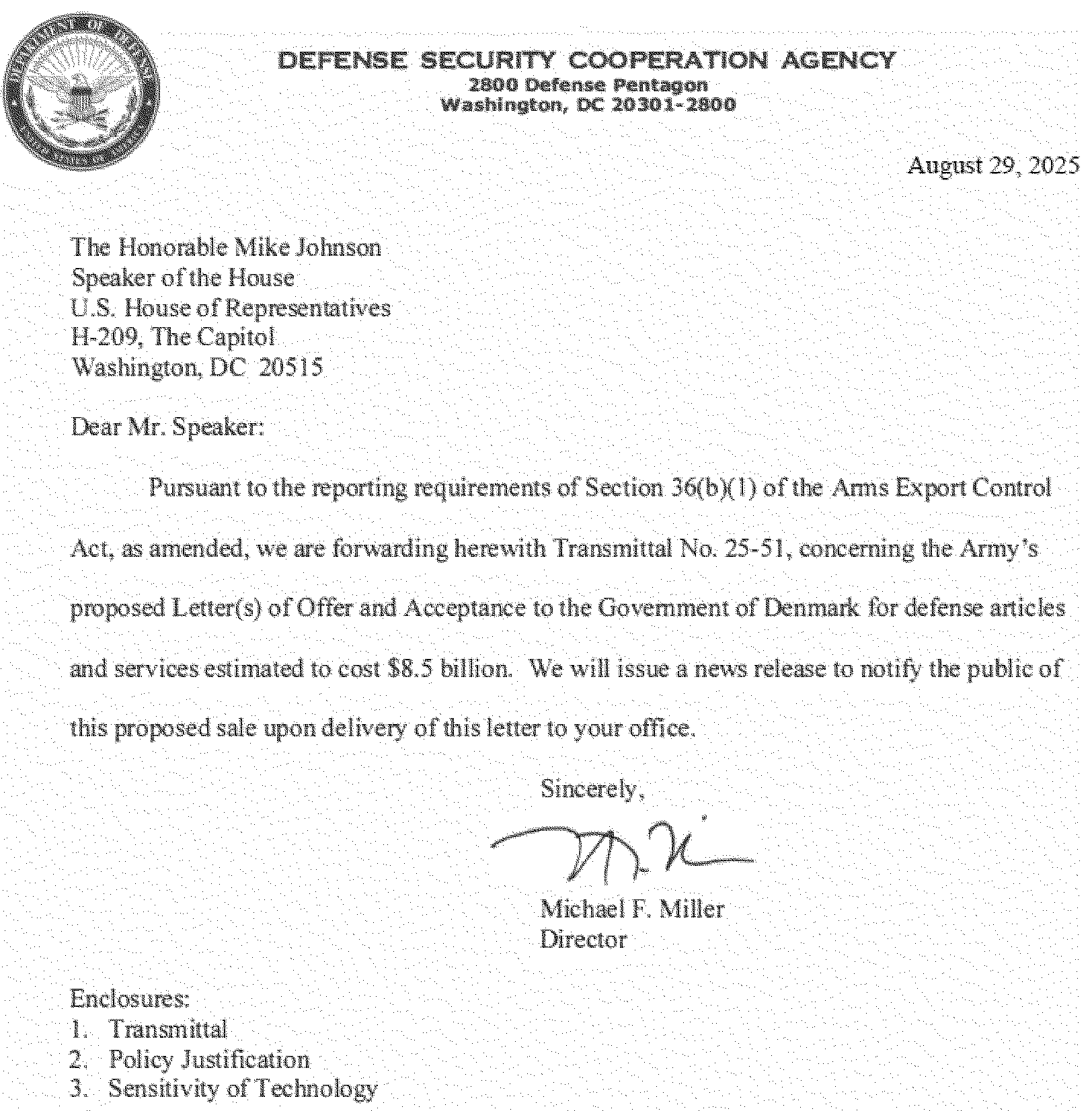 This 36(b) arms sales notification is published to fulfill the requirements of section 155 of Public Law 104-164 dated July 21, 1996. The following is a copy of a letter to the Speaker of the House of Representatives with attached Transmittal 25-51, Policy Justification, and Sensitivity of Technology.