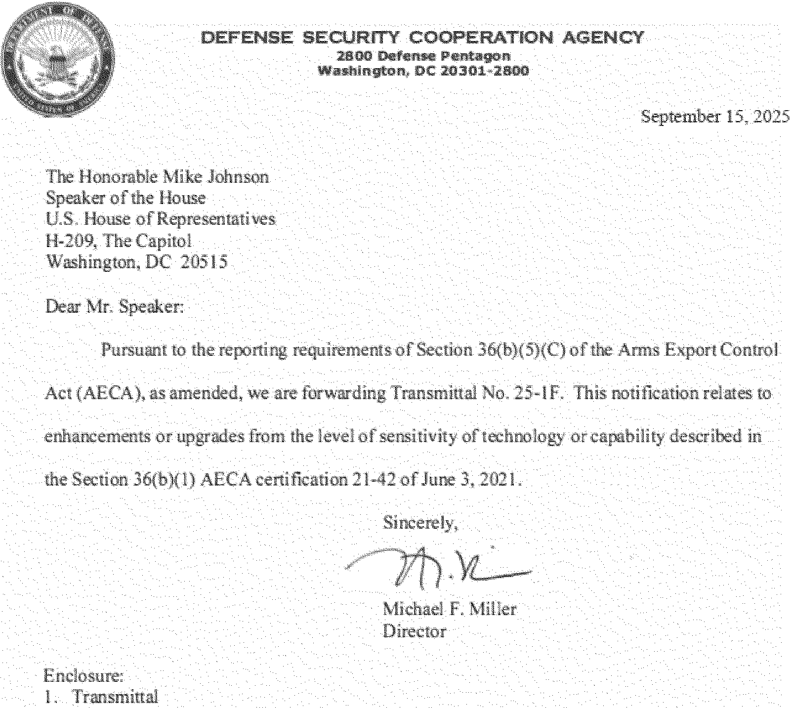 This 36(b) arms sales notification is published to fulfill the requirements of section 155 of Public Law 104-164 dated July 21, 1996. The following is a copy of a letter to the Speaker of the House of Representatives with attached Transmittal 25-1F.