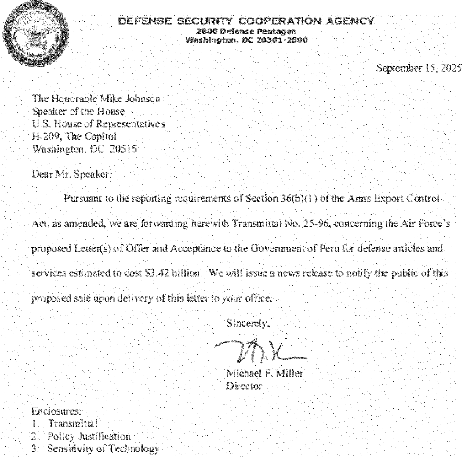 The Government of Peru has requested to buy ten (10) F-16C Block 70 aircraft; two (2) F-16D Block 70 aircraft; fourteen (14) F110-GE-129 engines (12 installed, 2 spares); fourteen (14) Improved Programmable Display Generators (12 installed, 2 spares); twelve (12) AIM-120C-8 Advanced Medium Range Air-to-Air Missiles (AMRAAM); fifty-two (52) LAU-129 guided missile launchers (48 installed, 4 spares); twelve (12) M61A1 anti-aircraft guns; fourteen (14) Embedded Global Positioning System Inertial Navigation Systems (12 installed, 2 spares); fourteen (14) AN/APG-83 active electronically scanned array Scalable Agile Beam Radars (12 installed, 2 spares); fourteen (14) Modular Mission Computers 7000AH (or next generation mission computer equivalent) (12 installed, 2 spares); twelve (12) AIM-9X Block II Sidewinder missiles; two (2) AIM-9X Block II Sidewinder tactical guidance units; one (1) AIM-9X Block II Sidewinder Captive Air Training Missile (CATM) guidance unit; two (2) AIM-9X Block II Sidewinder CATMs; and fourteen (14) Multifunctional Information Distribution System-Joint Tactical Radio Systems (12 installed, 2 spares). The following non-MDE items will also be included: Infrared Search and Track systems; missile warning systems; AN/ALQ-254 Viper Shield or equivalent electronic warfare systems; AN/AAQ-28 Litening targeting pods; Cartridge Actuated Devices/Propellant Actuated Devices (CAD/PAD); AIM-120C-8 AMRAAM CATMs; Joint Helmet Mounted Cueing Systems II (JHMCS II) helmet-mounted displays; ammunition; cartridges, chaffs, and flares; weapons support equipment; embedded communications security devices; AN/ALE-47 airborne countermeasures dispenser systems; countermeasure processors, sequencer switching units, and Control Display Units; AN/APX-127 advanced identification friend or foe or equivalent; AN/ARC-238 radios; KIV-78A and KY-58M cryptographic devices; AN/PYQ-10 Simple Key Loaders; night vision devices (NVD) and NVD intensifier tubes; ADU-890 and ADU-891 adaptor group computer test sets; Joint Mission Planning System; pylons, launcher adapters, weapon interfaces, and bomb and ejection racks; fuel tanks; Precision Measurement Equipment Laboratory (PMEL) and calibration support; Common Munitions Built-in-Test Reprogramming Equipment; targeting systems; spare and repair parts, consumables, and accessories; repair and return support; aircraft, engine, ground, and pilot life support equipment; classified and unclassified computer program identification number systems; classified and unclassified software and software support; classified and unclassified publications, manuals, and technical documentation; National Geospatial-Intelligence Agency (NGA) maps and mapping data; personnel training and training equipment, simulators, and training devices; studies and surveys; facilities and construction support transportation, ferry, and fuel support; U.S. Government and contractor engineering, technical, and logistics support services; and other related elements of logistics and program support. The estimated total cost is $3.42 billion.