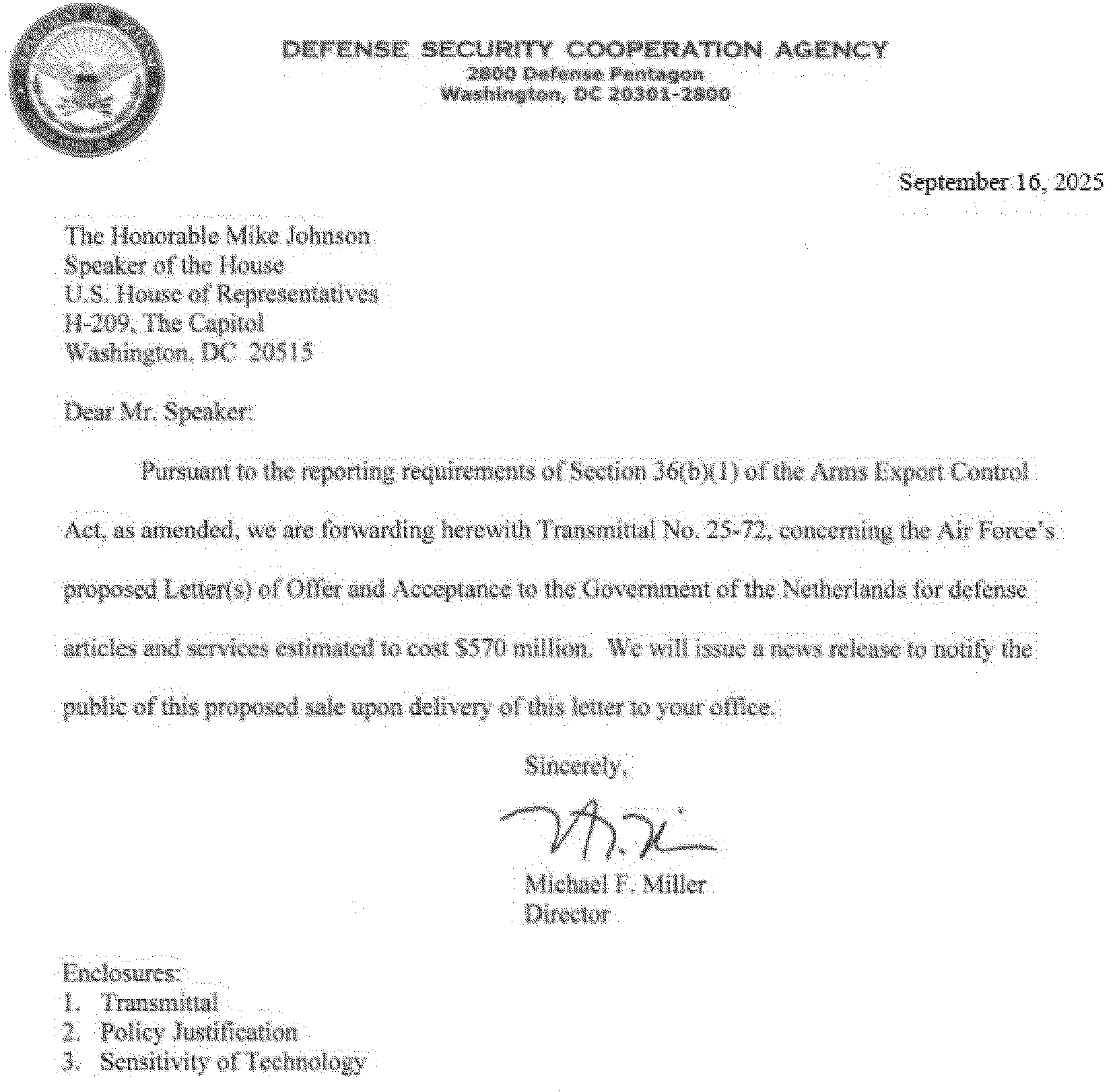 This 36(b) arms sales notification is published to fulfill the requirements of section 155 of Public Law 104-164 dated July 21, 1996. The following is a copy of a letter to the Speaker of the House of Representatives with attached Transmittal 25-72, Policy Justification, and Sensitivity of Technology.
