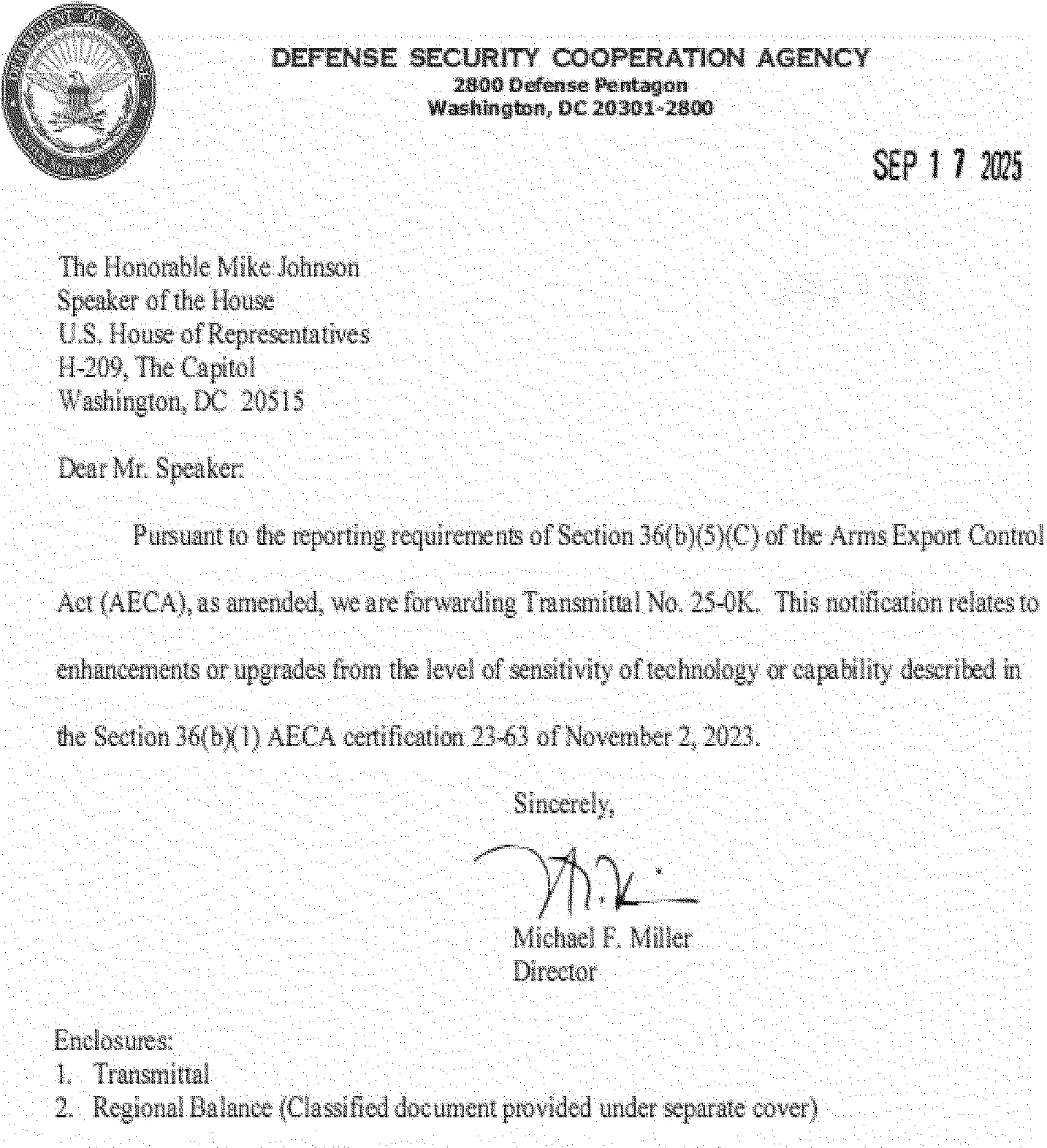 This 36(b) arms sales notification is published to fulfill the requirements of section 155 of Public Law 104-164 dated July 21, 1996. The following is a copy of a letter to the Speaker of the House of Representatives with attached Transmittal 25-0K.