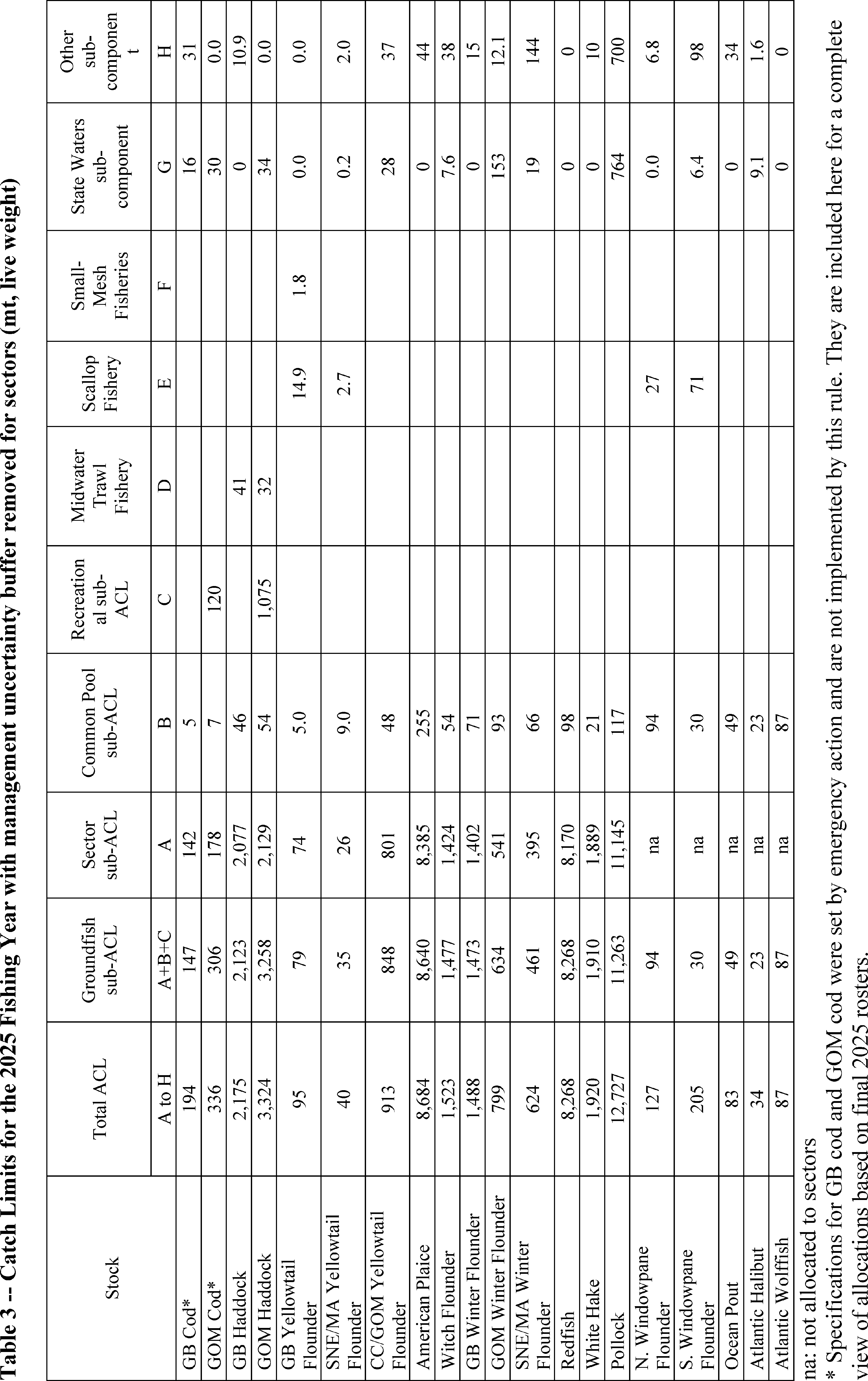 This rule adopts catch limits for GOM haddock, American plaice, witch flounder, pollock, and Atlantic halibut for the 2025-2027 fishing years; GB yellowtail flounder for the 2025-2026 fishing years; and GB haddock for the 2025 fishing year. Specifications are projected for fishing years 2026 and 2027 and will be considered and reaffirmed or changed in a future action. Fishing year 2025 catch limits for other groundfish stocks were previously projected by Framework 65 (88 FR 56527; August 18, 2023) and Framework 66 (89 FR 35755; May 2, 2024), and this rule reaffirms those catch limits. The catch limits implemented in this action, including overfishing limits (OFL), ABCs, and annual catch limits (ACL), are listed in tables 2 through 8. A summary of how these catch limits were developed, including the distribution to the various fishery components, was provided in the proposed rule and in appendix II (Calculation of Northeast Multispecies Annual Catch Limits, FY 2025-FY 2027) to the EA, and is not repeated here.